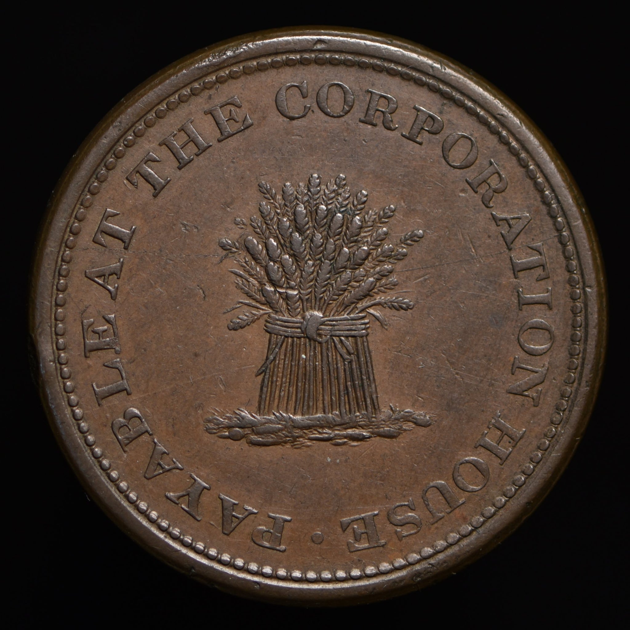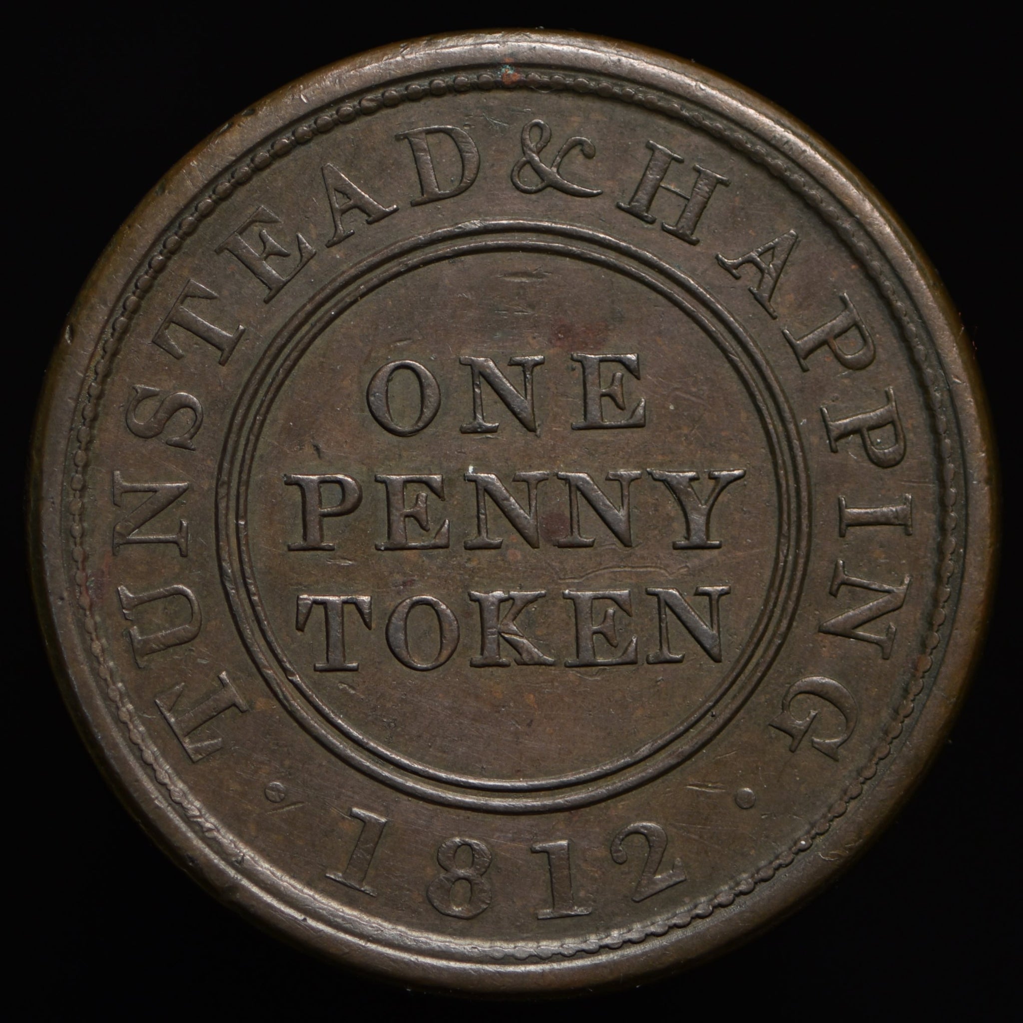 Obv: ONE PENNY TOKEN in center double circle, TUNSTEAD & HAPPING around, 1812 below. Rev: A Wheatsheaf, PAYABLE AT THE CORPORATION HOUSE around. Edge: Center grained.