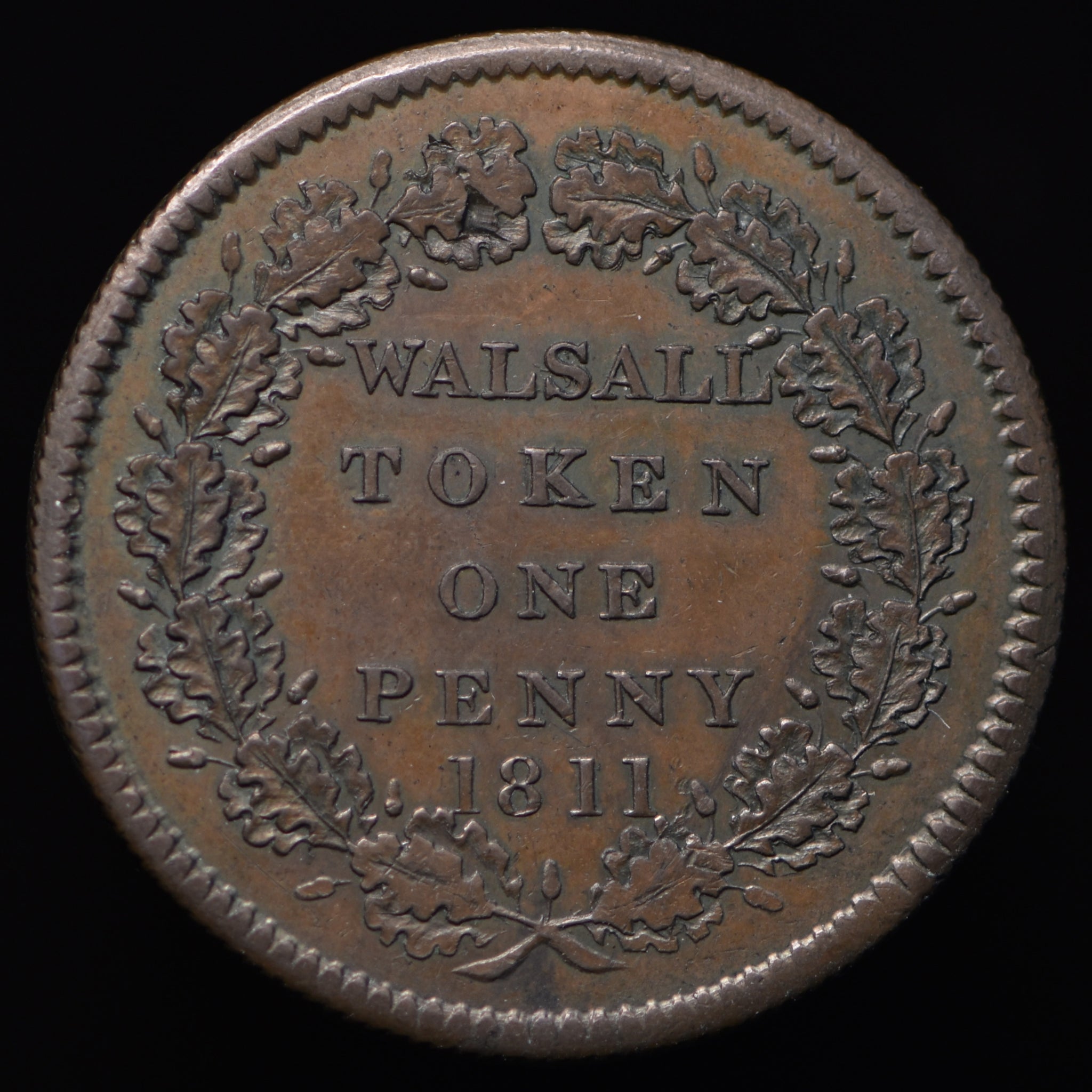 Obv: View of St. Matthew's Church, WTF on ground to right of path, PAYABLE BY FLETCHER & SHARRATT around. Rev: WALSALL TOKEN ONE PENNY 1811 in five lines within oak wreath. Edge: Neatly grained.