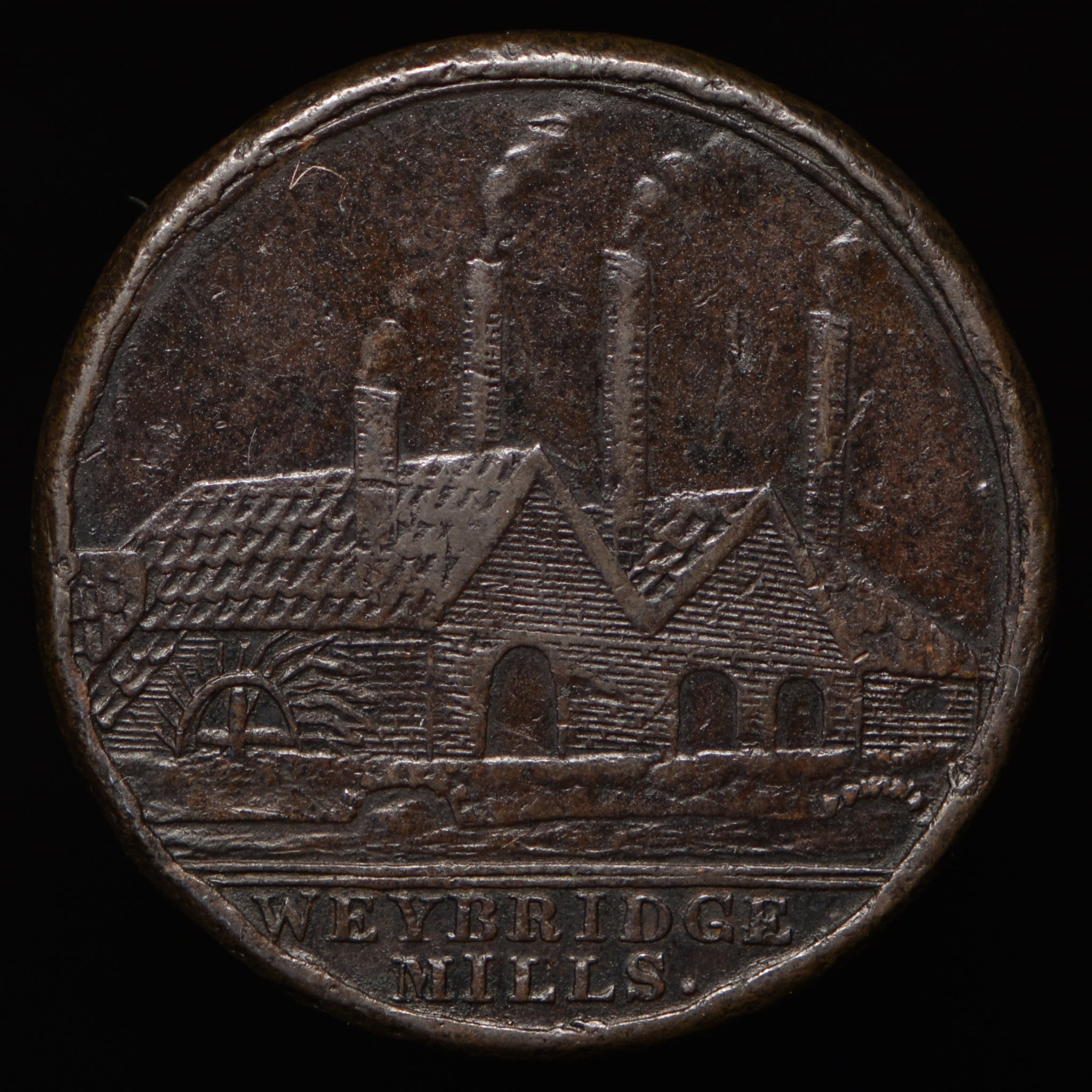 Obv: ONE PENNY PAYABLE AT WEYBRIDGE 1 BUNN & CO. 1812 in six lines in center, HOOP & IRON WAREHOUSE DOWGATE WHARF around. Rev: View of the iron works, WEYBRIDGE MILLS in two lines in exergue. Edge: Neatly grained.