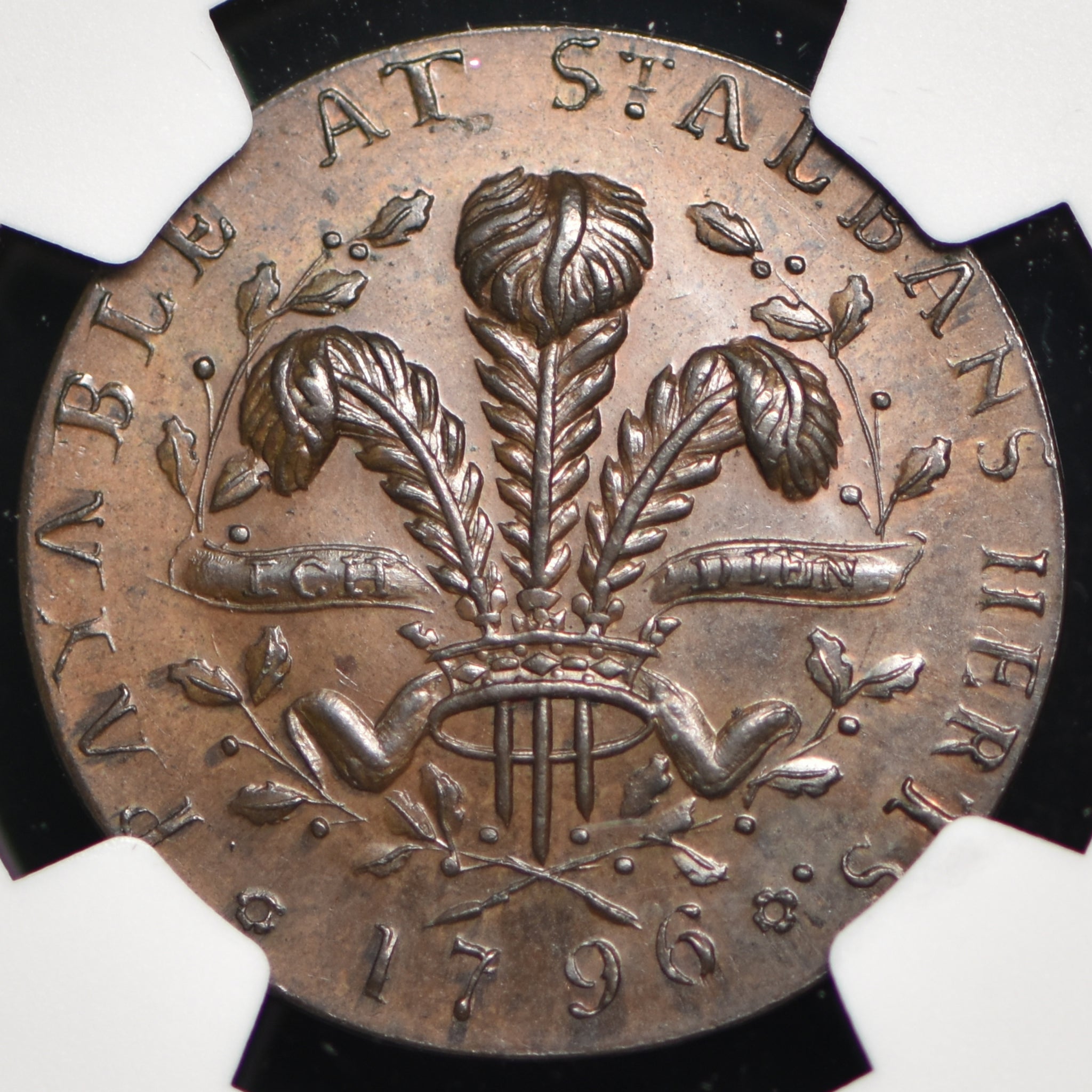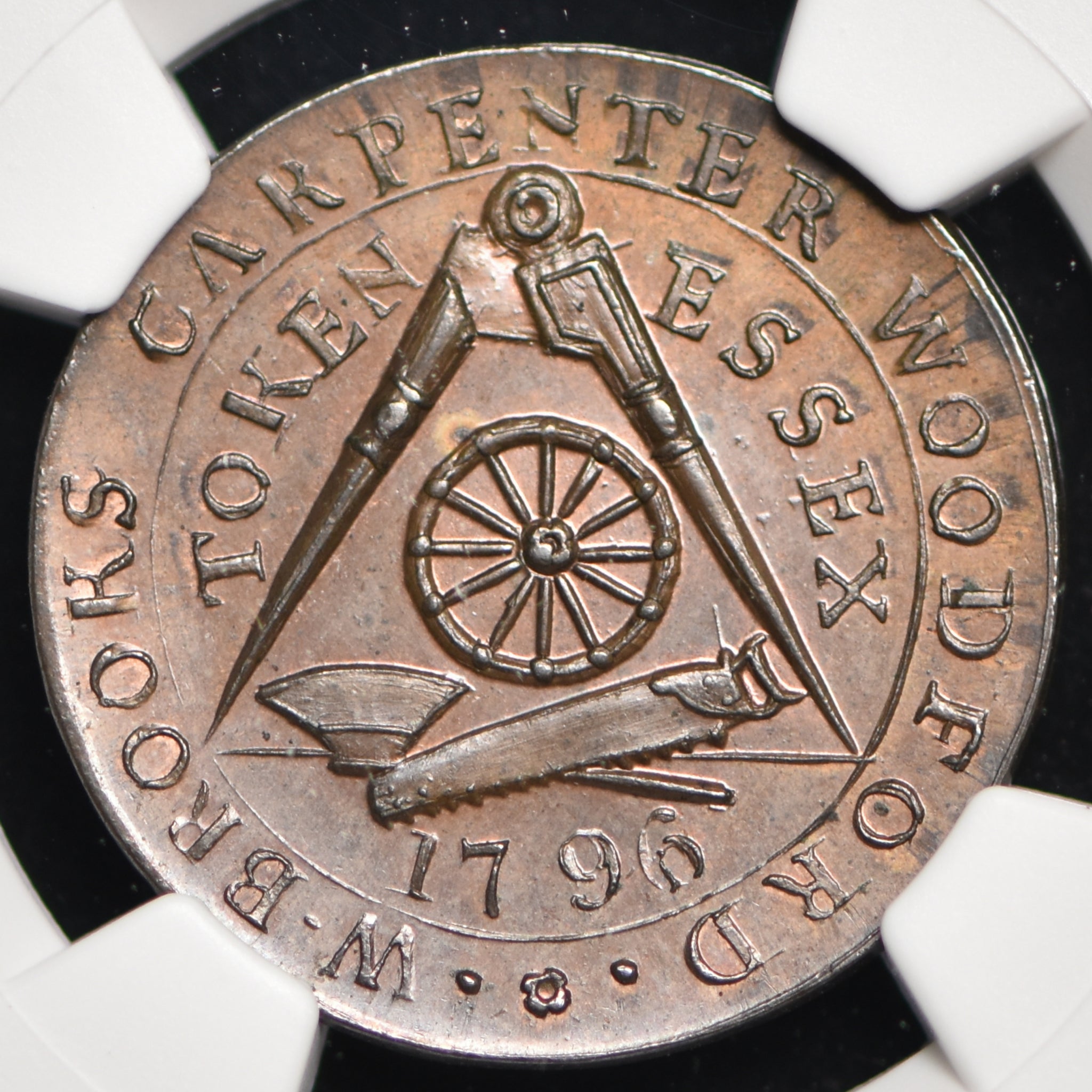 Obv: A pair of compasses, wheel, saw, and axe. TOKEN ESSEX 1796 within circle, W. BROOKS CARPENTER WOODFORD around. Rev: The Plumes of the Prince of Wales, oak leaf wreath as border, PAYABLE AT ST ALBANS HERTS around, 1796 below. Edge: Plain.