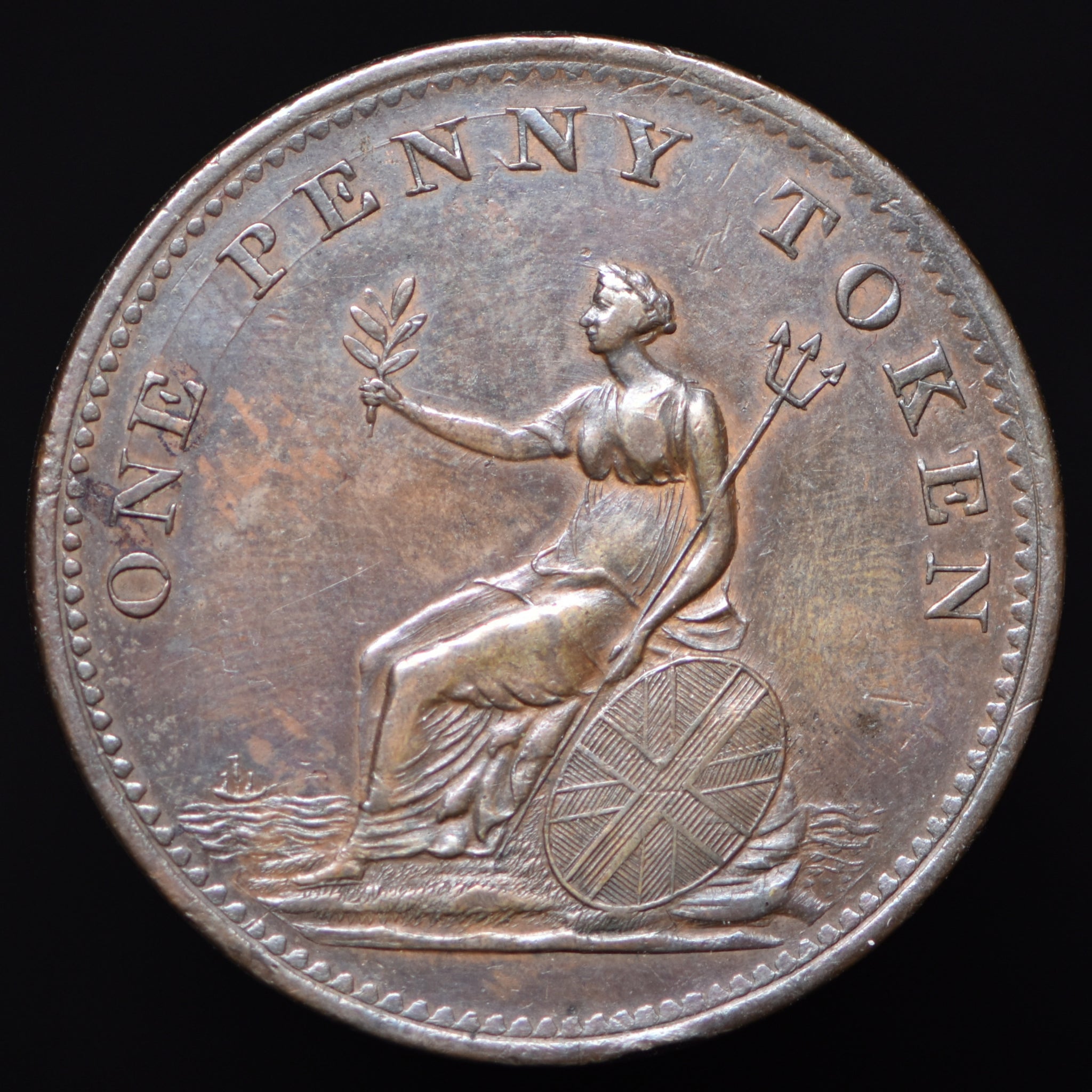 Obv: Bust of Wellington with the star of the order of the garter, FIELD MARSHAL WELLINGTON around, 1813 below. Rev: Britannia seated, holding olive branch and trident, ONE PENNY TOKEN around. Edge: Center grained.
