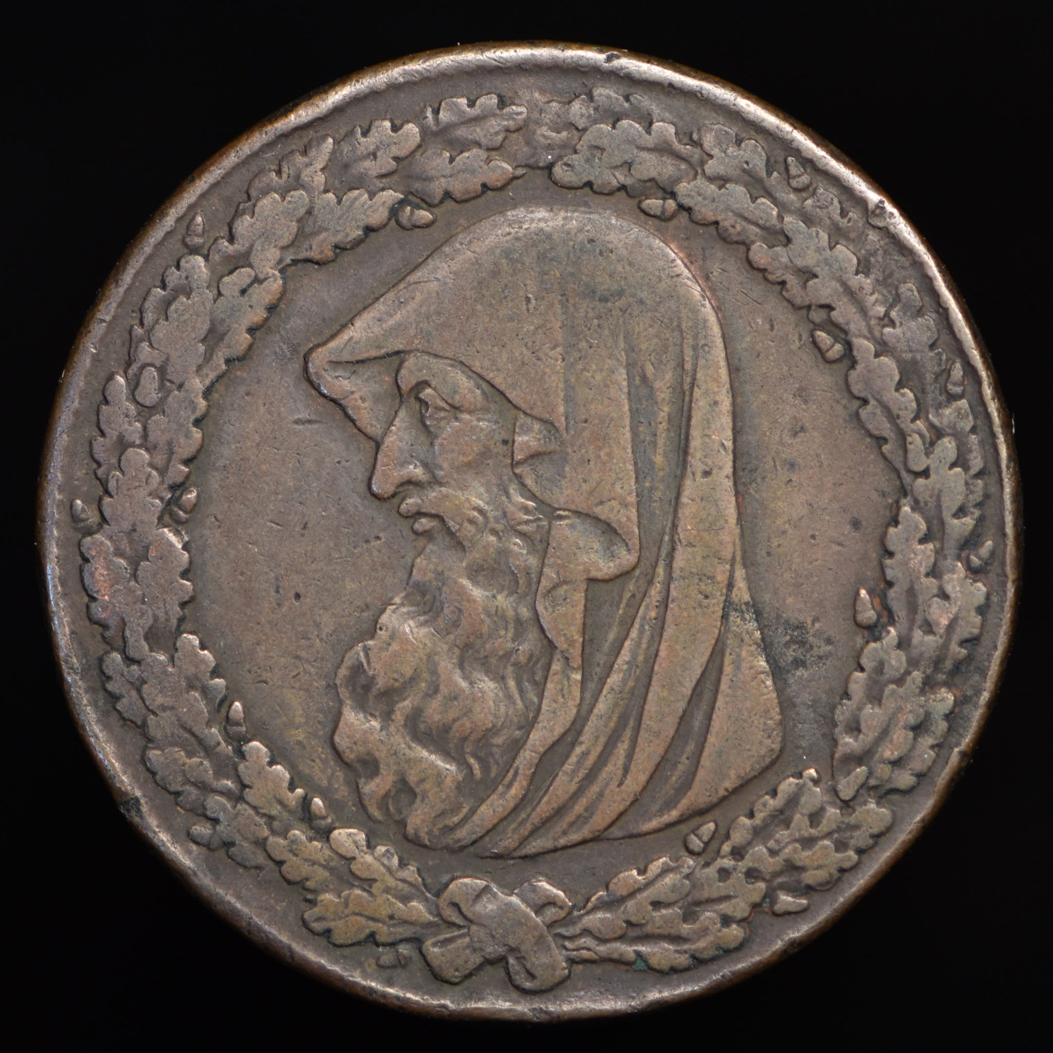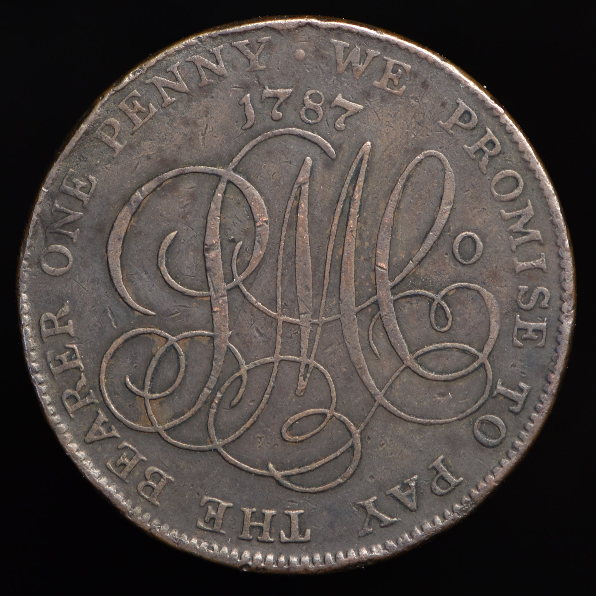 Obv: Druids head bordered by oak wreath. Rev: A cypher P M Co, 1787 above, WE PROMISE TO PAY THE BEARER ONE PENNY around. Edge: ON DEMAND IN LONDON LIVERPOOL OR ANGLESEY.