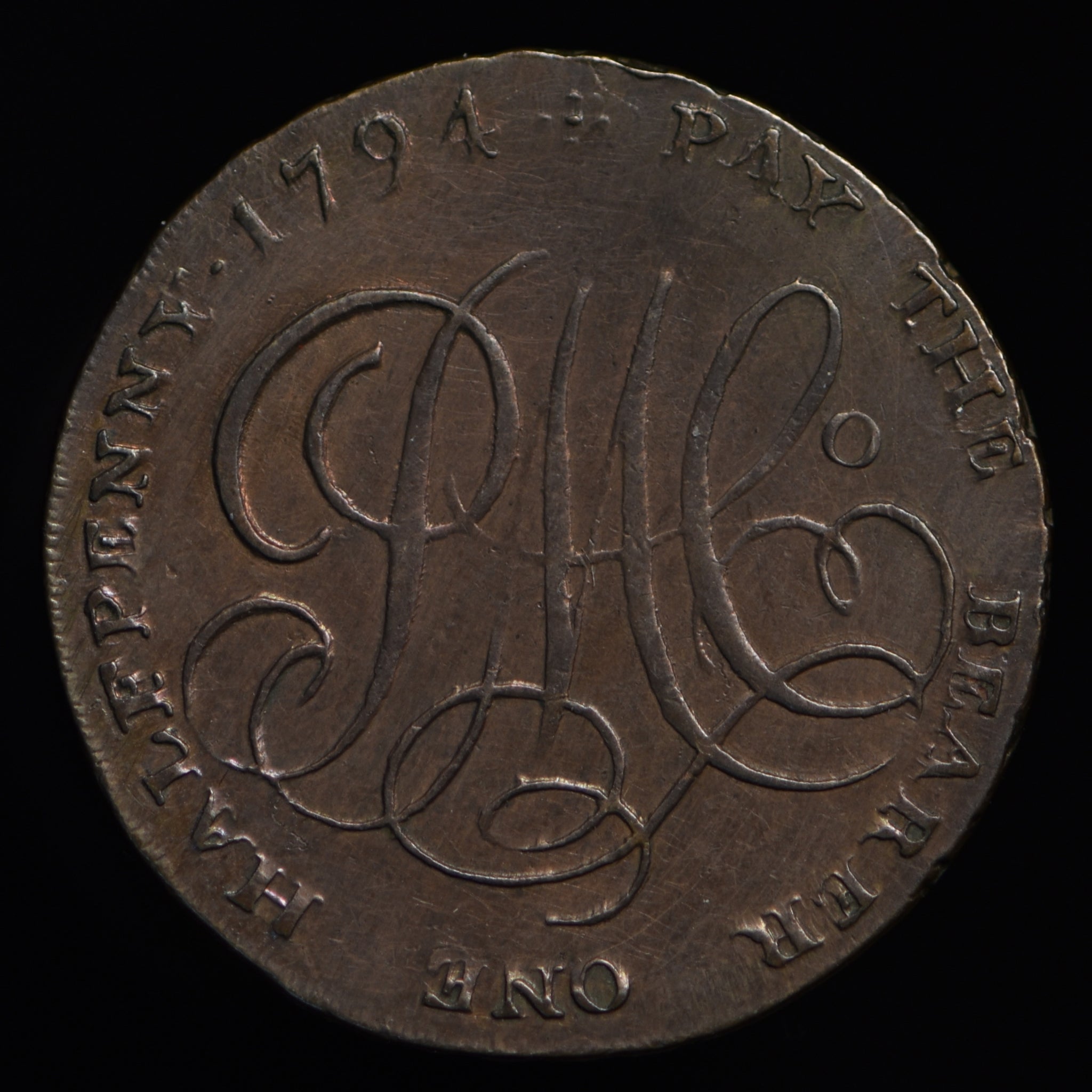 Obv: Druids head bordered by oak wreath. Rev: A cypher P M Co, PAY THE BEARER ONE HALFPENNY 1794 around. Edge: PAYABLE IN LANCASTER LONDON OR BRISTOL.