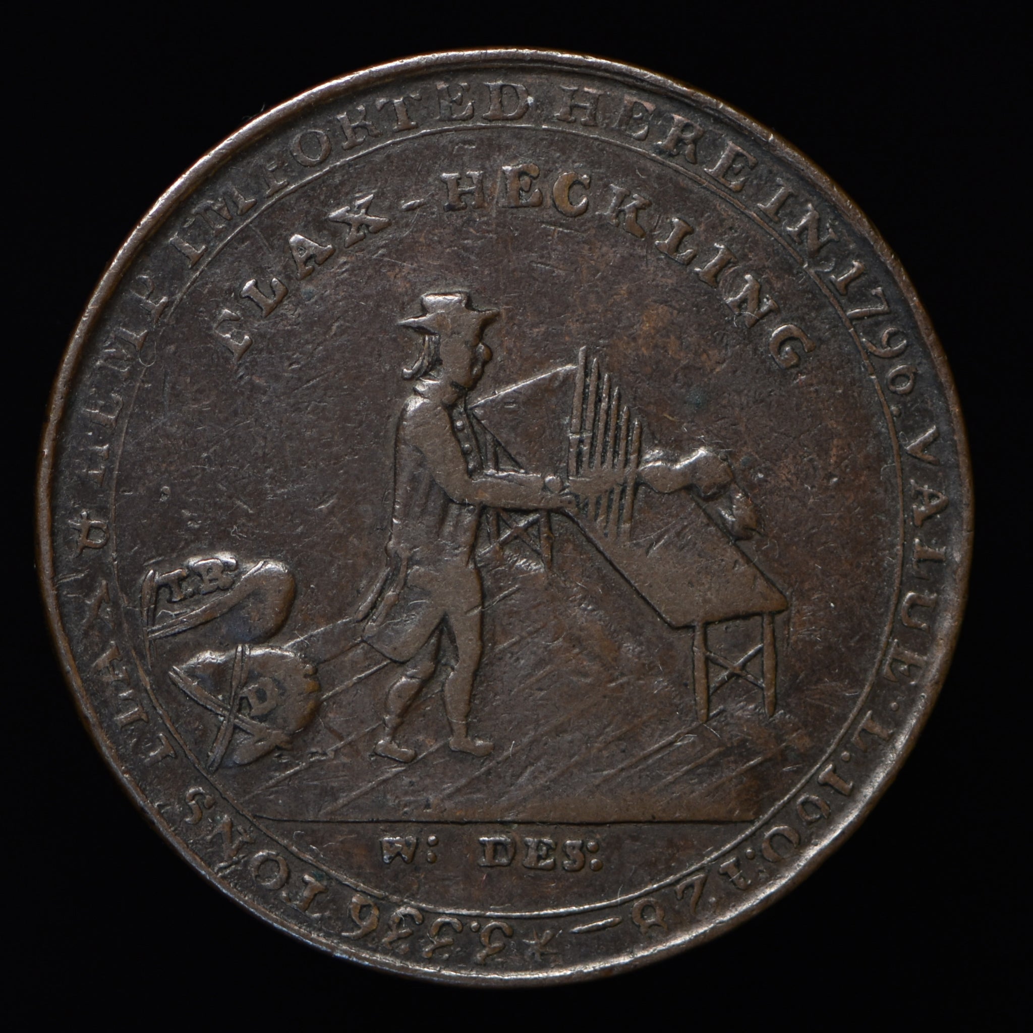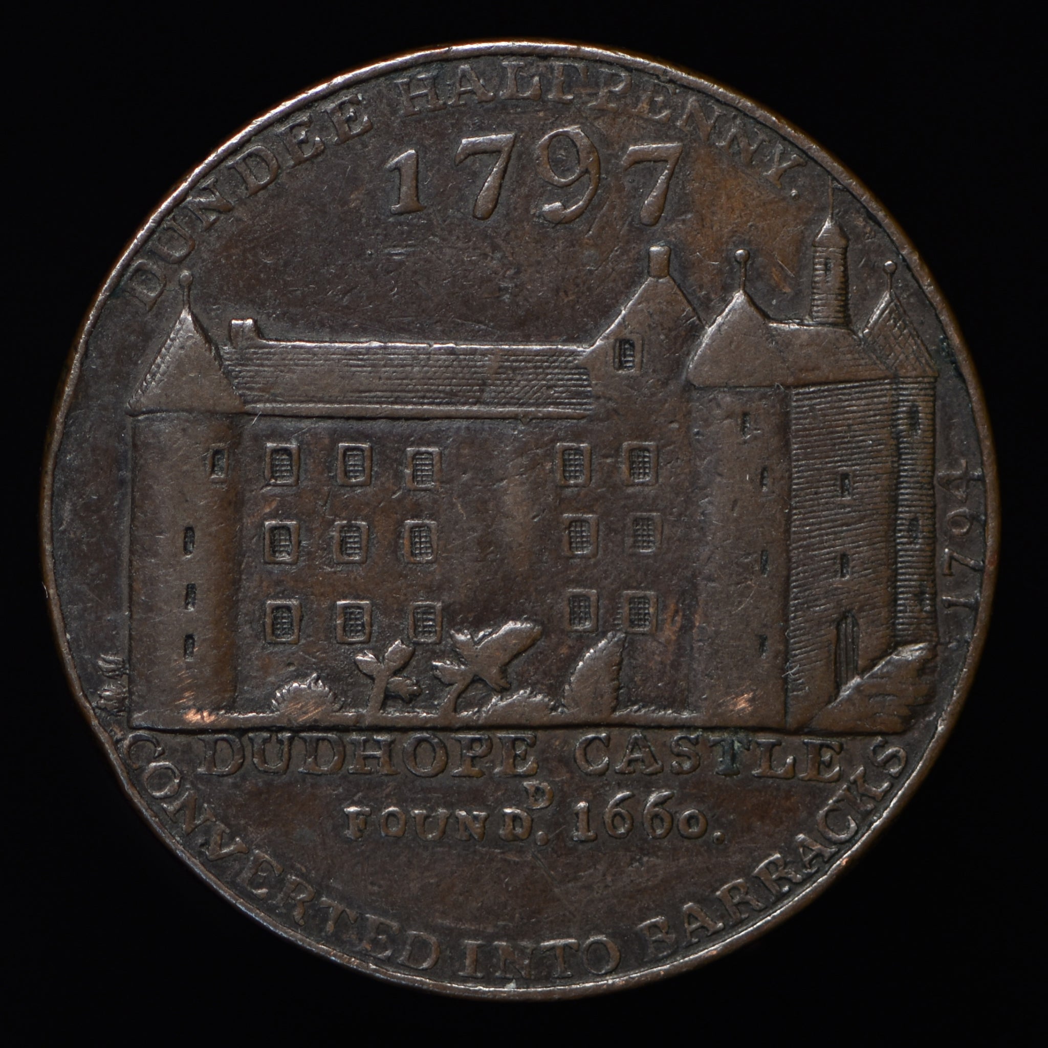 Obv: An ancient fortress, DUNDEE HALFPENNY 1797 above, CONVERTED INTO BARRACKS 1794 below, DUDHOPE CASTLE FOUND.D 1660. in exergue. Rev: A man working flax, FLAX-HECKLING above, W : DES : below, 3336 TONS FLAW & HEMP IMPORTED HERE IN 1796 & c. around. Edge: Plain.