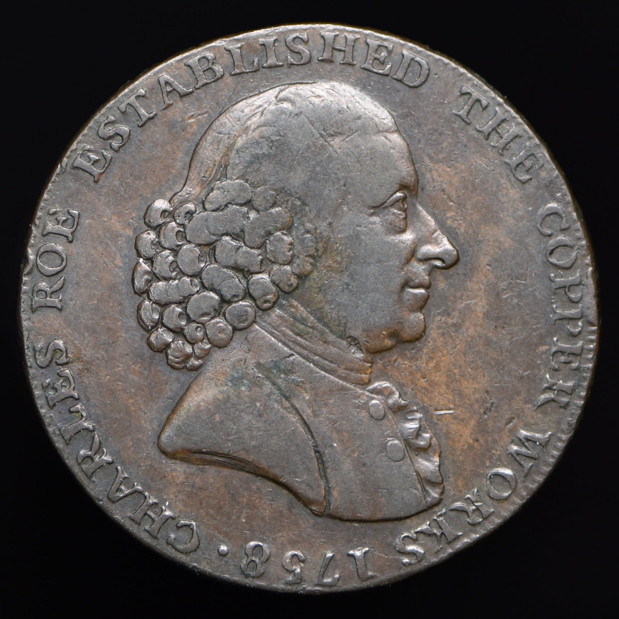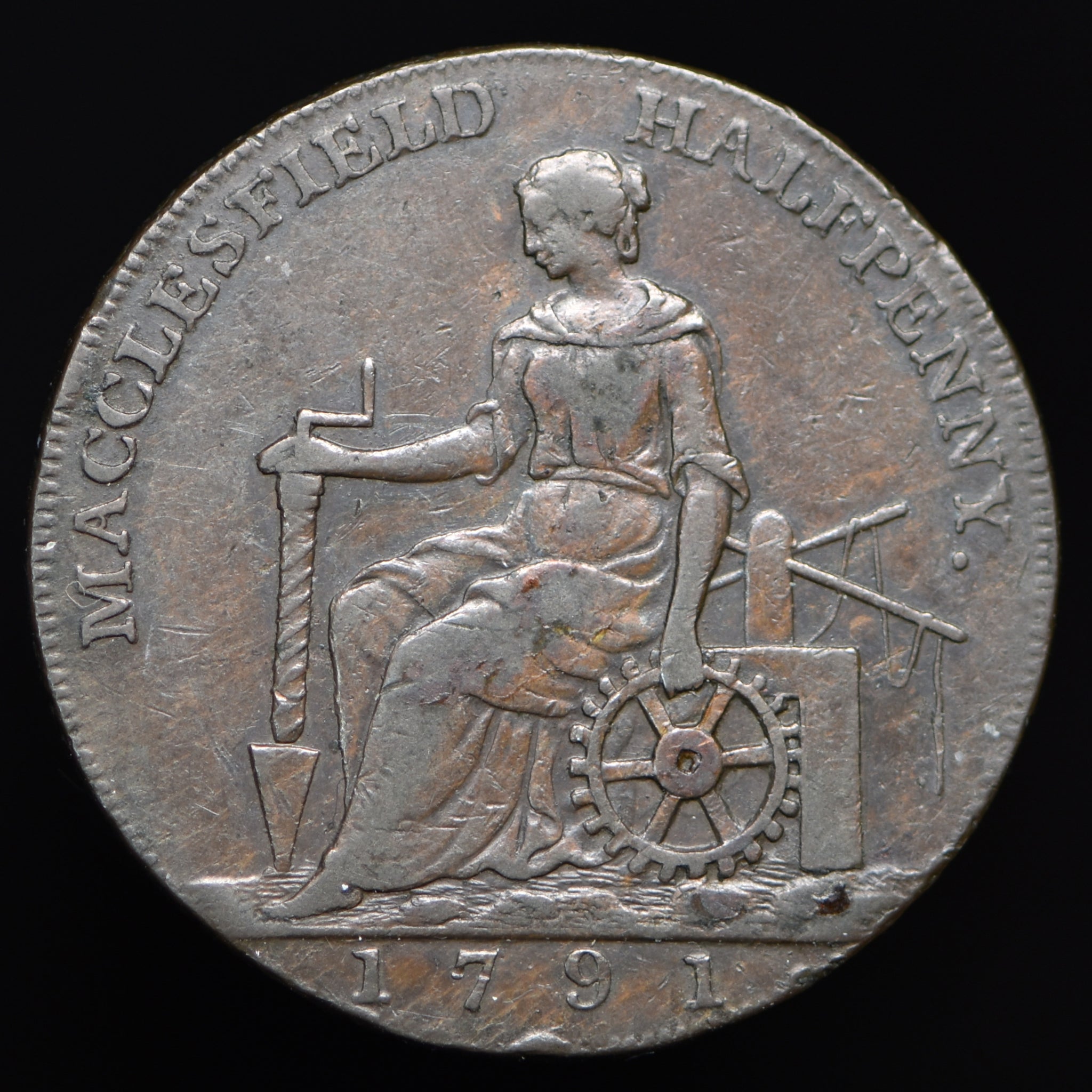 Obv: Bust of Charles Roe, CHARLES ROE ESTABLISHED THE COPPER WORKS 1758 around. Rev: Woman seated with mining tools, MACCLESFIELD HALFPENNY. (around), 1791 in exergue. Edge: PAYABLE AT MACCLESFIELD LIVERPOOL OR CONGLETON.