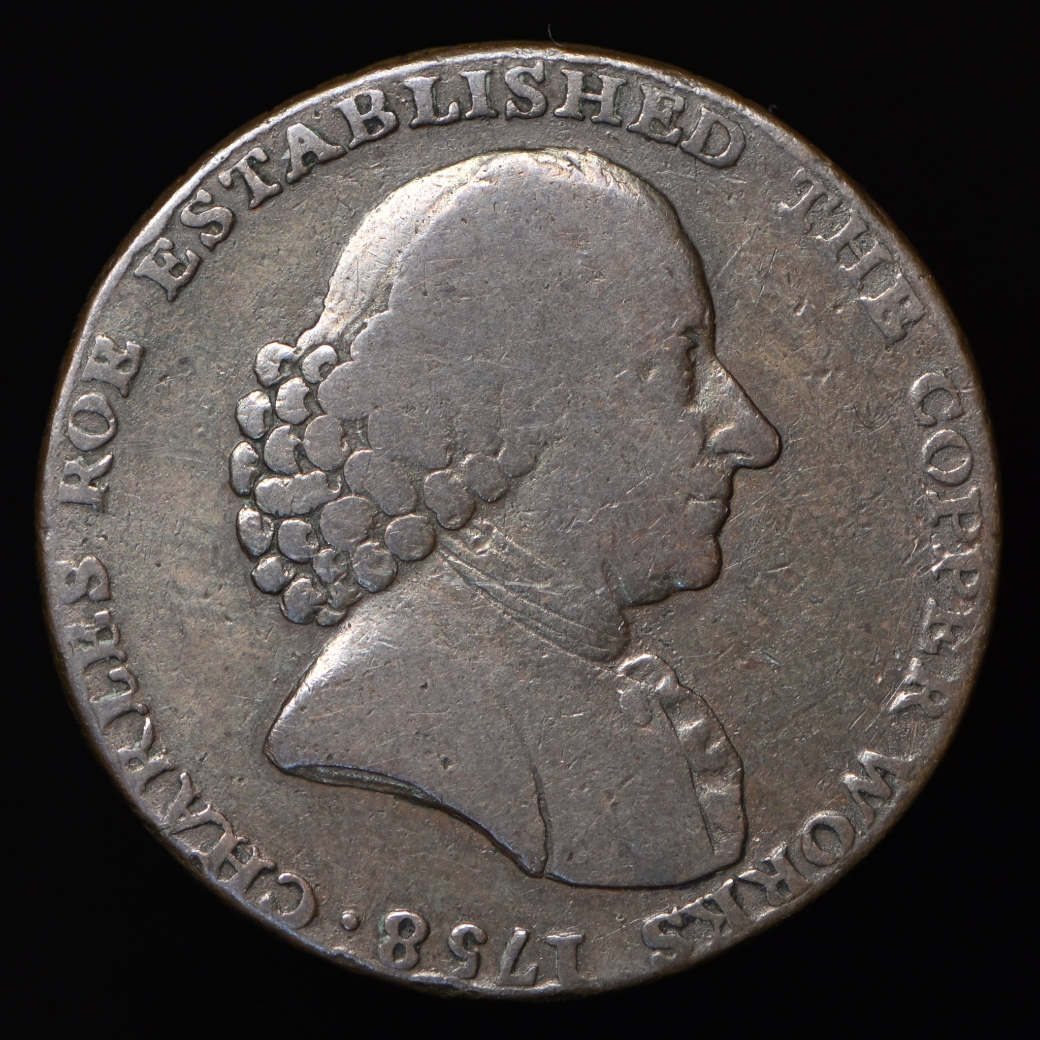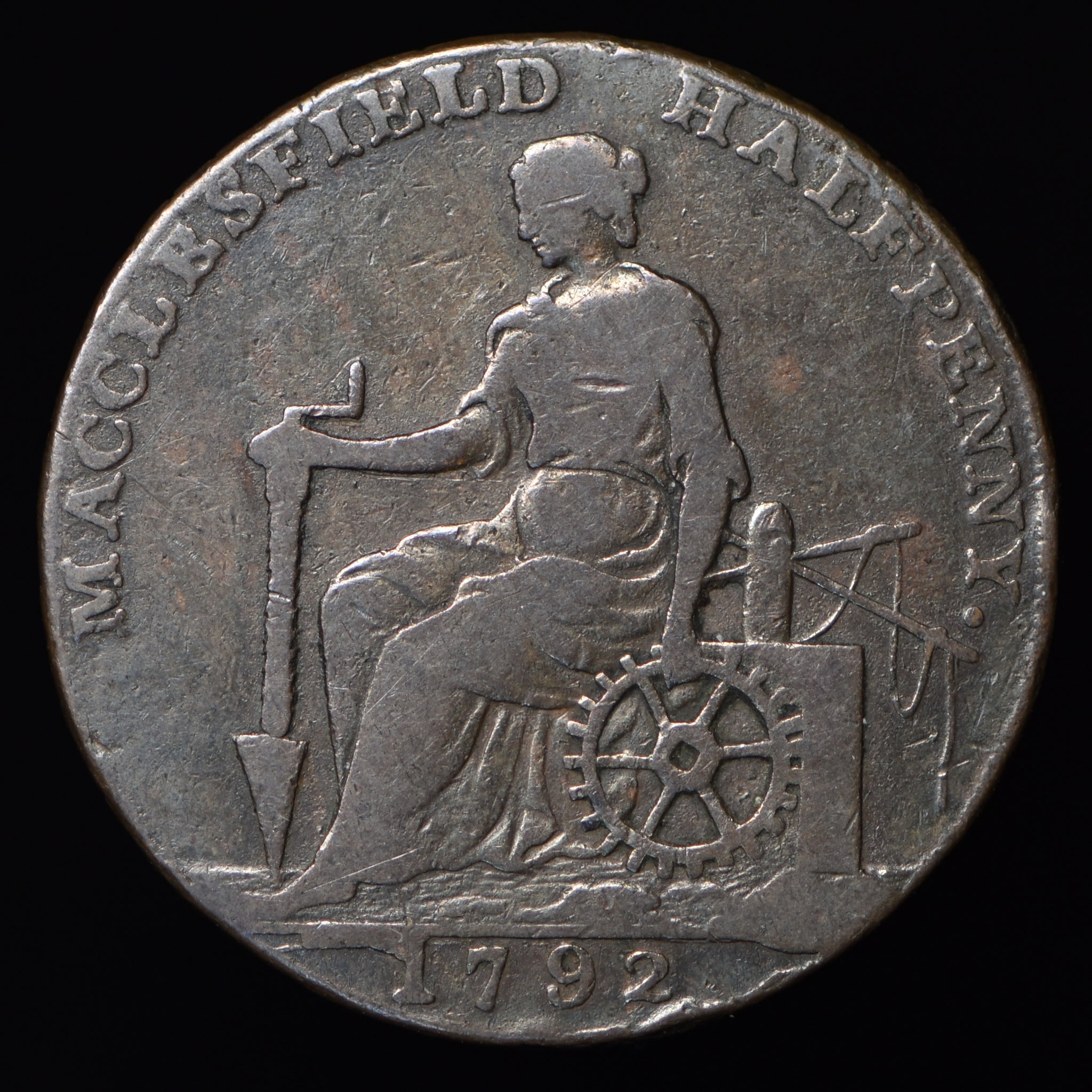Obv: Bust of Charles Roe, CHARLES ROE ESTABLISHED THE COPPER WORKS 1758 around. Rev: Woman seated with mining tools, MACCLESFIELD HALFPENNY. (around), 1792 in exergue. Edge: PAYABLE AT MACCLESFIELD LIVERPOOL OR CONGLETON . X .