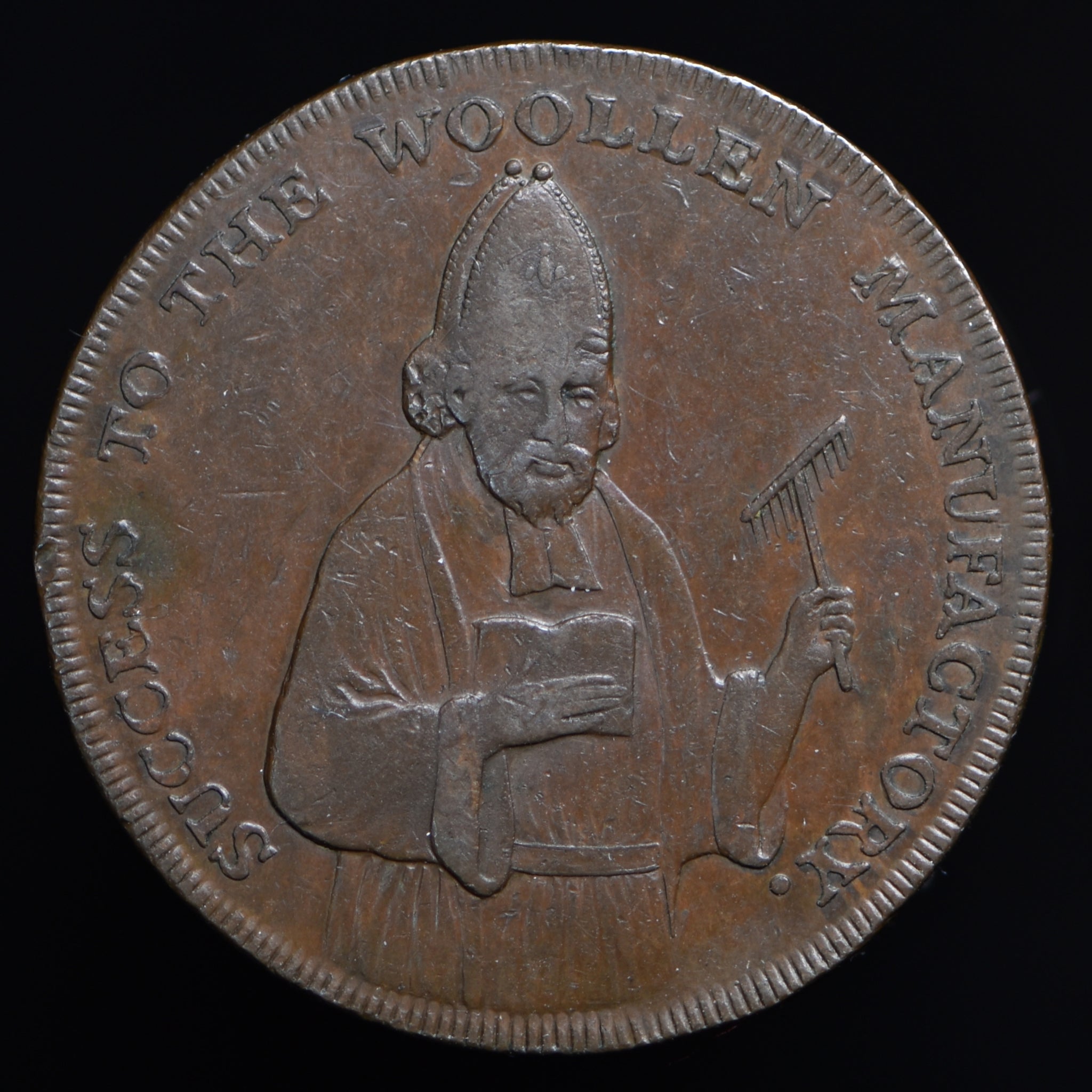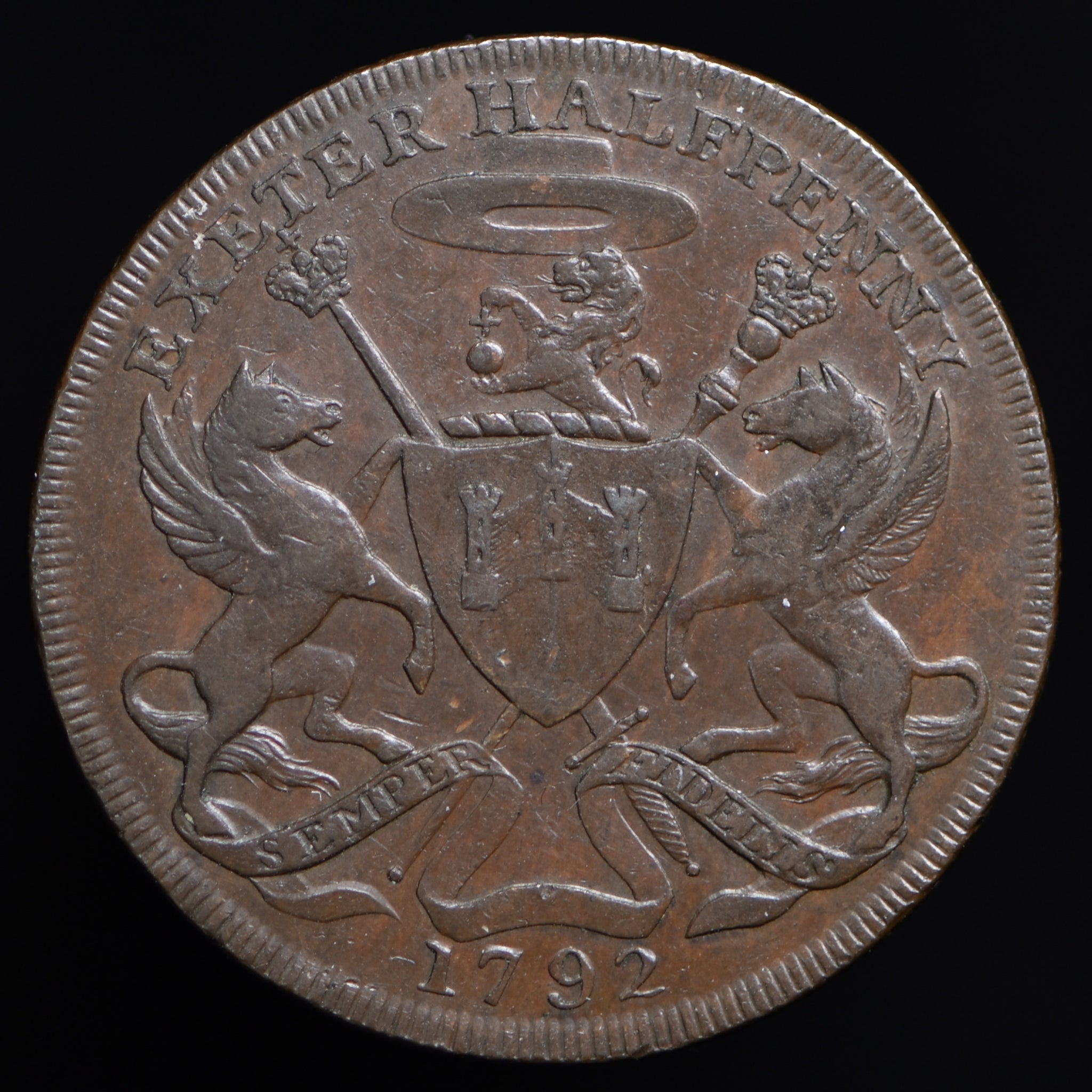 Obv: Three-quarter figure of Bishop Blaize, SUCCESS TO THE WOOLLEN MANUFACTORY around. Rev: Shielf of arms, EXETER HALFPENNY above, 1792 below. Edge: PAYABLE AT THE WAREHOUSE OF SAMUEL KINGDON . X .