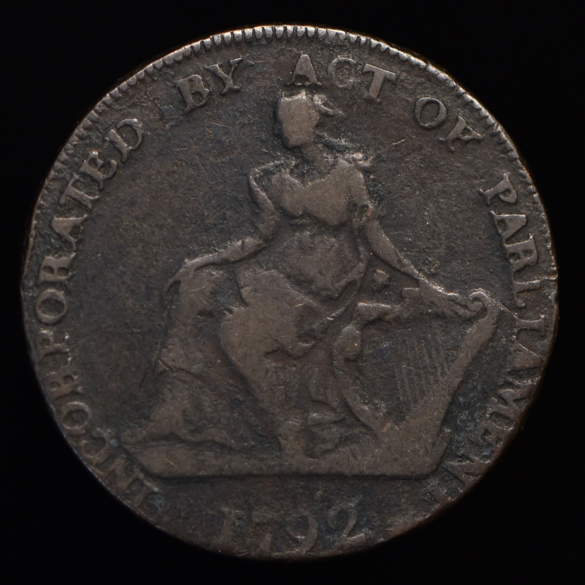 Obv: A female seated holding a harp with seven strings, INCORPORATED BY ACT OF PARLIAMENT around, 1792 below. Rev: A cypher H M Co. CAMAC KYAN AND CAMAC around, HALFPENNY below. Edge: PAYABLE IN DUBLIN OR AT BALLYMURTAGH.