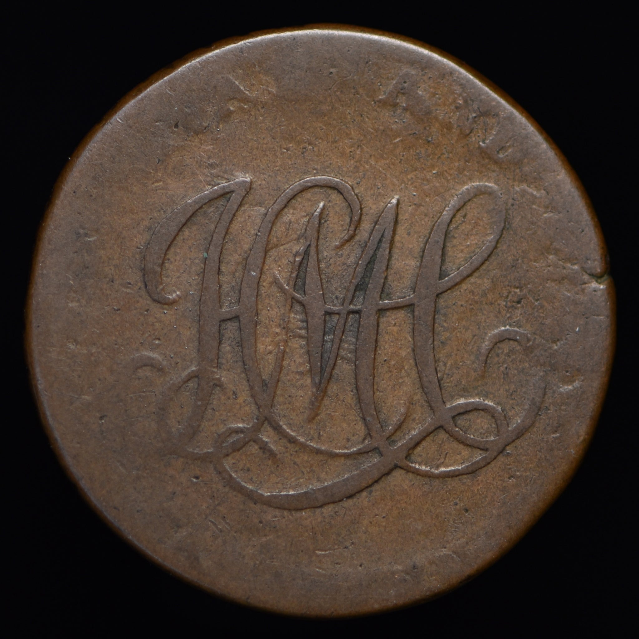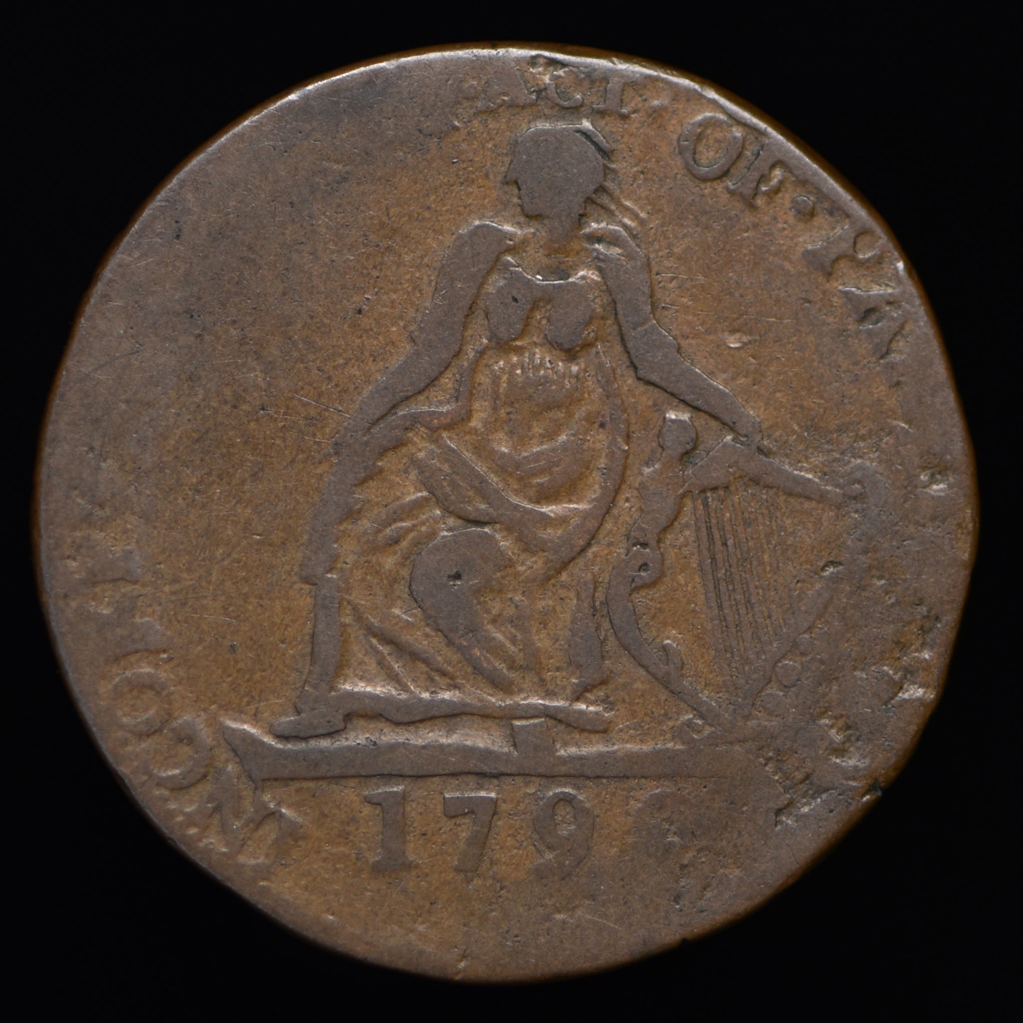 Obv: A female seated holding a harp with seven strings, INCORPORATED . BY . ACT . OF . PARLIAMENT around, 1792 below. Rev: A cypher H M Co. CAMAC KYAN AND CAMAC around, HALFPENNY below. Edge: PAYABLE IN DUBLIN CORK OR DERRY.