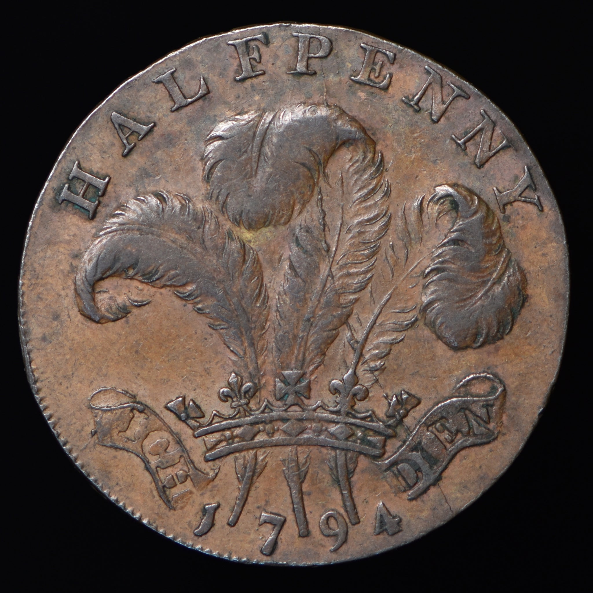 Obv: Bust facing right, GEORGE PRINCE OF WALES. (around). Rev: Prince's crest and motto, HALFPENNY above, 1794 below. Edge: WARLEY CAMP HALFPENNY MDCCXCIV .X.X.X.