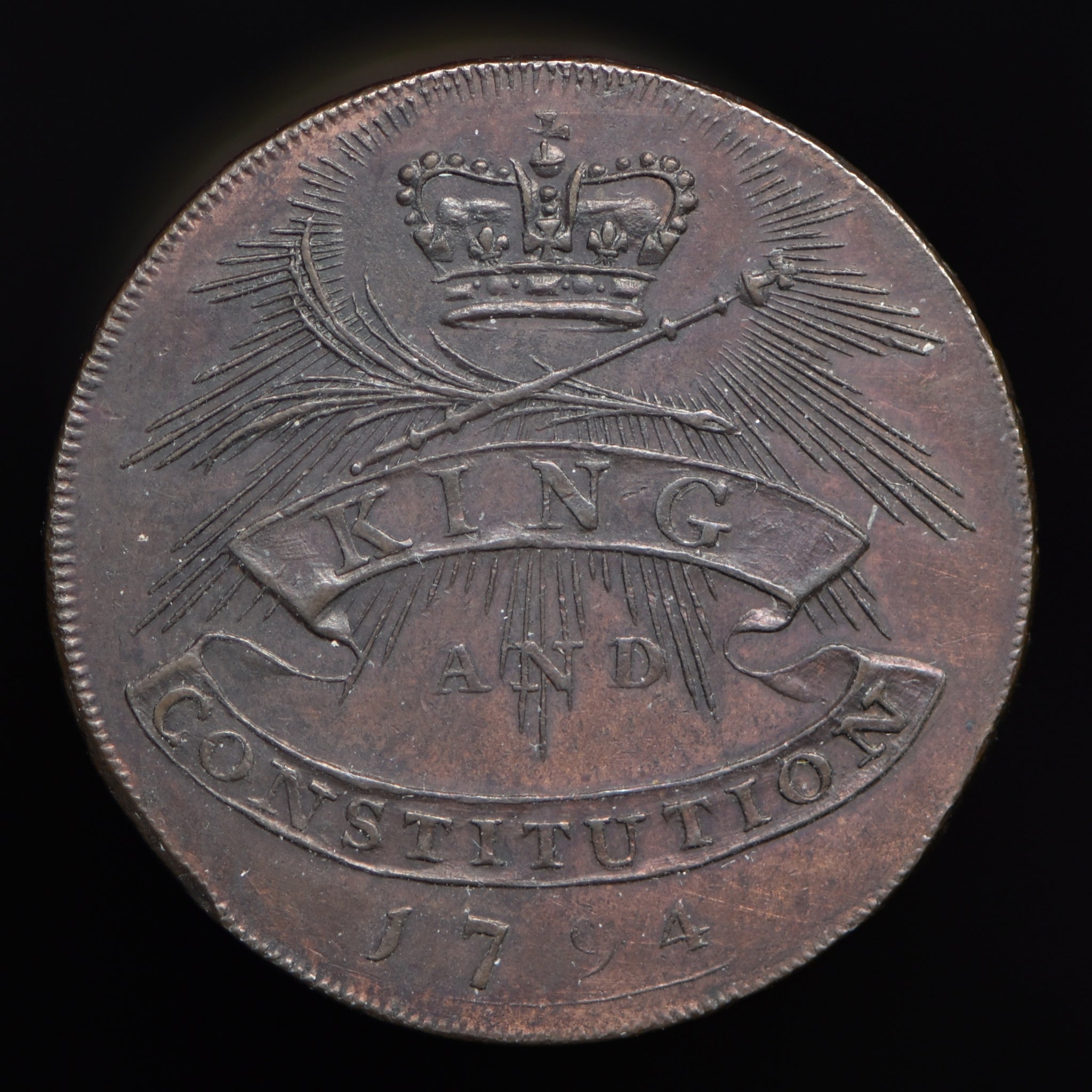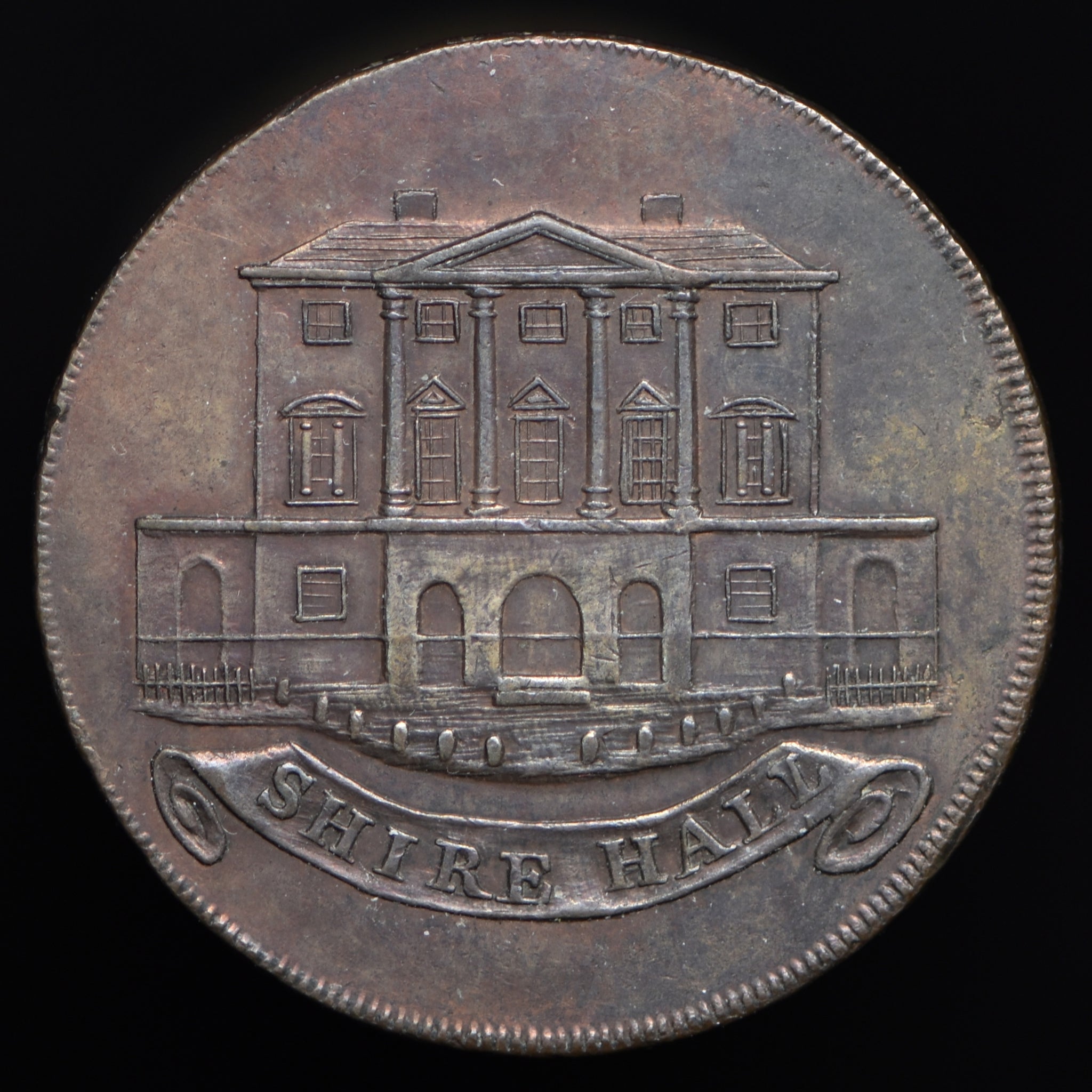 Obv: View of building, SHIRE HALL on banner below. Rev; KING AND CONSTITUTION, crown above, 1794 below. Edge: PAYABLE IN HULL AND IN LONDON . X X .