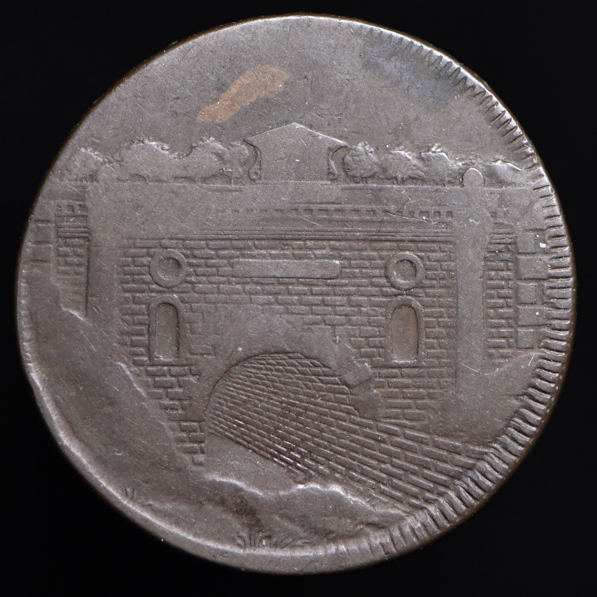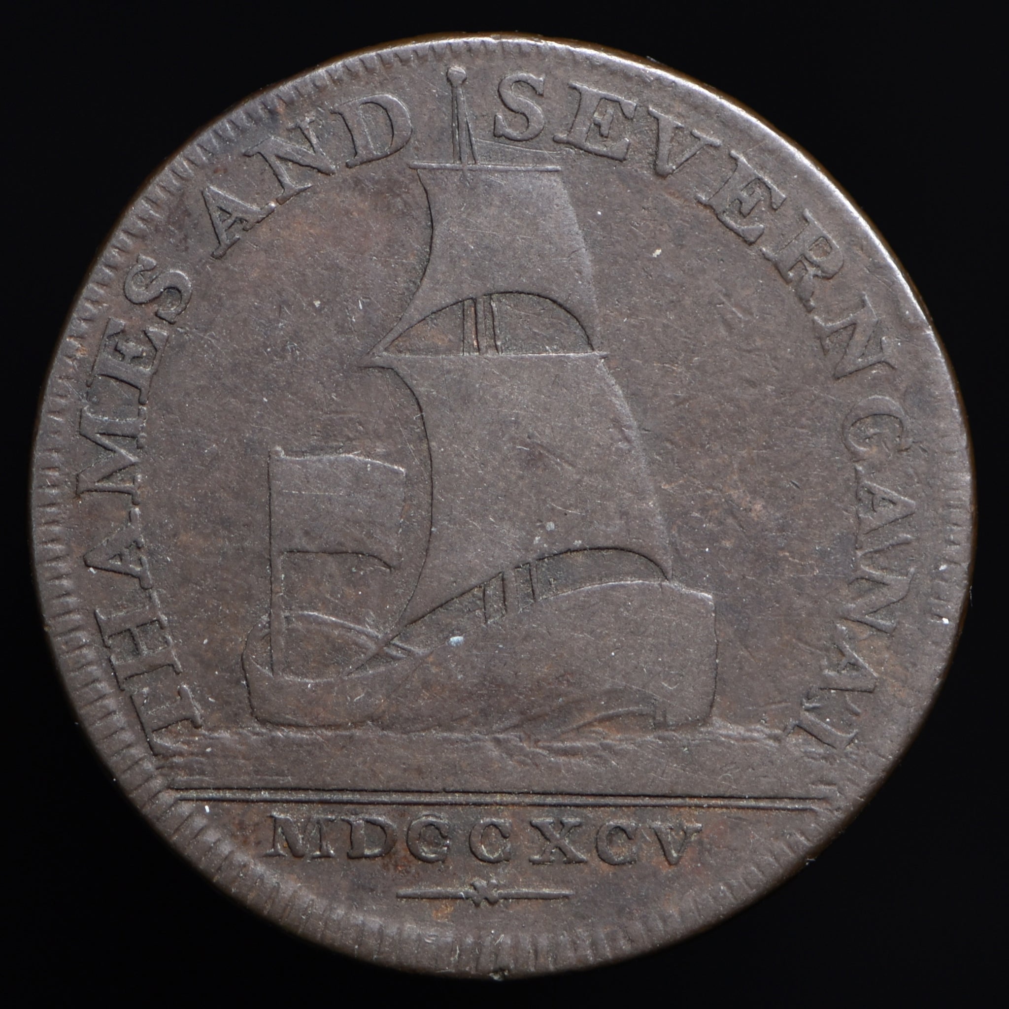 Obv: A barge with plain sails, THAMES AND SEVERN CANAL around, MDCCXCV in exergue. Rev: The entrance to Sapperton tunnel. Edge: PAYABLE AT BRIMSCOMBE PORT X.
