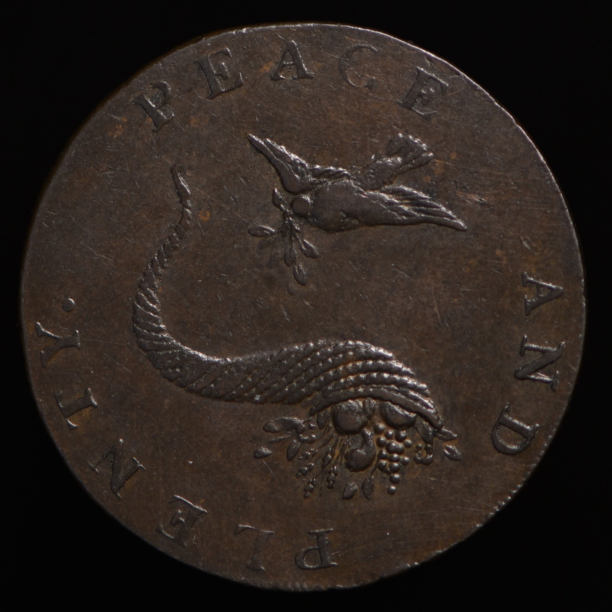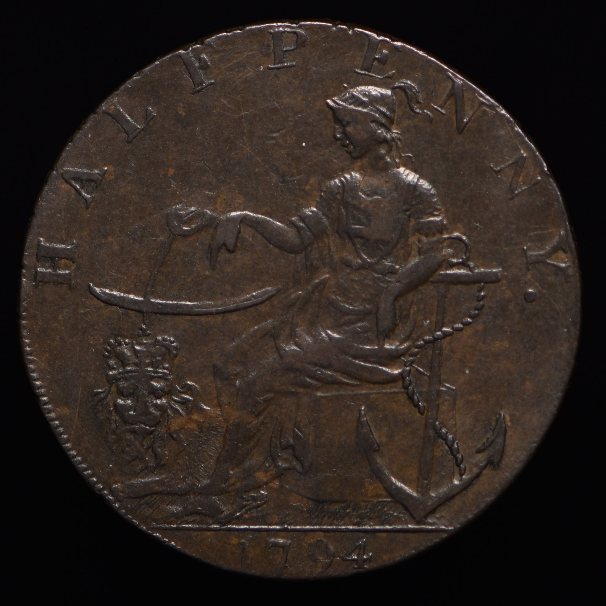 Obv: Female seated, HALFPENNY . (around), 1794 in exergue. Rev: Dove and cornucopia, PEACE AND PLENTY around. Edge: CURRENT EVERY WHERE - - -.