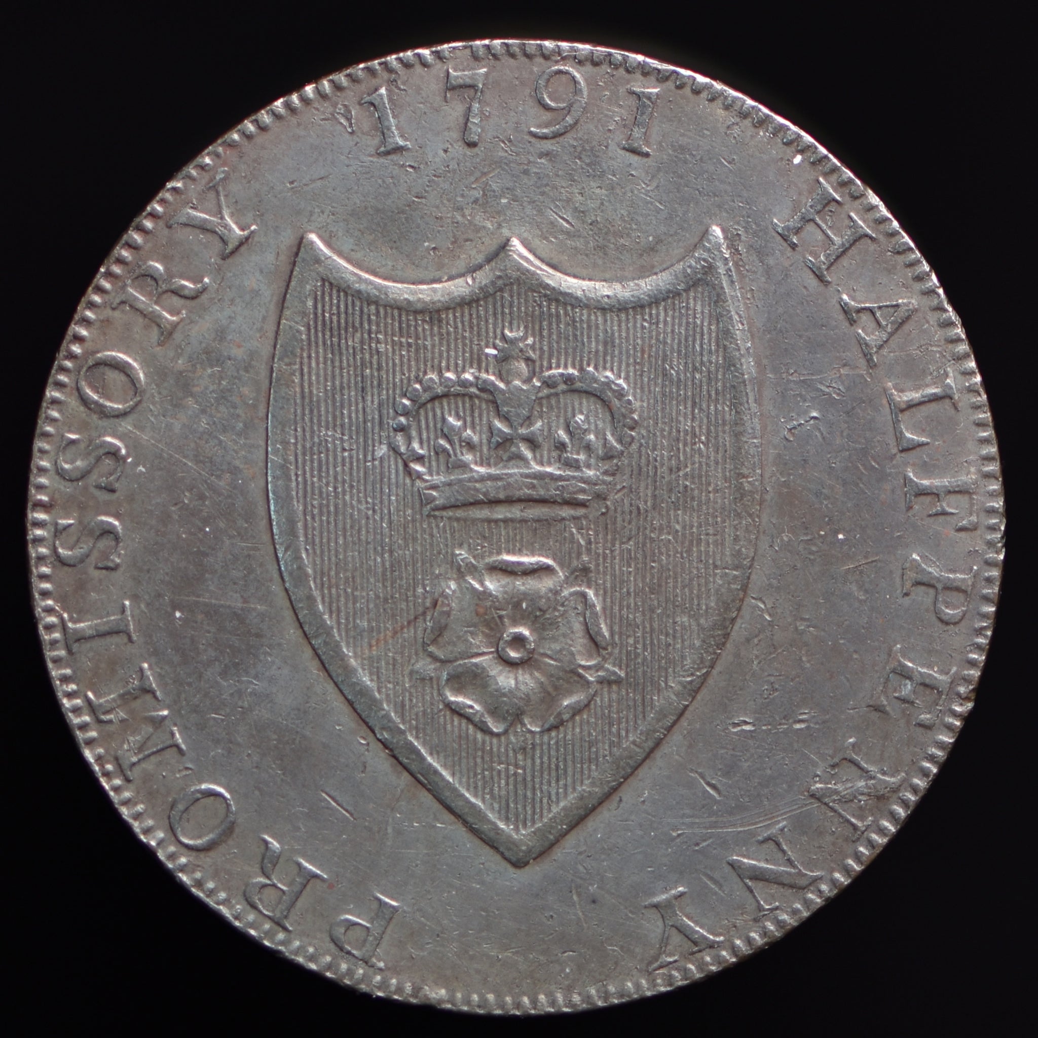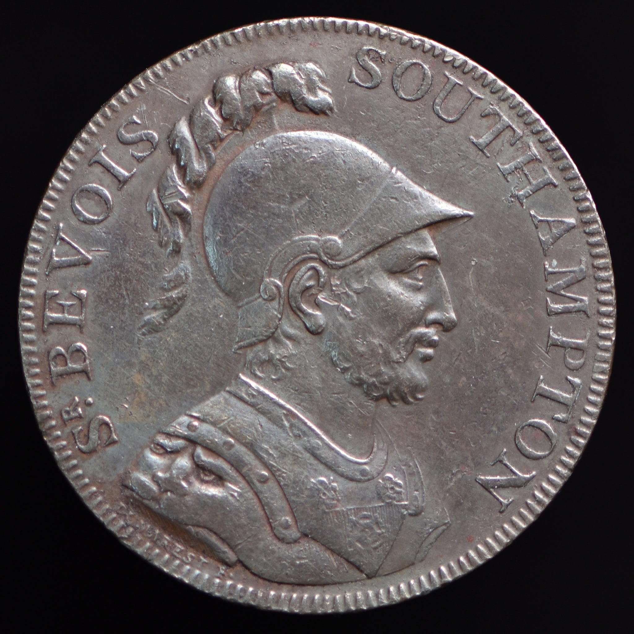 Obv: Bust of Sir Bevois, SR. BEVOIS SOUTHAMPTON around. Rev: Arms of Hampshire, PROMISSORY 1791 HALFPENNY around. Edge: PAYABLE AT THE OFFICE OF W. TAYLOR R.V. MOODY & CO.