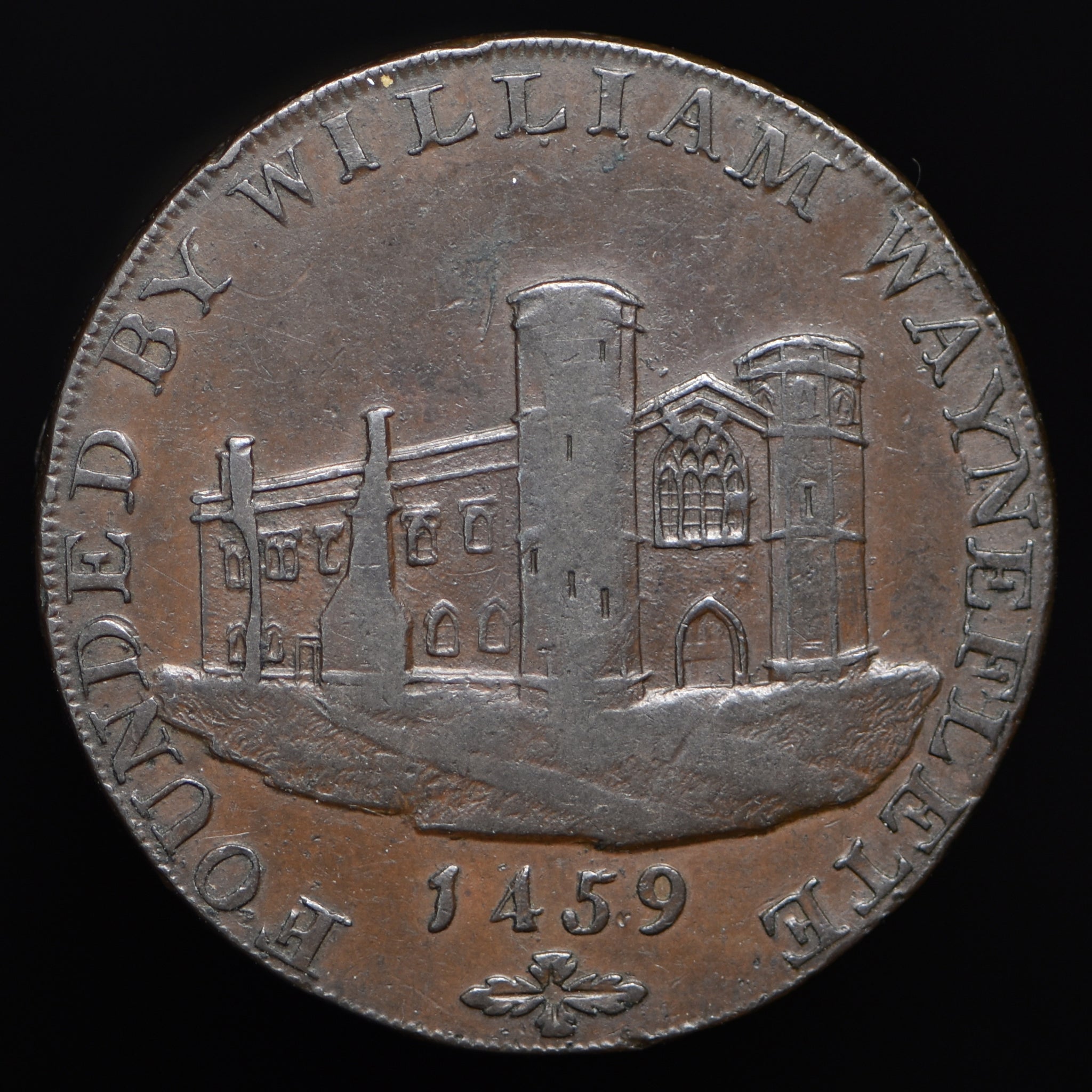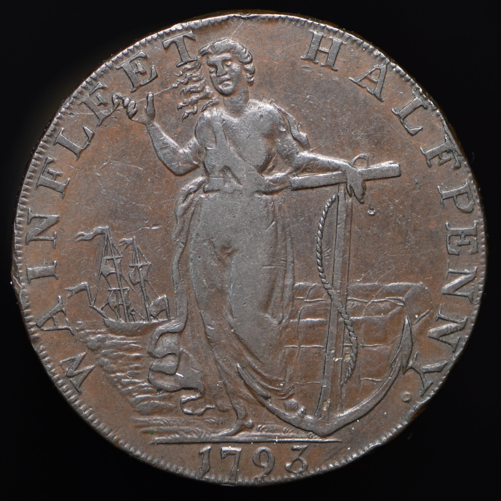 Obv: View of Wainfleet Abbey, 1459 below, FOUNDED BY WILLIAM WAYNEFLETE around. Rev: Hope standing with ship in distance, WAINFLEET HALFPENNY around, 1793 in exergue. Edge: PAYABLE AT THE WAREHOUSES OF D. WRIGHT & S. PALMER . X .