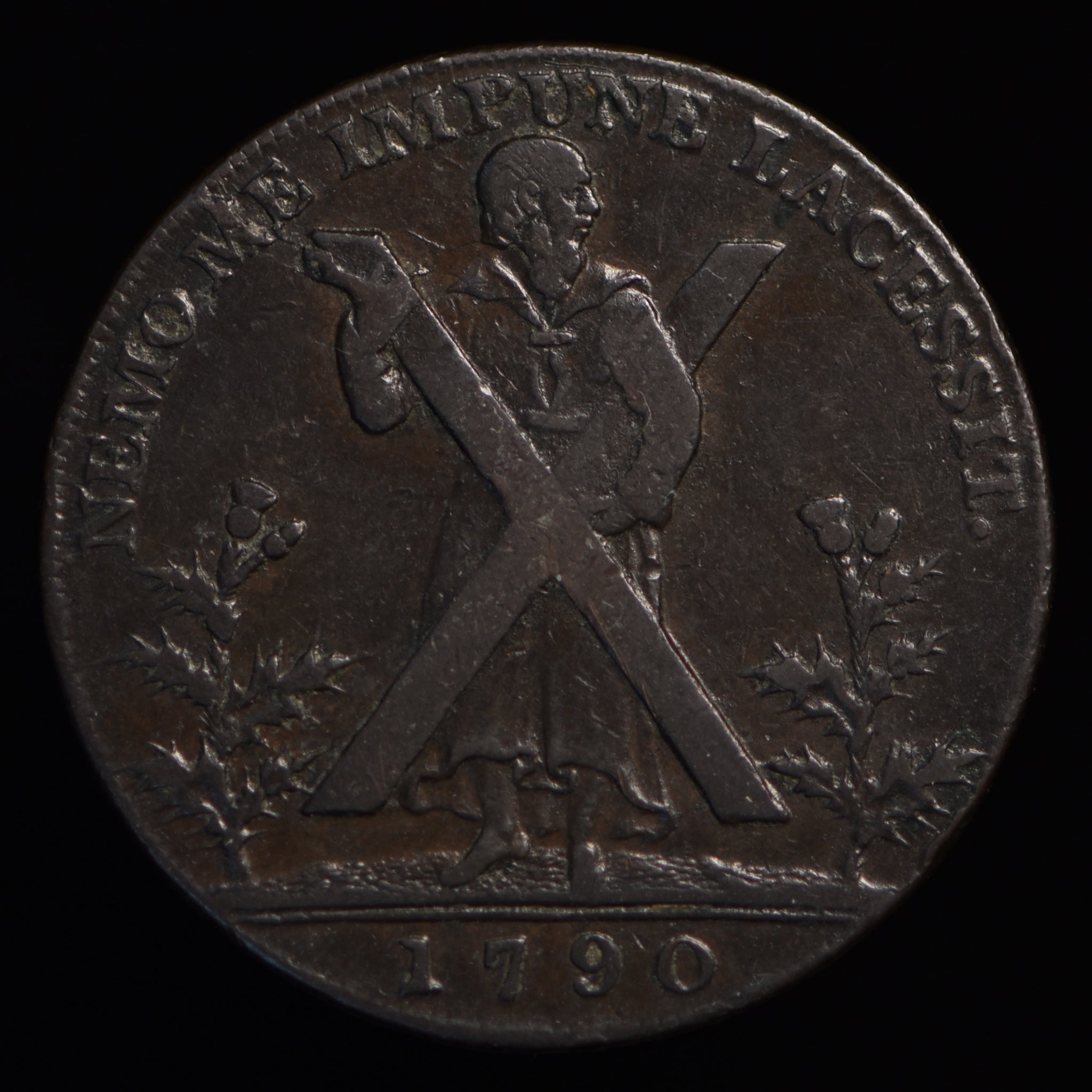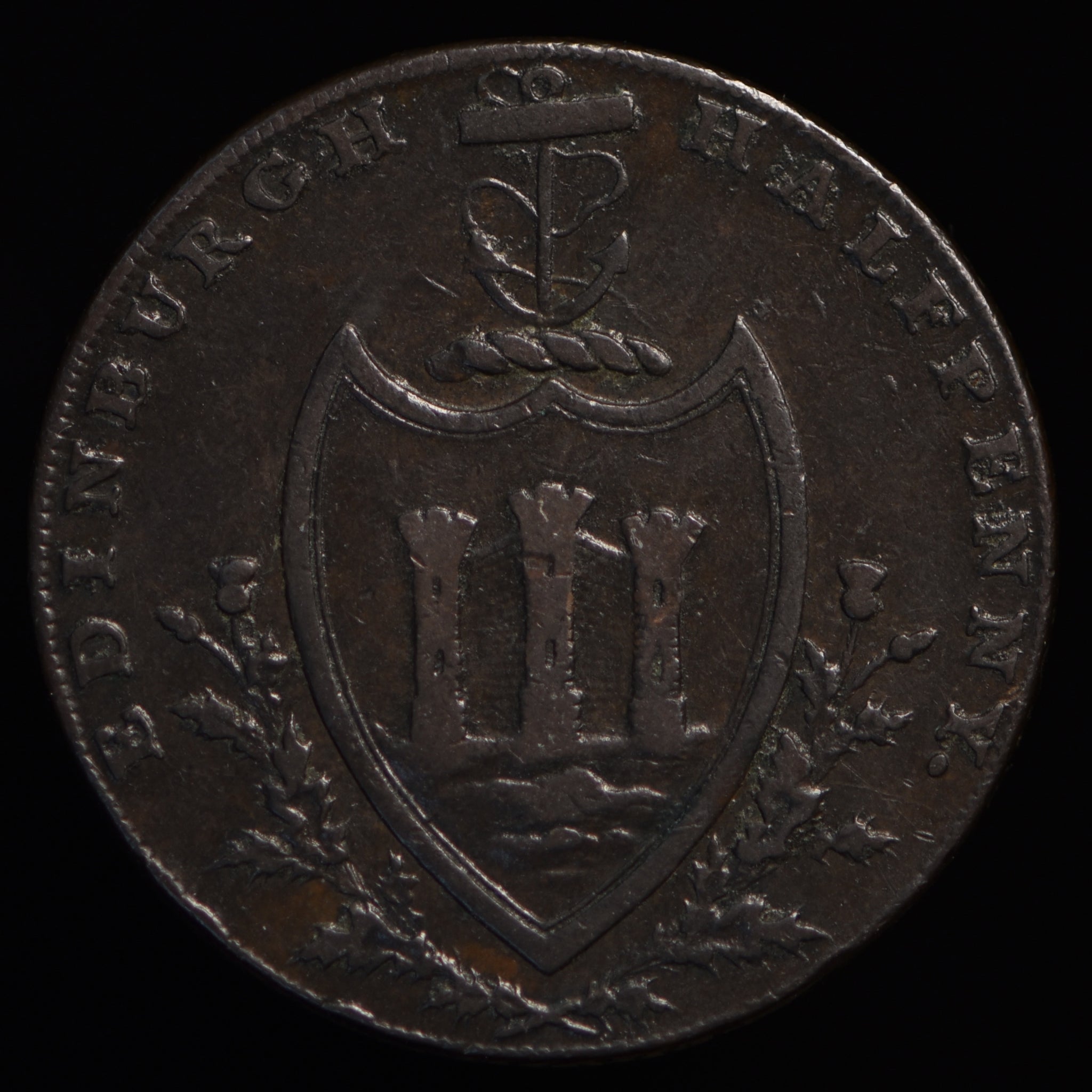 Obv: St. Andrew with cross, NEMO ME IMPUNE LACESSIT. (around), 1790 in exergue. Rev: Arms of Edinburgh, EDINBURGH HALFPENNY. (around). Edge: PAYABLE AT THE WAREHOUSE OF THOS. & ALEXR. HUTCHISON.