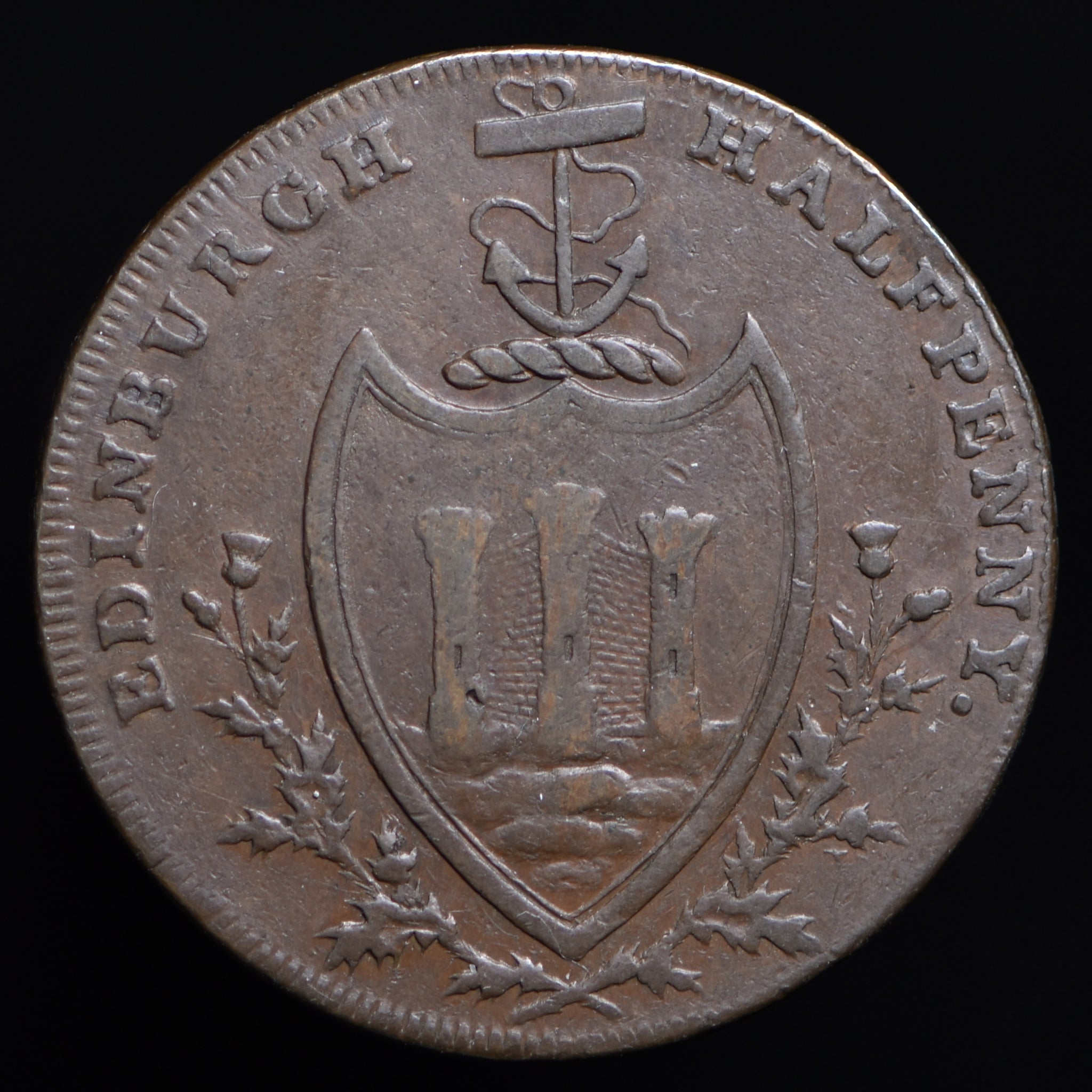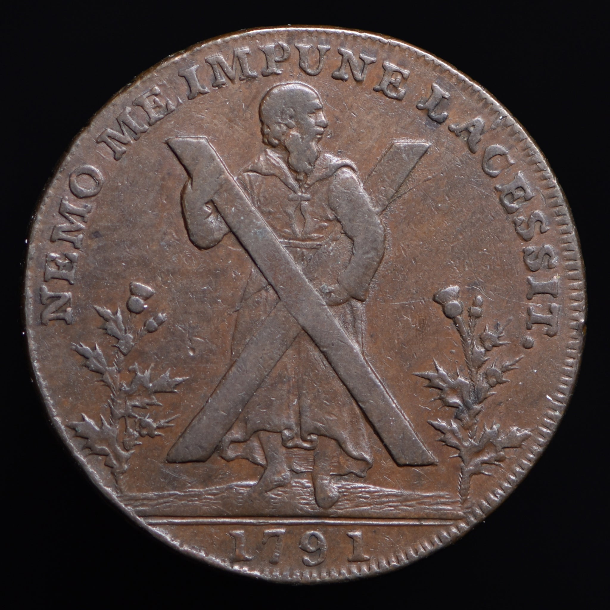 Obv: St. Andrew with cross, NEMO ME IMPUNE LACESSIT. (around), 1791 in exergue. Rev: Arms of Edinburgh, EDINBURGH HALFPENNY. (around). Edge: PAYABLE AT THE WAREHOUSE OF THOS. & ALEXR. HUTCHISON.