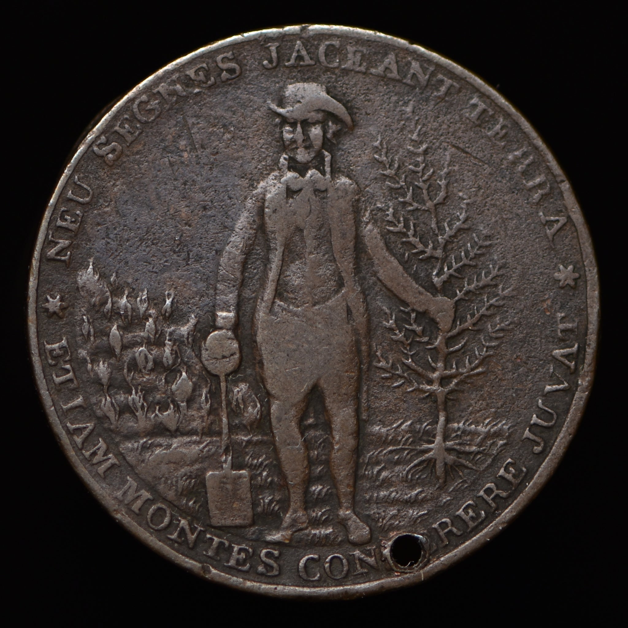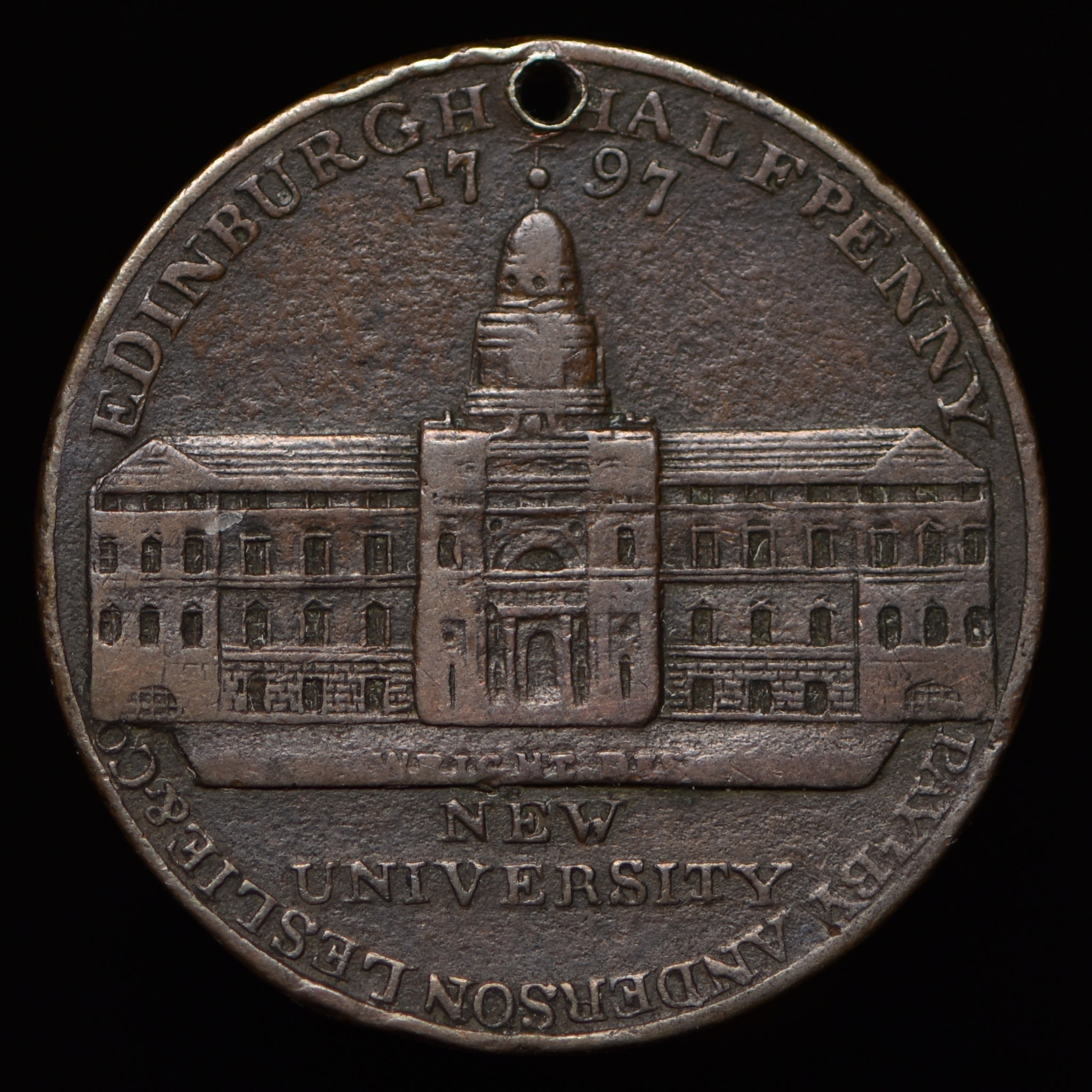 Obv: View of building, EDINBURGH HALFPENNY 1798 above, NEW UNIVERSITY PAYE. BY ANDERSON LESLIE & CO. in exergue. Rev: Gardener holding spade and shrub, NEW SEGNES JACEANT TERRA ETIAM NOMTES CONSERERE JUVAT around. Edge: Plain.