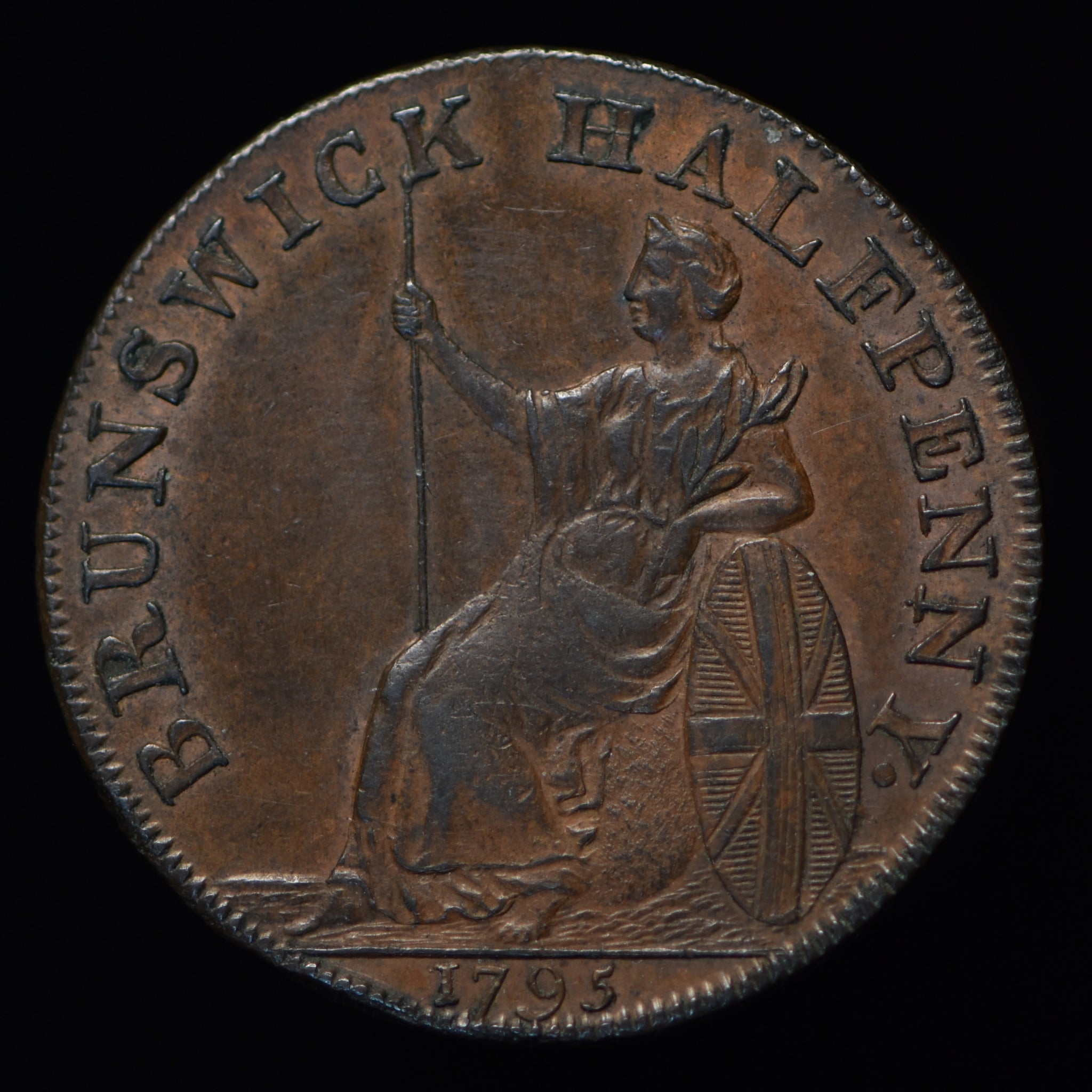 Obv: Laureate bust to left, PAYABLE AT J. KILLVINGTONS around. Rev: Britannia seated, BRUNSWICK HALFPENNY around, 1795 in exergue. Edge: Engrailed.