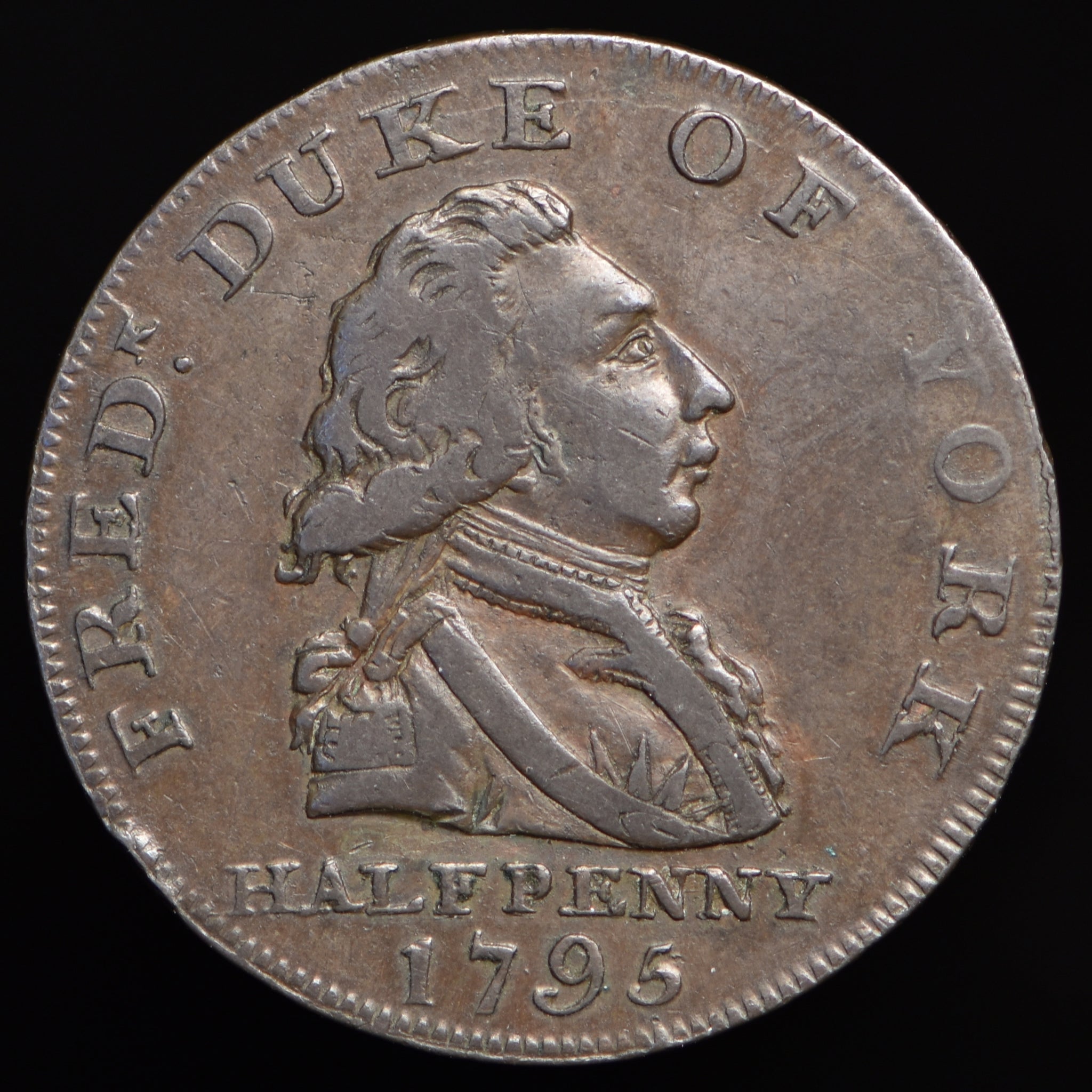 Obv: Bust facing right, FREDK. DUKE OF YORK around, HALFPENNY 1795 in exergue. Rev: Ship sailing left, THE WOODEN WALLS OF OLD ENGLAND around. Edge: PAYABLE AT LONDON OR DUBLIN . X . X .