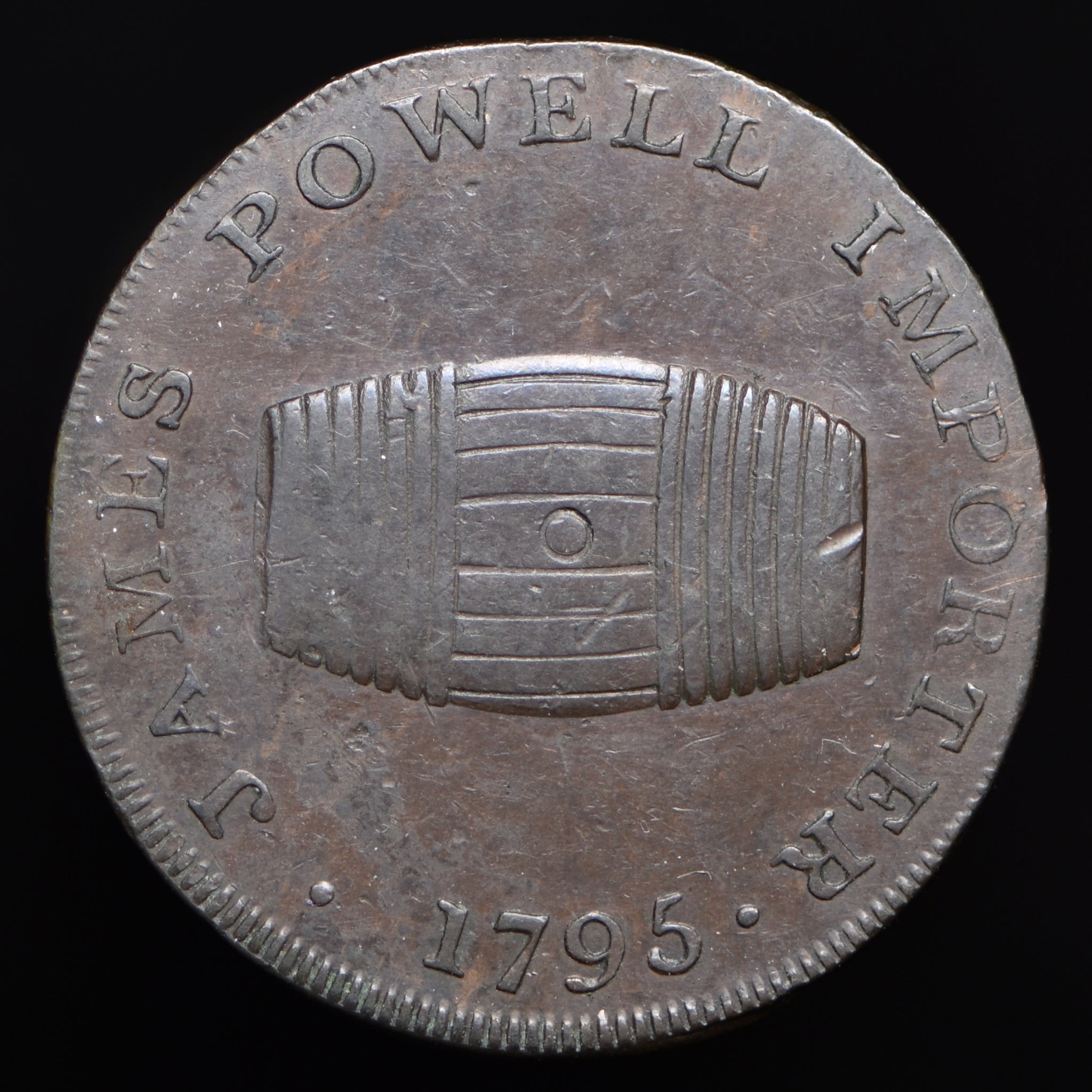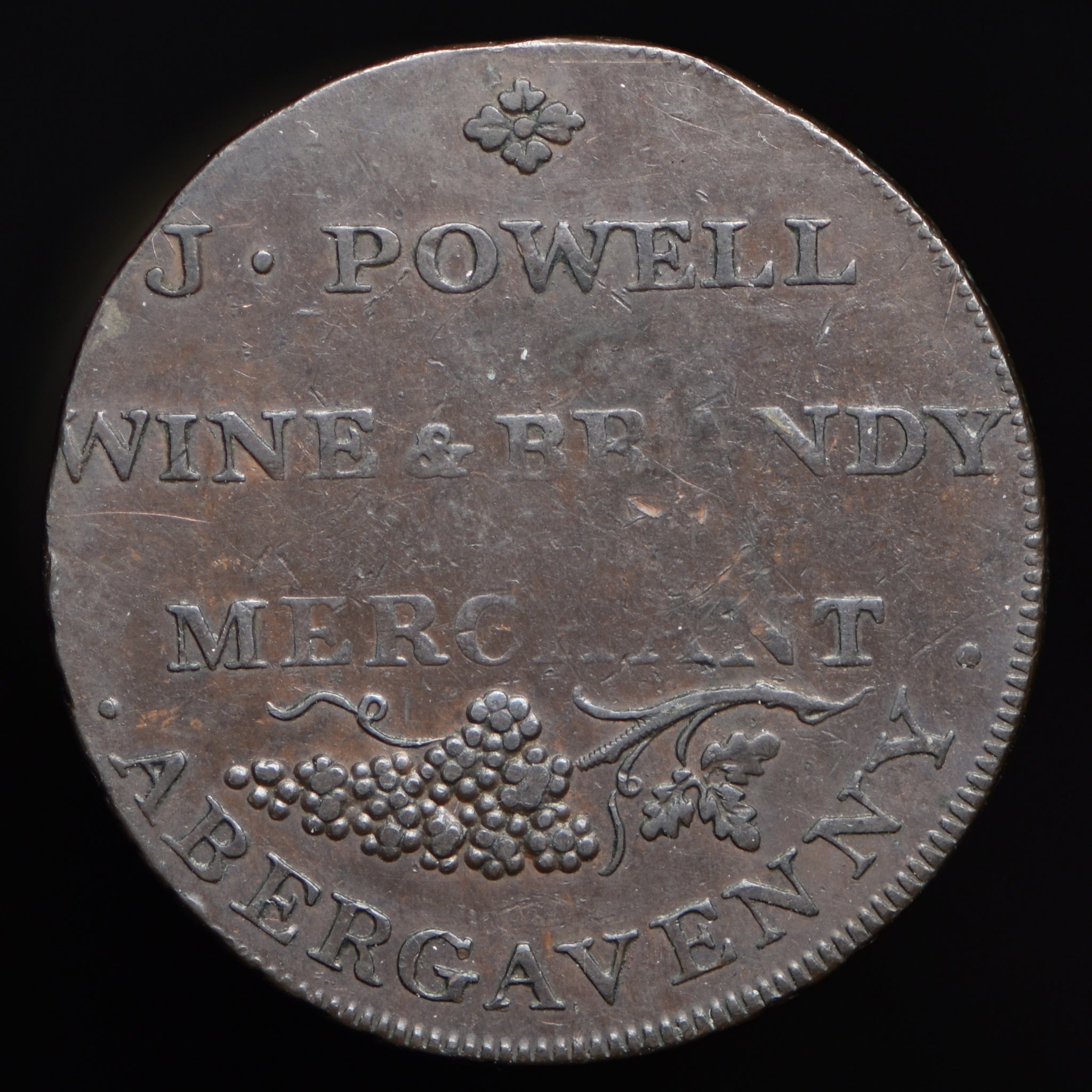 Obv: A cask, JAMES POWELL IMPORTER around, 1795 below. Rev: J. POWELL WINE & BRANDY MERCHANT ABERGAVENNY, bunch of grapes below MERCHANT. Edge: PAYABLE AT MONMOUTH AND ABERGAVENNY . X .