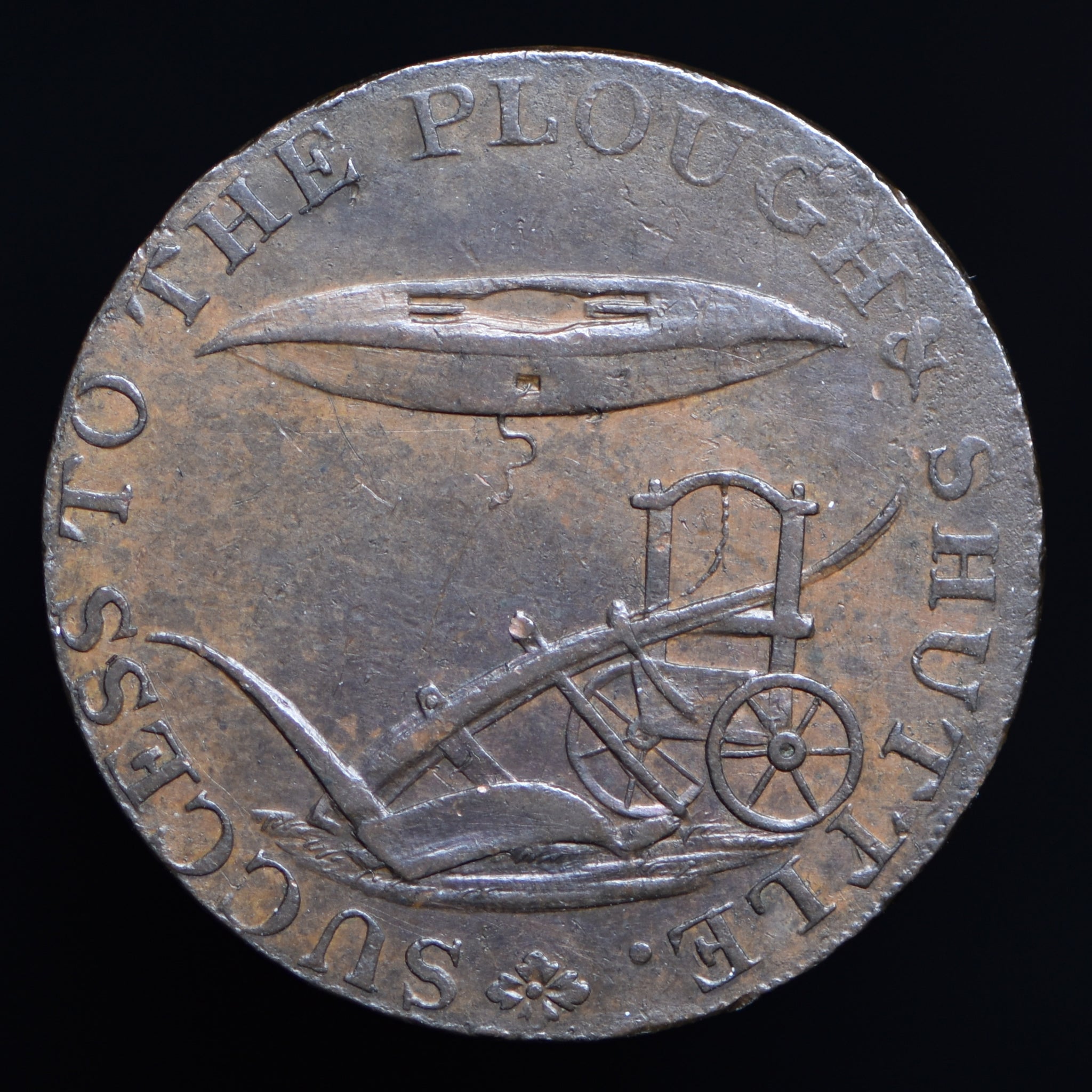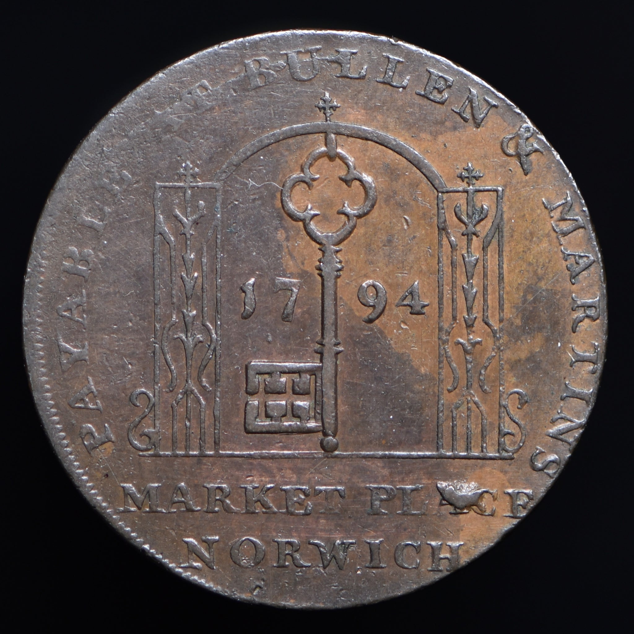 Obv: A key suspended from an iron archway, 1794 in center, PAYABLE AT BULLEN AND MARTINS around, MARKET PLACE NORWICH in exergue. Rev: A plough and shuttle, SUCCESS TO THE PLOUGH AND SHUTTLE around. Edge: Plain.