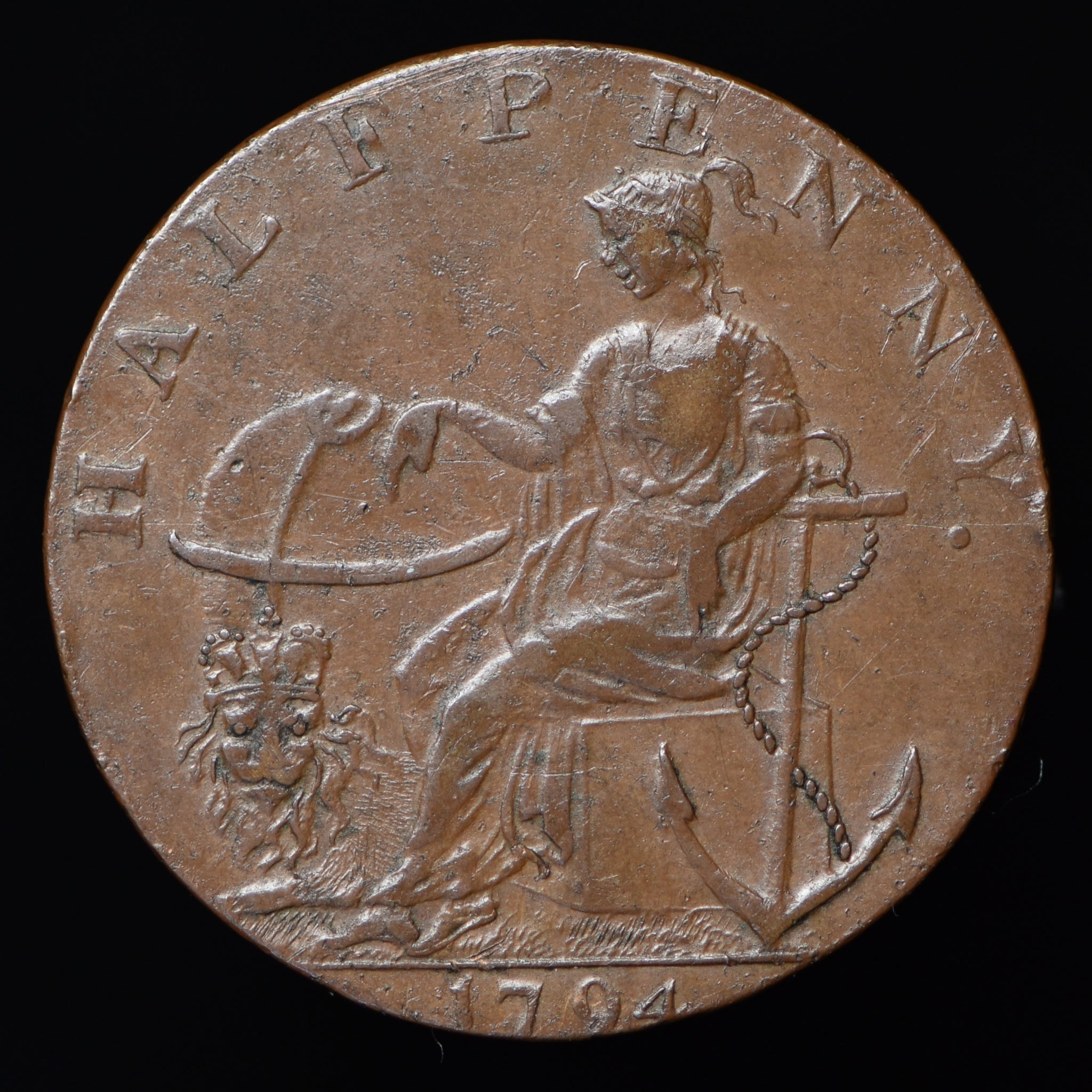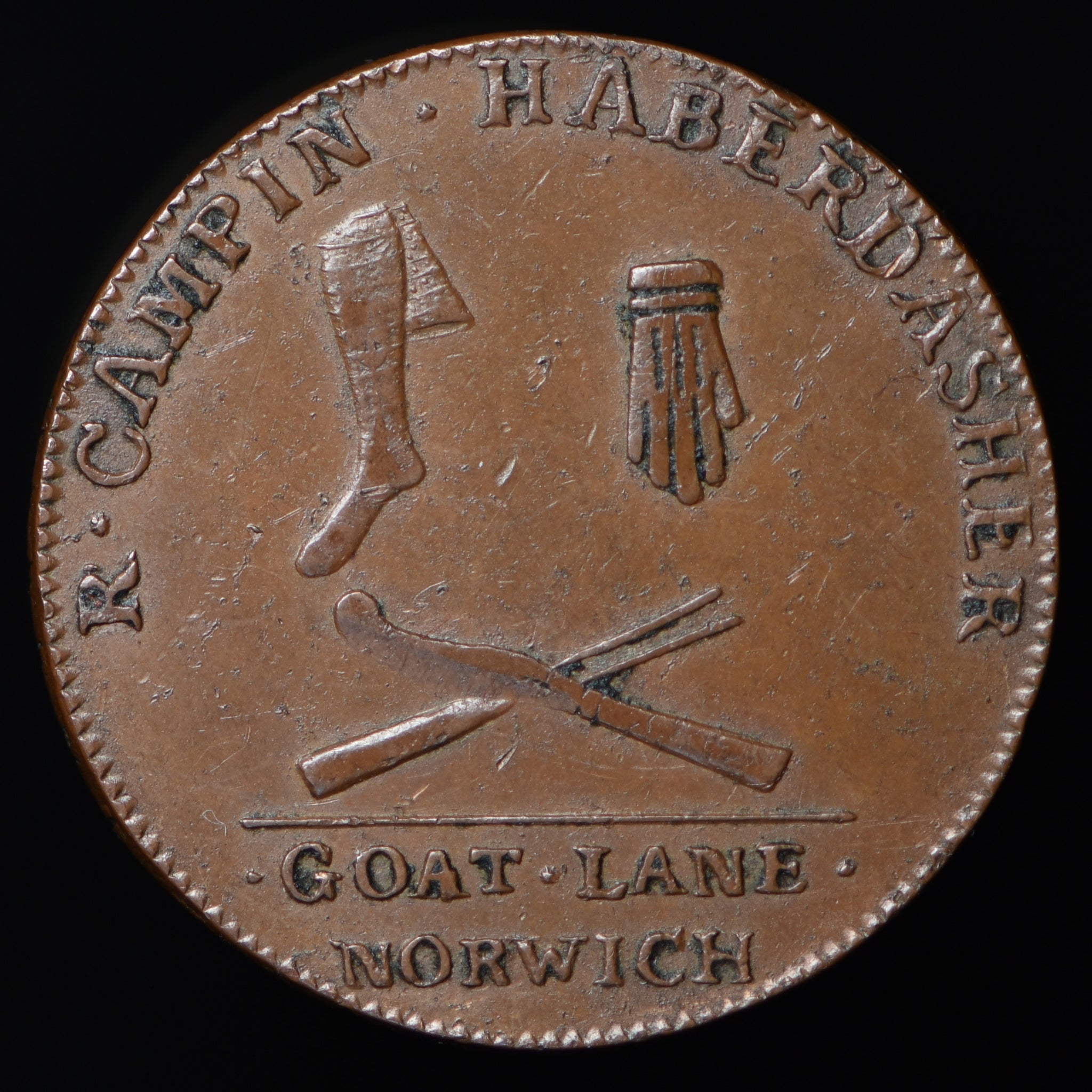 Obv: Bent stocking and a glove, and a knife and fork crossed, R. CAMPIN HABERDASHER around, GOAT LANE NORWICH in exergue. Rev: Female seated between anchor and glove, HALFPENNY above, 1794 in exergue. Edge: CURRENT EVERY WHERE.