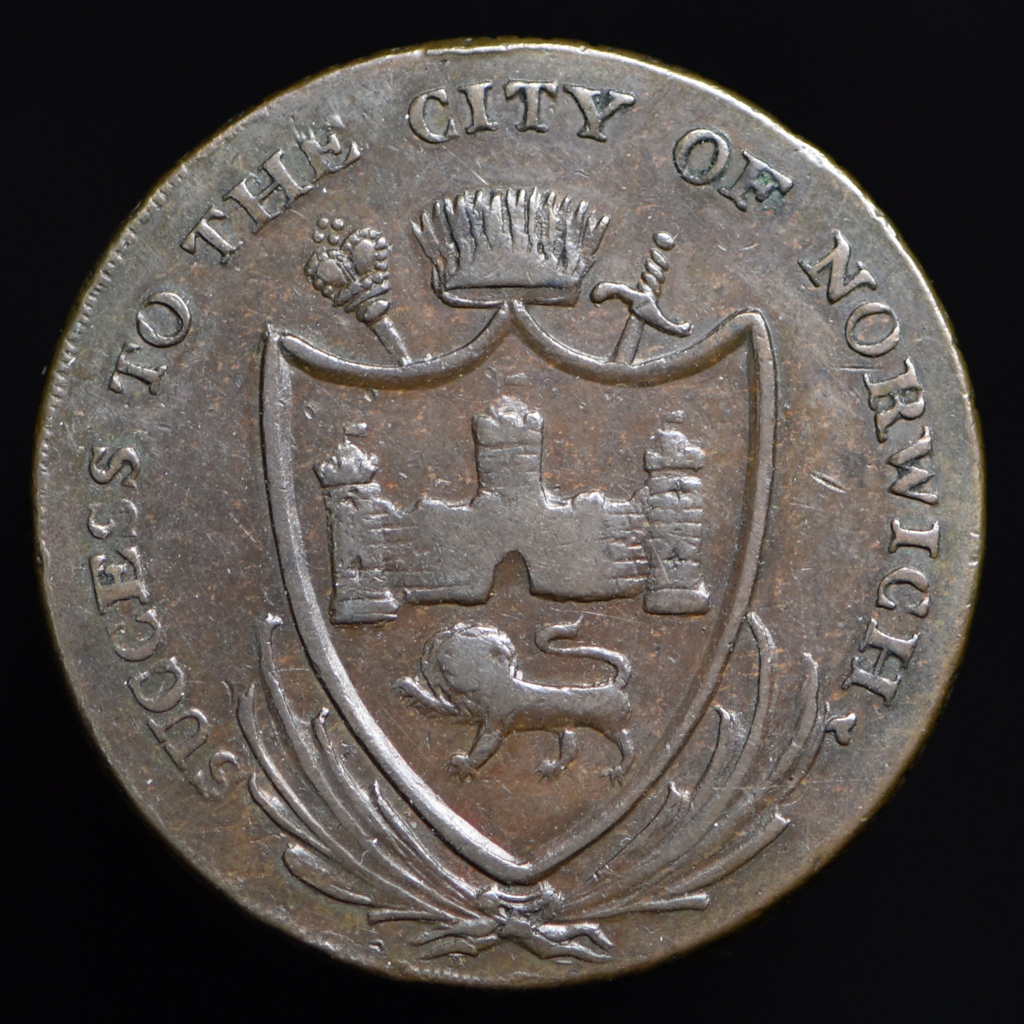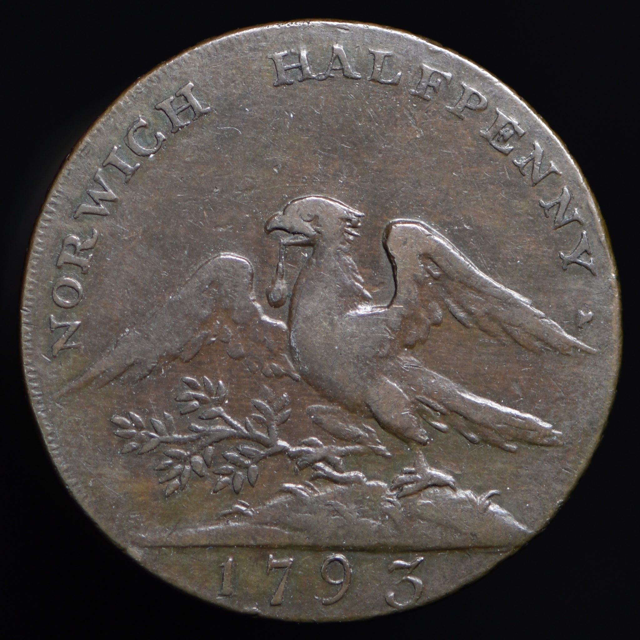 Obv: Shield of arms of Norwich, SUCCESS TO THE CITY OF NORWICH around. Rev: Eagle with wings spread, NORWICH HALFPENNY around, 1793 in exergue. Edge: PAYABLE AT THE SHOP OF DUNHAM & YALLOP GOLD-SMITHS.