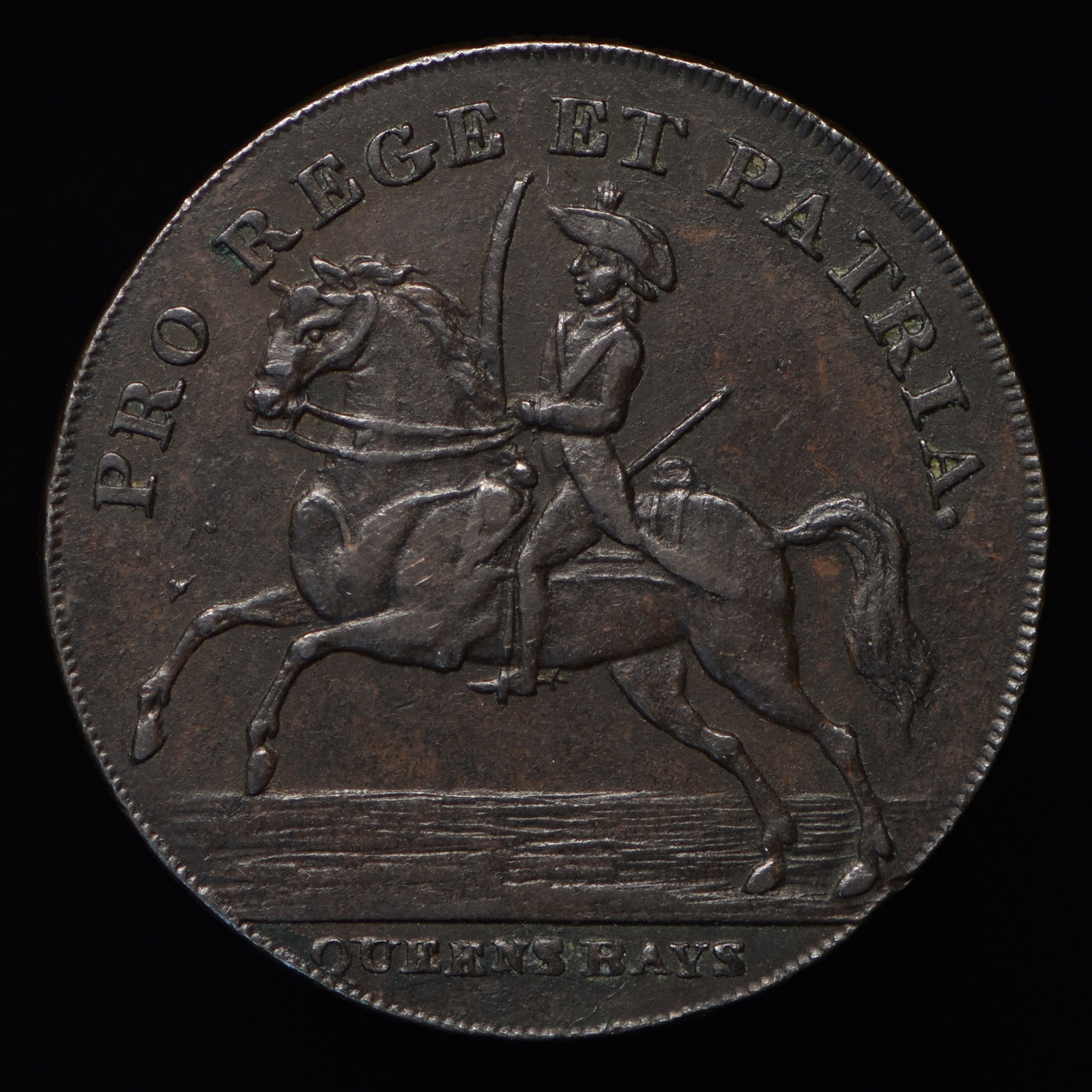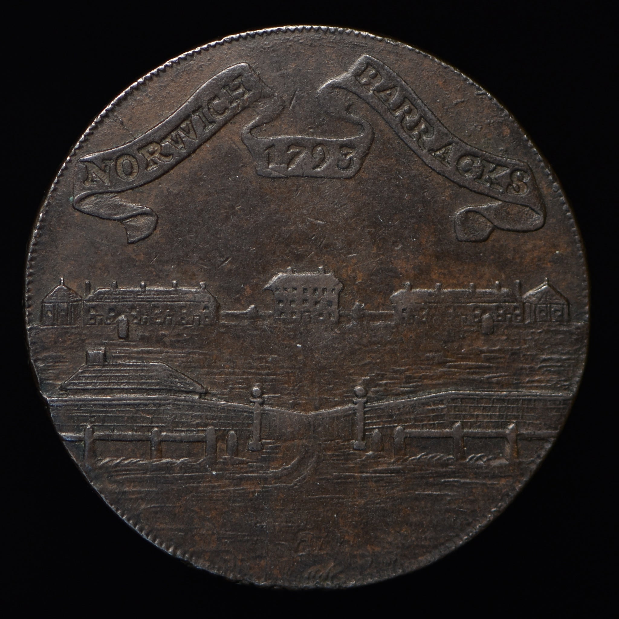 Obv: A mounted dragoon, PRO REGE ET PATRIA. around, QUEENS BAYS in exergue. Rev: View of barracks, NORWICH BARRACKS 1793 upon a label above. Edge: PAYABLE AT IOHN ROOKS NORWICH. X X X X .