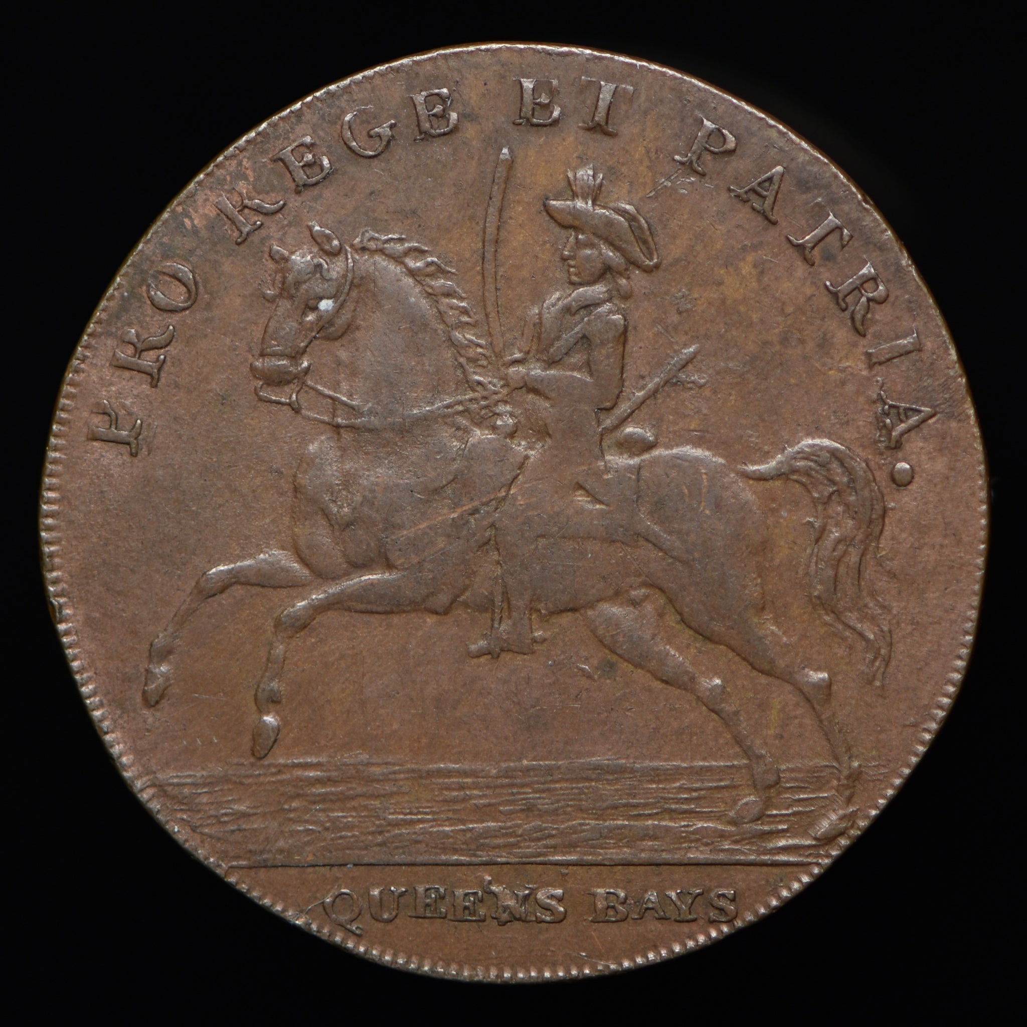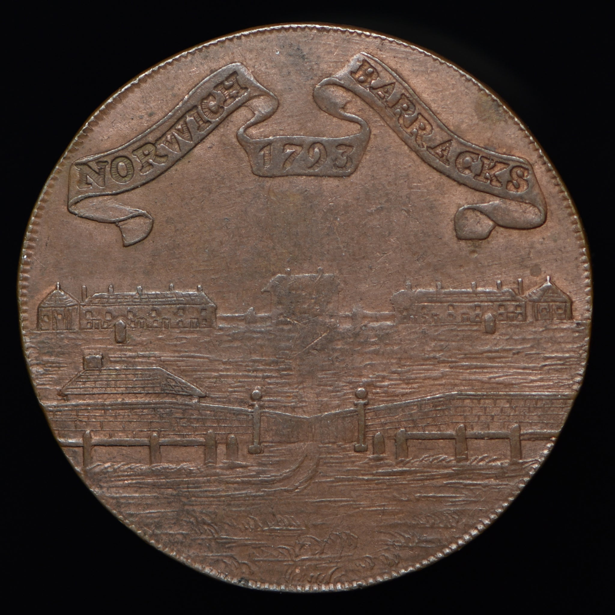 Obv: A mounted dragoon, PRO REGE ET PATRIA. around, QUEENS BAYS in exergue. Rev: View of barracks, NORWICH BARRACKS 1793 upon a label above. Edge: Plain (not in collar).
