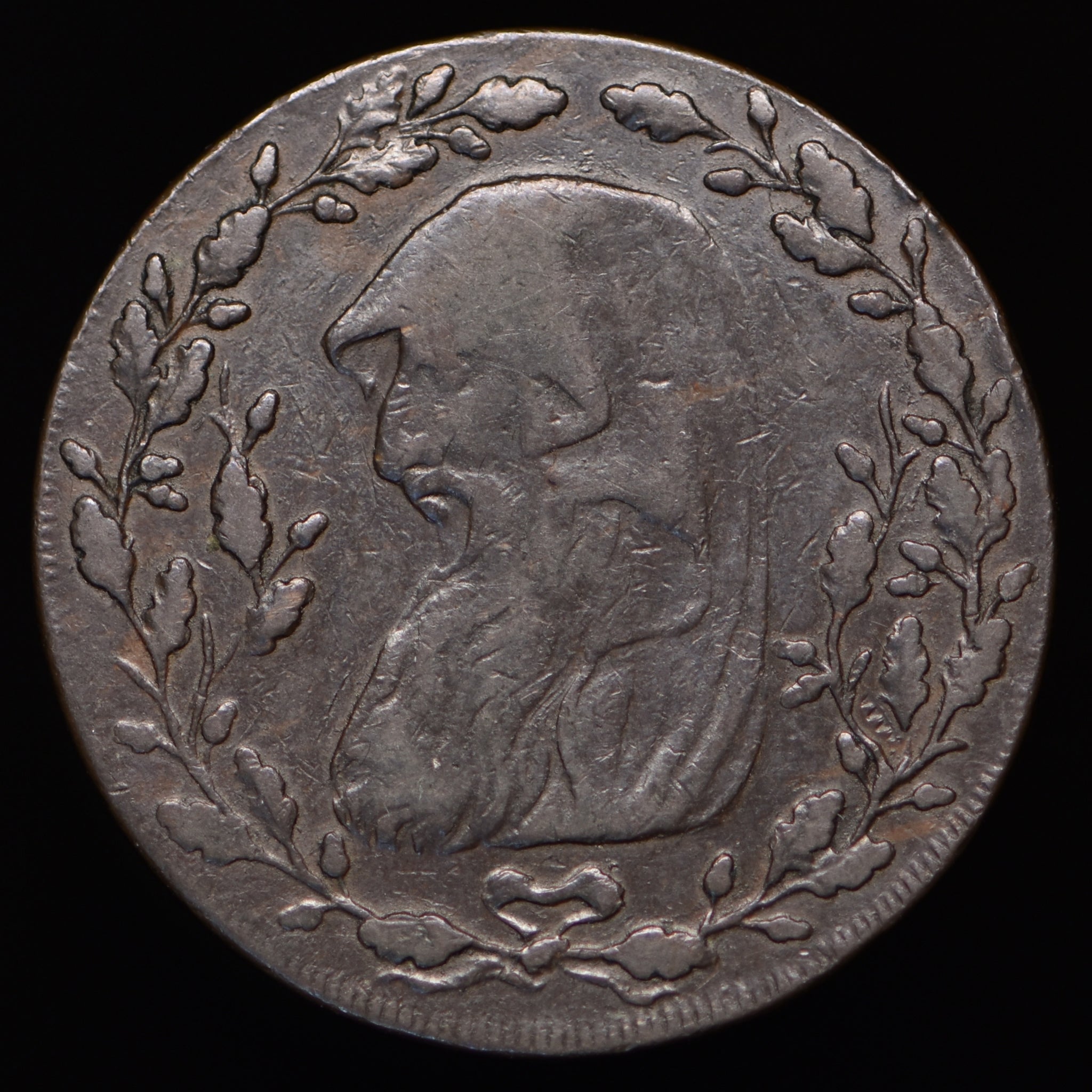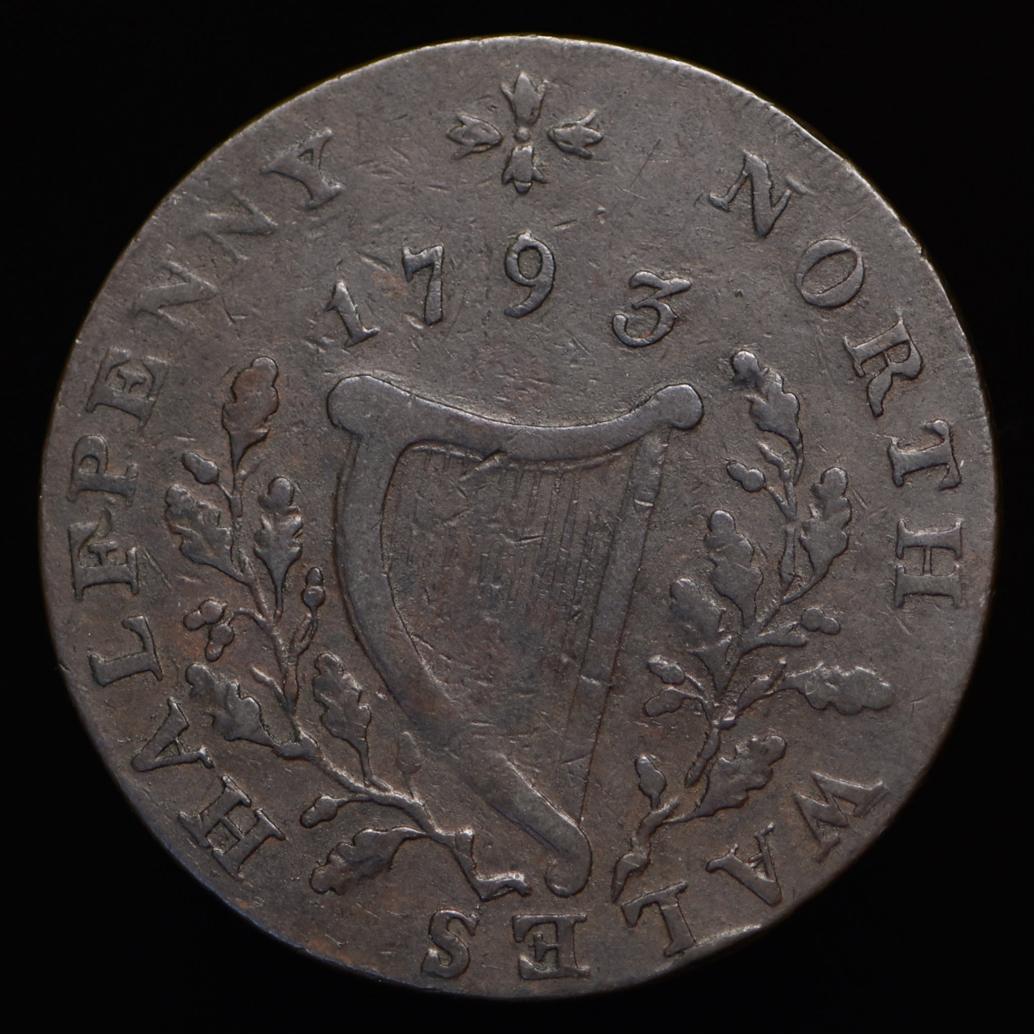 Obv: Druids' bust in wreath of oak leaves. Rev: A harp between sprigs of oak, 1793 above, NORTH WALES HALFPENNY around. Edge: Engrailed.