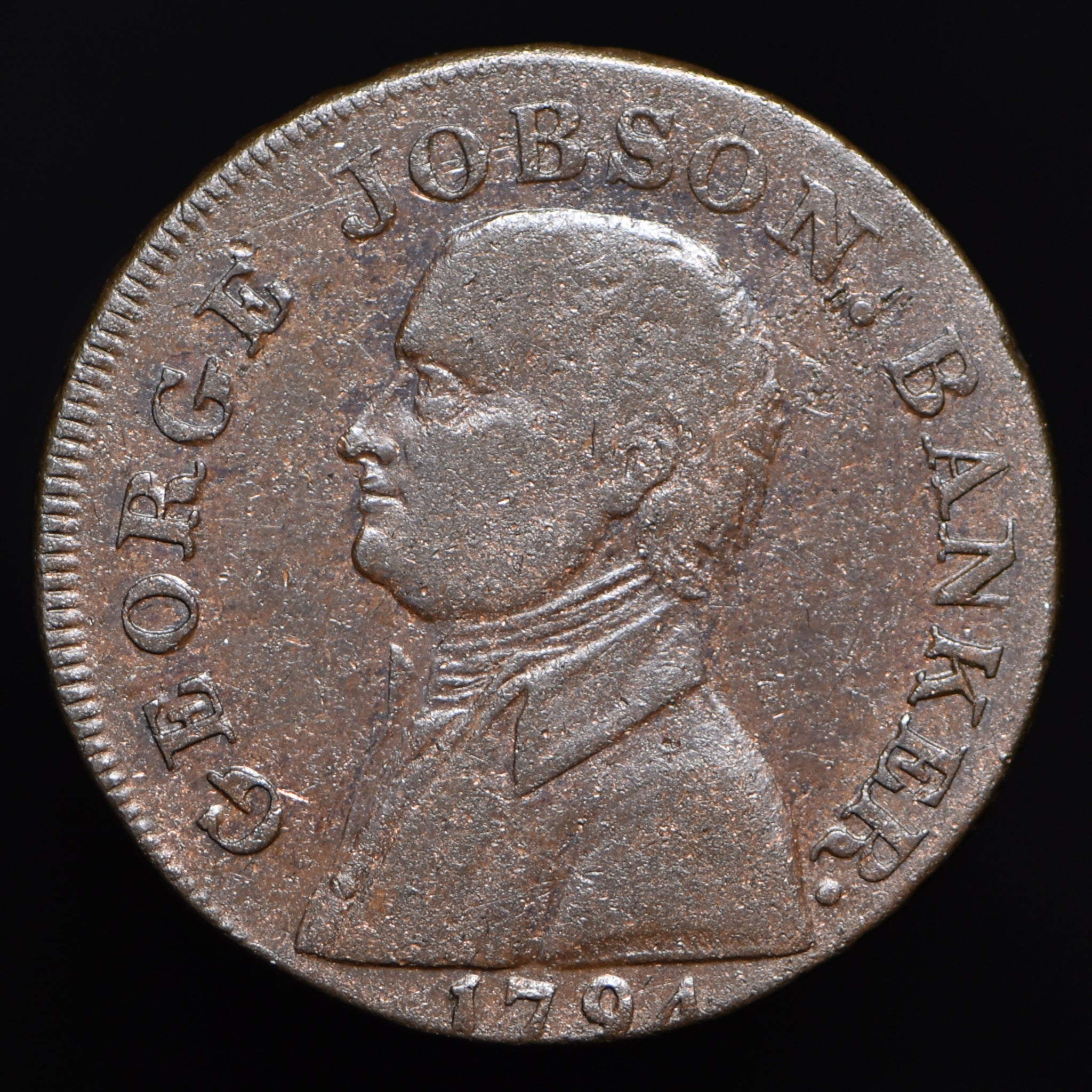 Obv: Bust to left, GEORGE JOBSON. BANKER. around, 1794 in exergue. Rev: A castle and a lion, MAY NORTHAMPTON FLOURISH. around. Edge: PAYABLE IN LANCASTER LONDON OR BRISTOL.