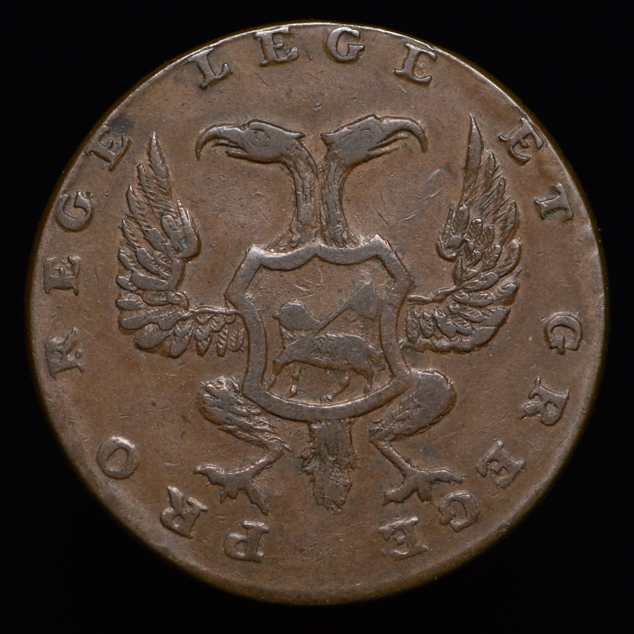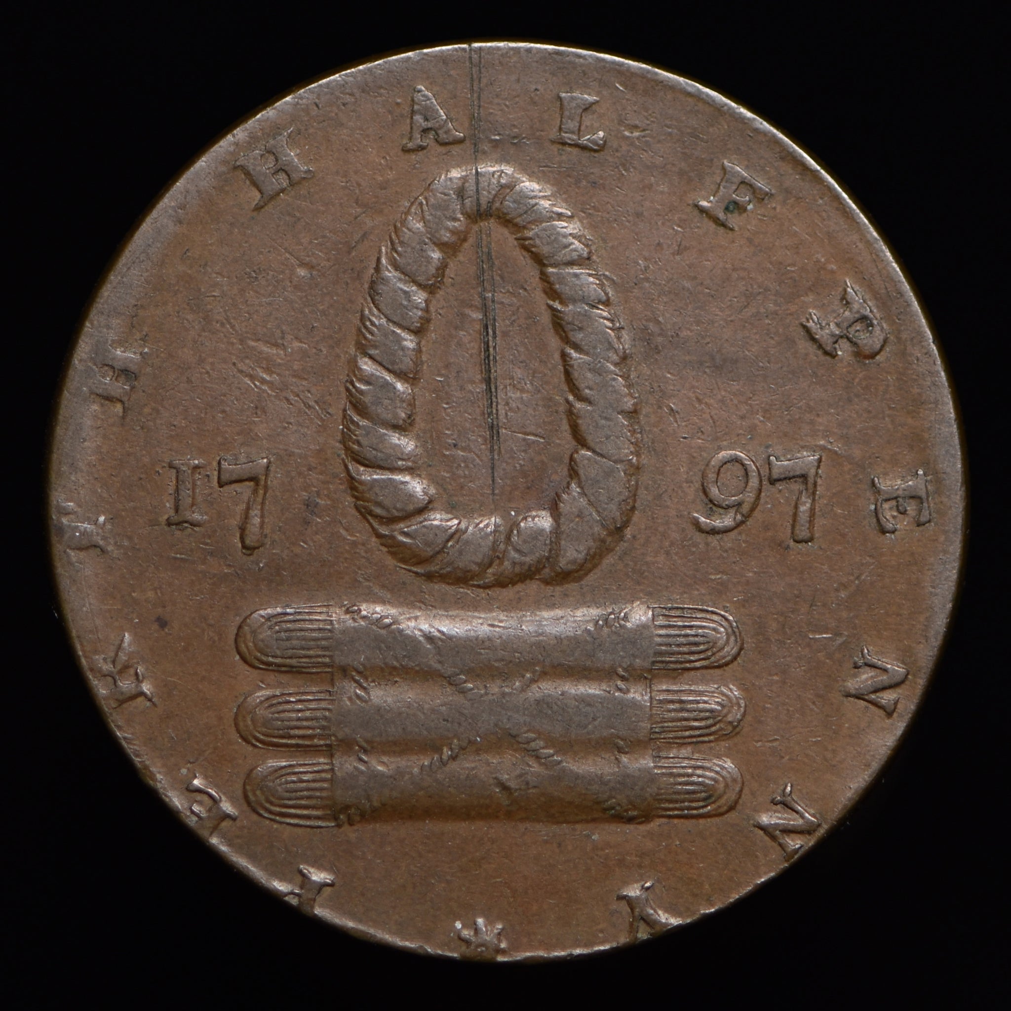 Obv: Hank of yarn and package of flax, dividing the date 17-97, PERTH HALFPENNY around. Rev: Arms of Perth, PRO REGE LEGE ET GREGE around. Edge: PAYABLE AT THE HOUSE OF PAT.K MAXWELL X X.