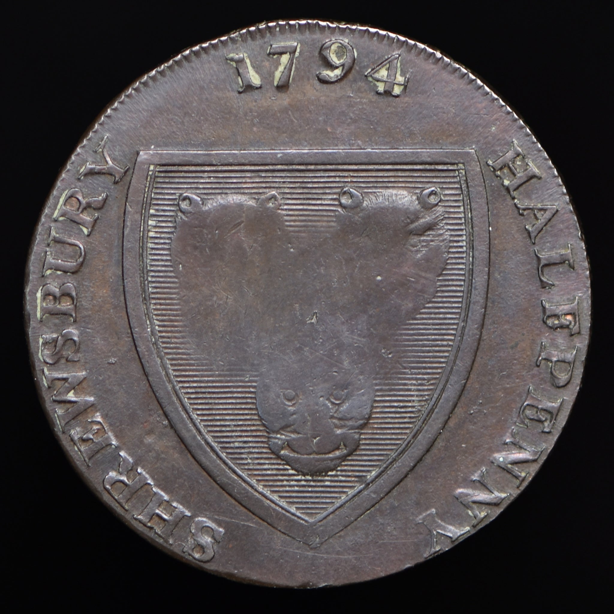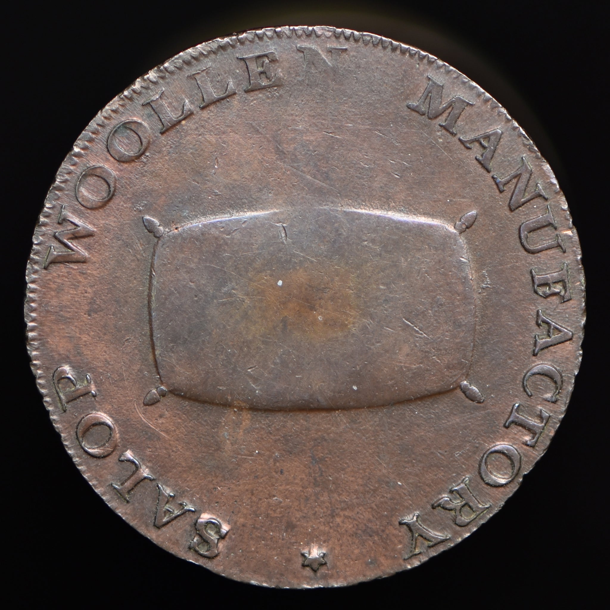 Obv: Shield of arms of the borough of Shrewsbury (three leopards), SHREWSBURY HALFPENNY around, 1794 above. Rev: A woolpack, SALOP WOOLLEN MANUFACTORY around. Edge: PAYABLE IN ANGLESEY LONDON OR LIVERPOOL.