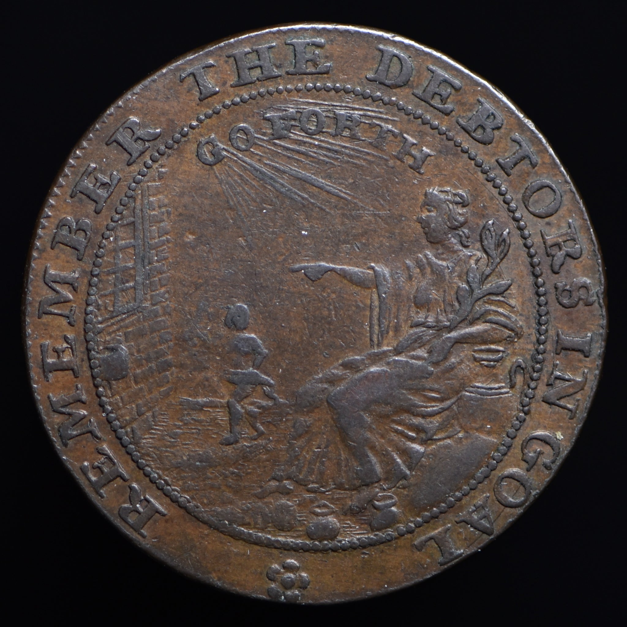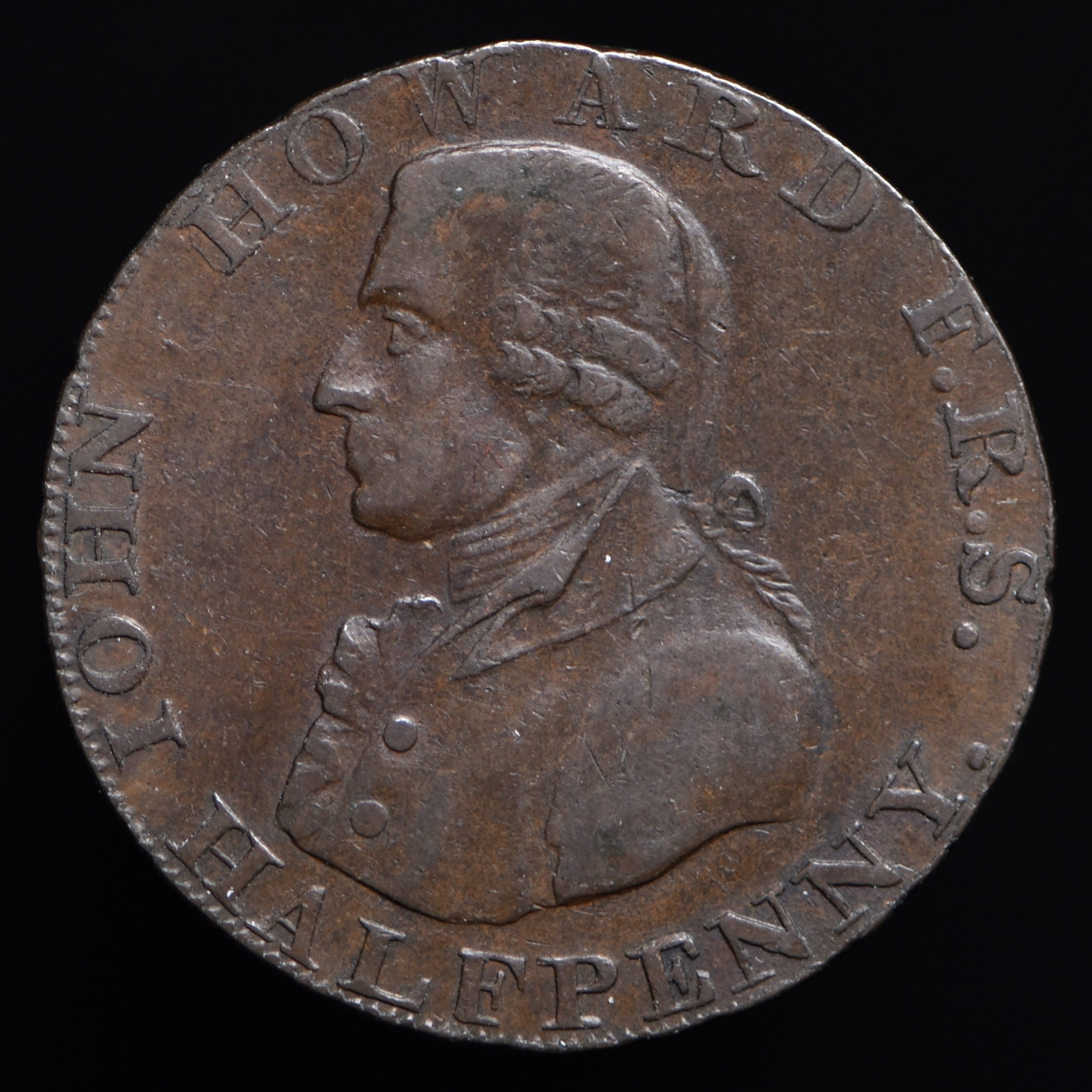 Obv: Bust of John Howard, IOHN HOWARD F.R.S. around, HALFPENNY. (below). Rev: Female seated instructing boy with key to unlock the prison doors, REMEMBER THE DEBTORS IN GOAL around. Edge: PAYABLE IN LANCASTER LONDON OR BRISTOL.