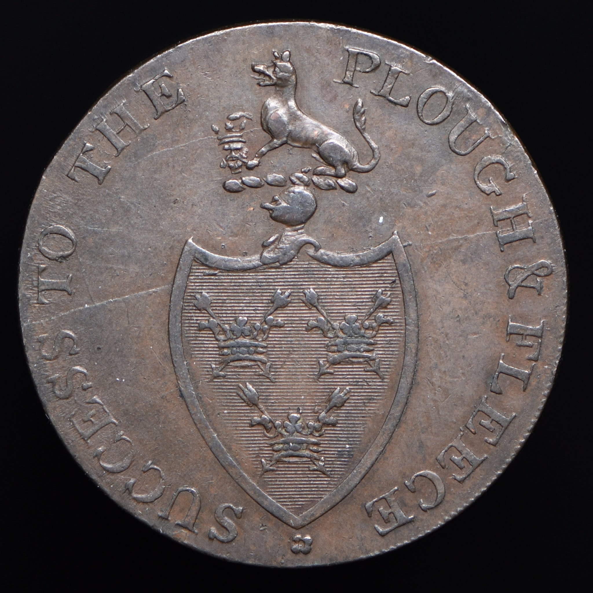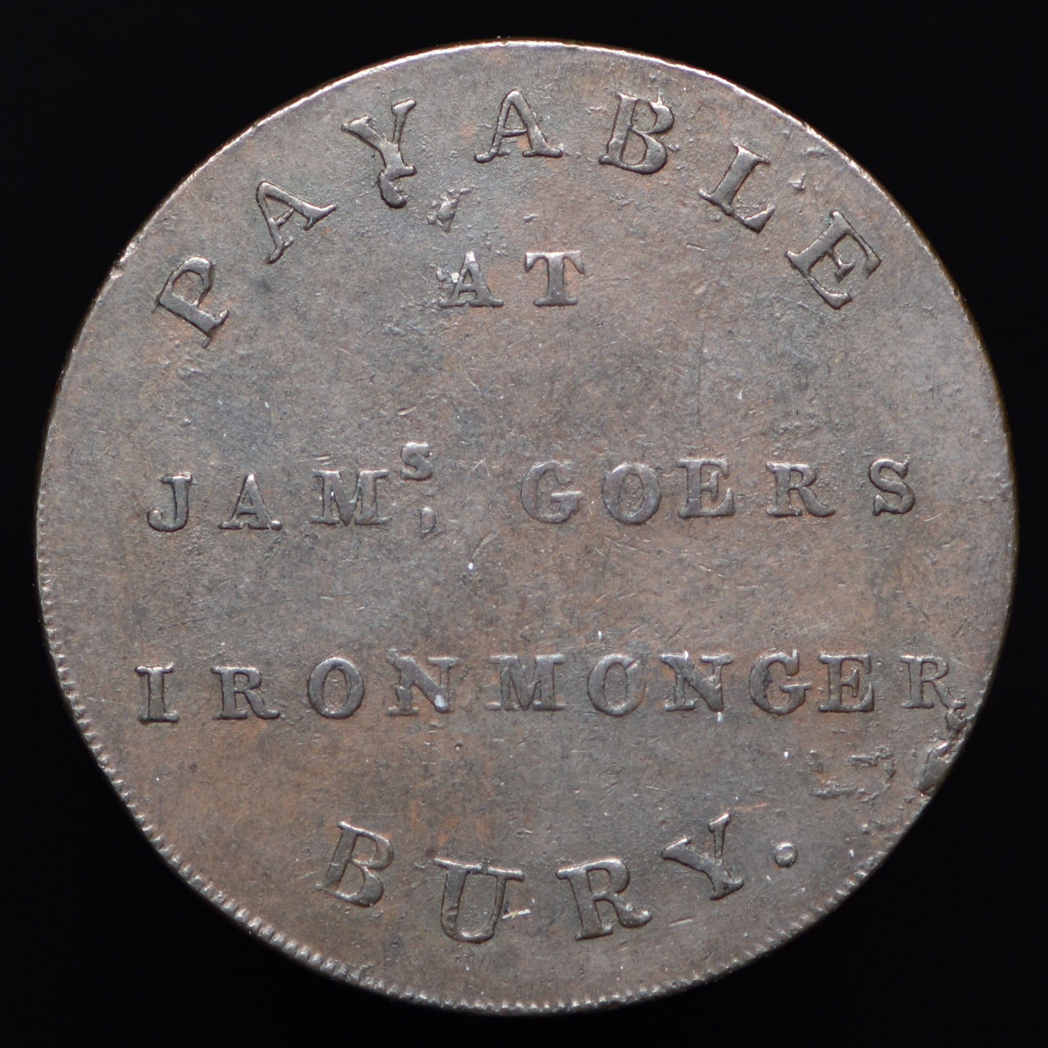 Obv: Arms of Bury, SUCCESS TO THE PLOUGH & FLEECE around. Rev: PAYABLE AT JAMS, GOERS IRONMONGER BURY . (around). Edge: Plain.