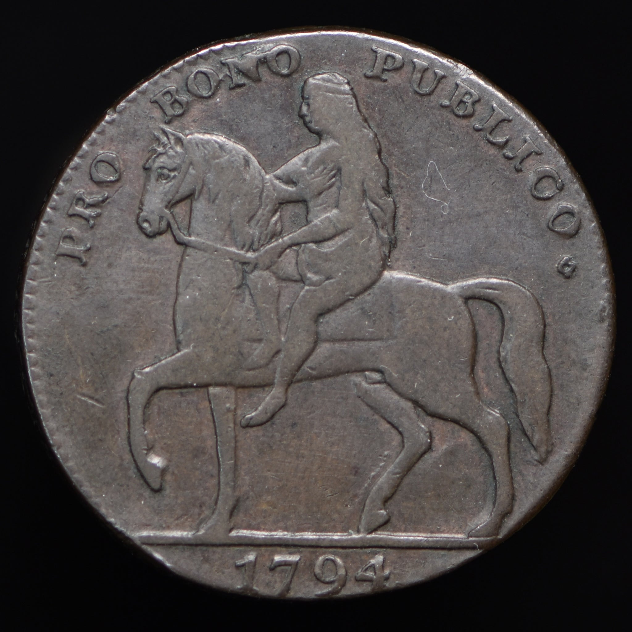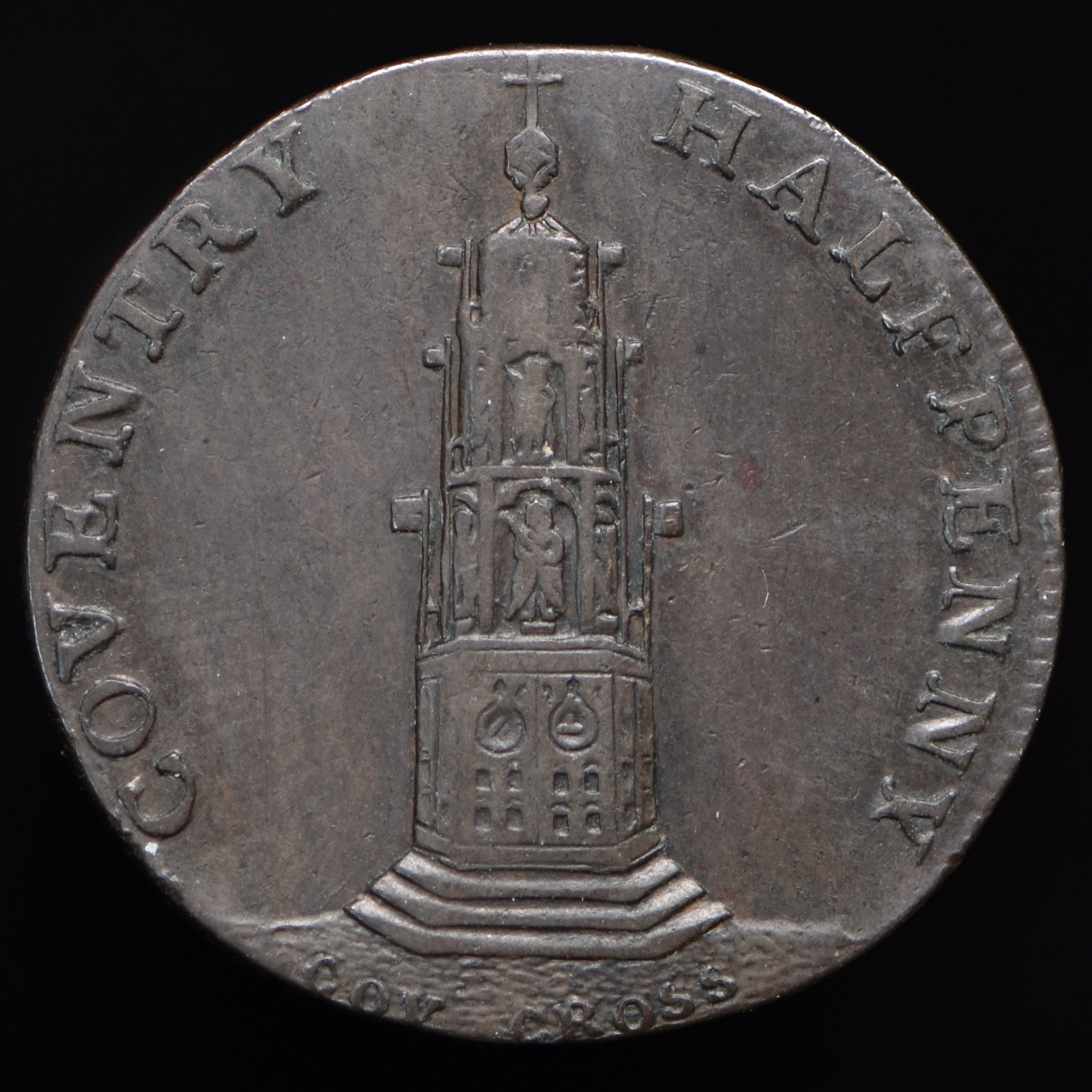 Obv: Lady Godiva riding naked on horseback, PRO BONO PUBLICO around, 1794 in exergue. Rev: An ancient cross, COVENTRY HALFPENNY around, COV CROSS below. Edge: PAYABLE AT THE WAREHOUSE OF ROBERT REYNOLDS & CO.