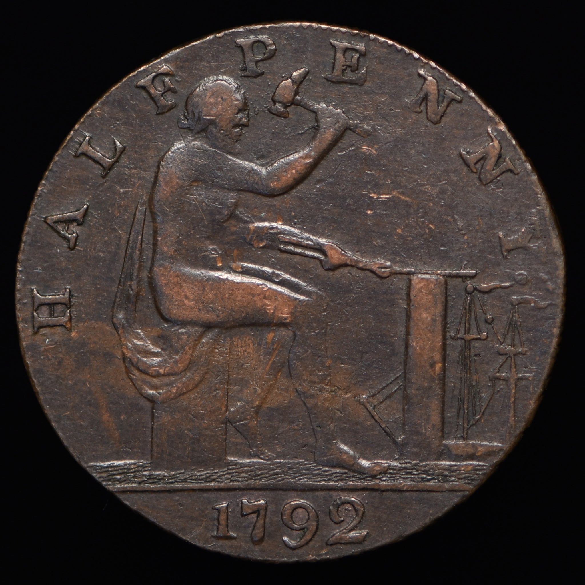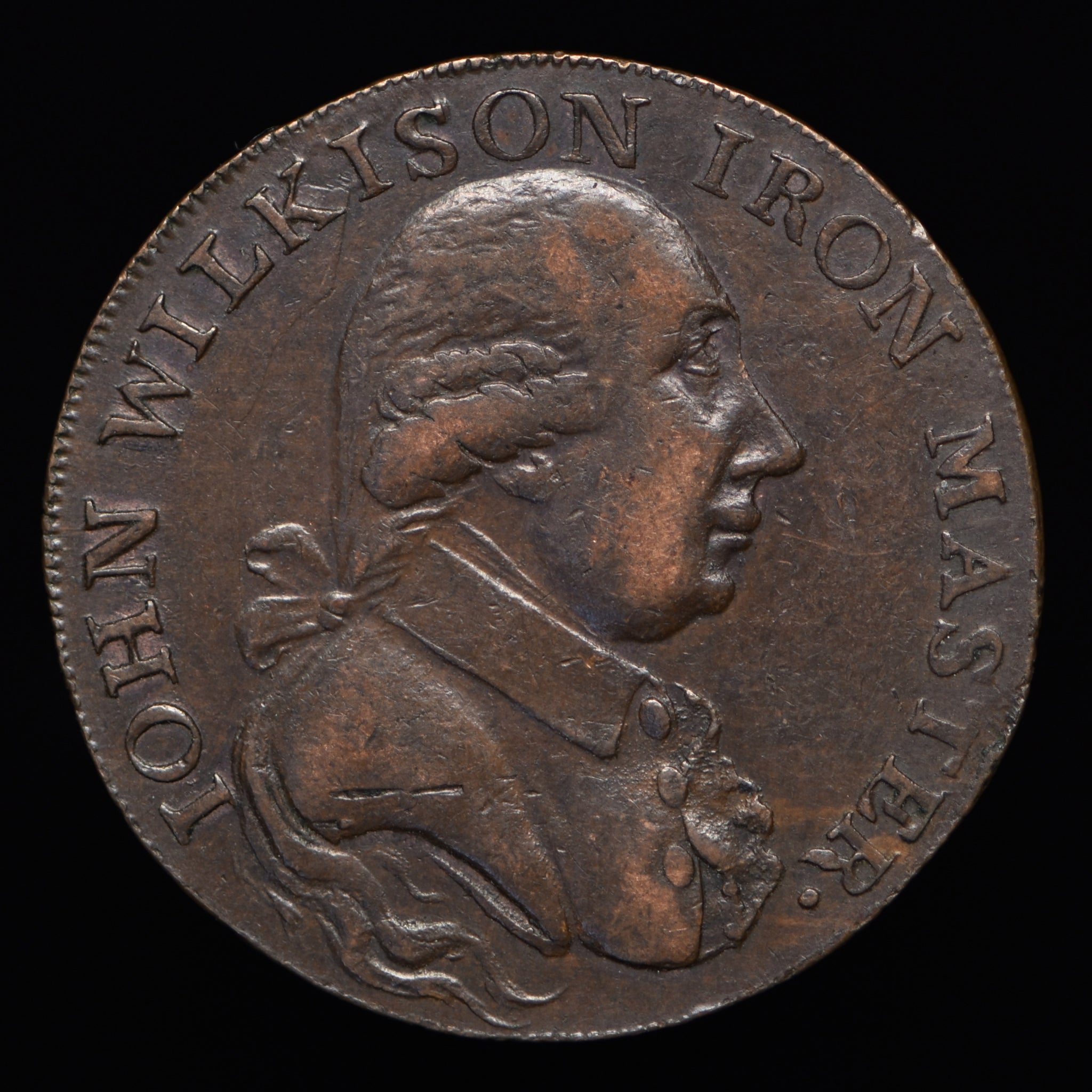 Obv: Bust of Wilkinson, IOHN WILKISON IRON MASTER. (around). Rev: Vulcan at forge, HALFPENNY . above, 1792 in exergue. Edge: PAYABLE X AT X CRONEBANE X OR X IN X DUBLIN.