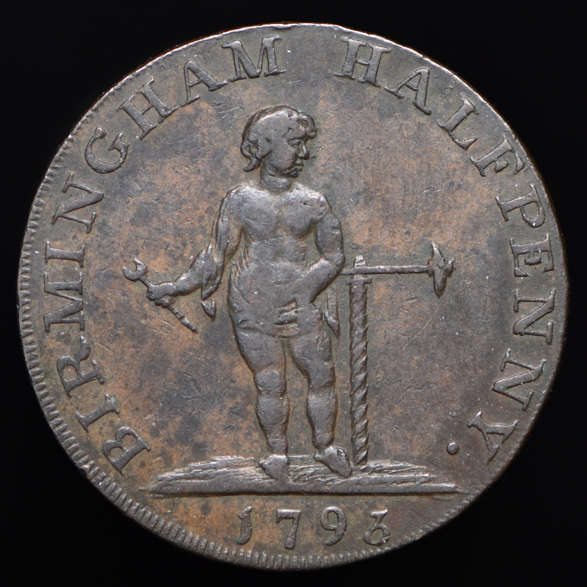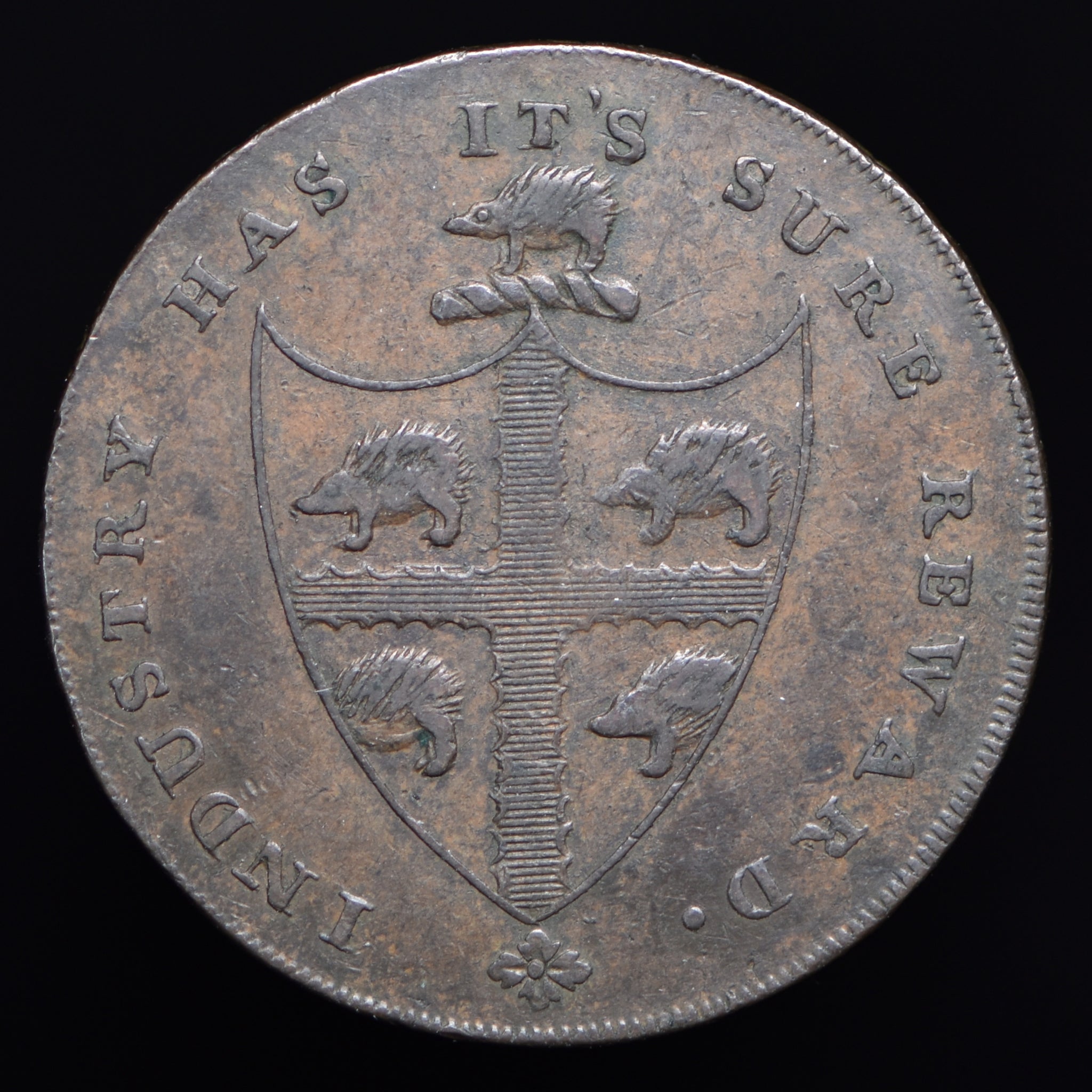 Obv: Figure of a boy, BIRMINGHAM HALFPENNY around, 1793 in exergue. Rev: Shield of arms bearing four hedgehogs, crest a hedgehog, INDUSTRY HAS IT’S SURE REWARD. (around). Edge: CURRENT EVERY WHERE.