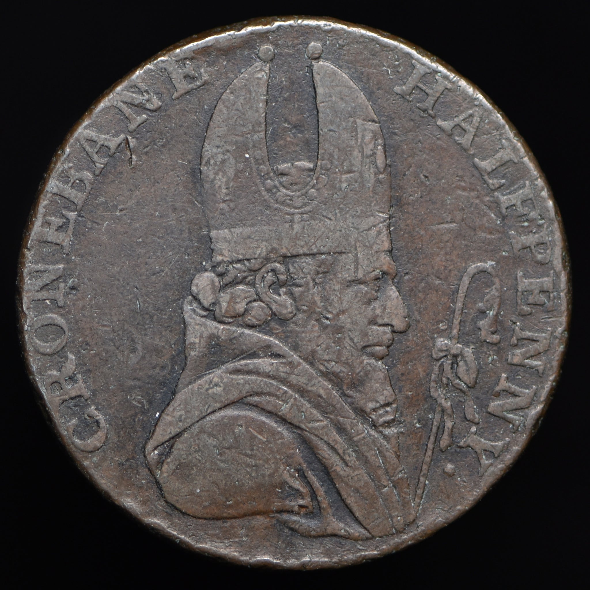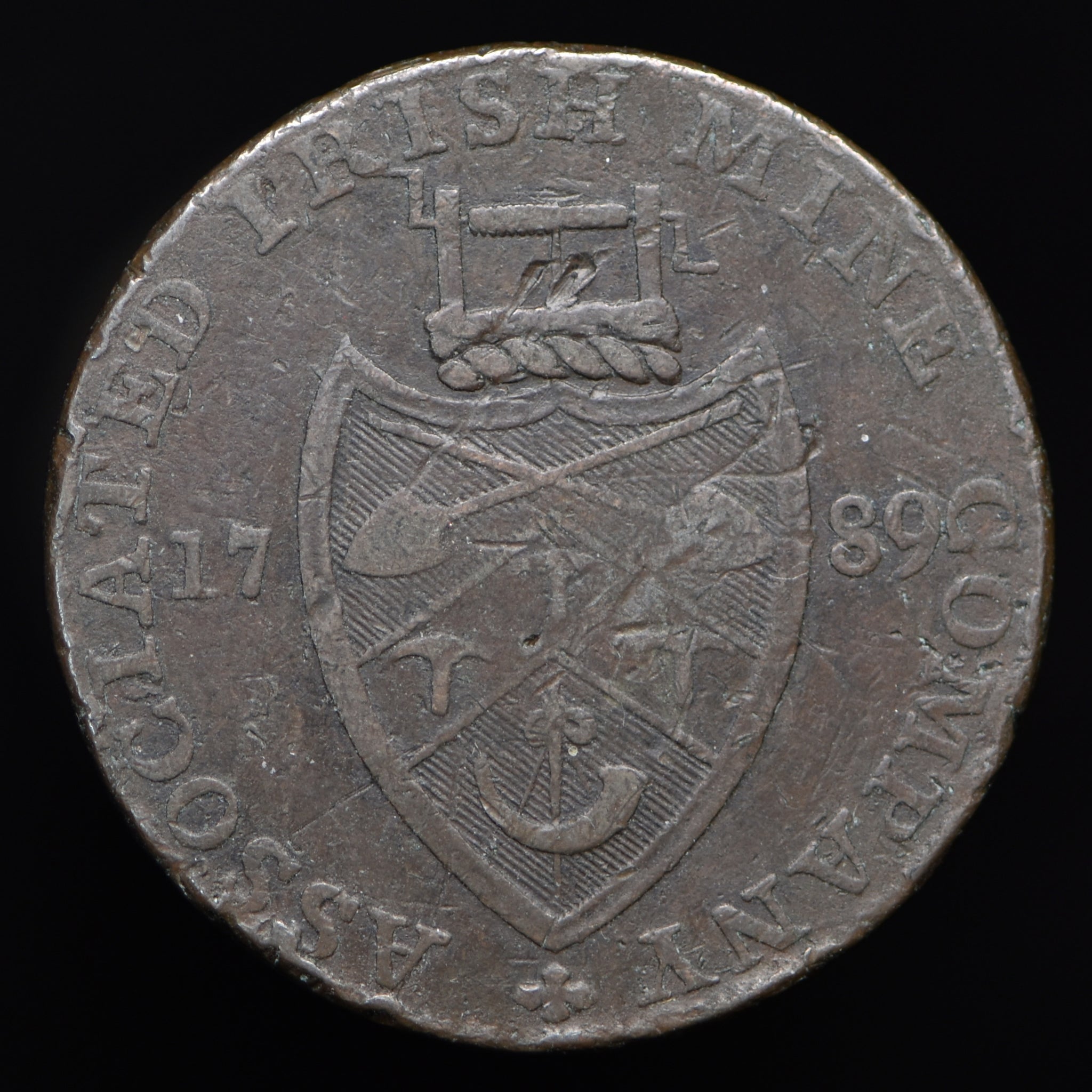 Obv: Bishop in profile, CRONEBANE HALFPENNY around. Rev: Shield of arms, crest a windlass, ASSOCIATED IRISH MINE COMPANY around, 17-89 split by shield. Edge: PAYABLE AT CRONEBANE LODGE OR IN DUBLIN X.
