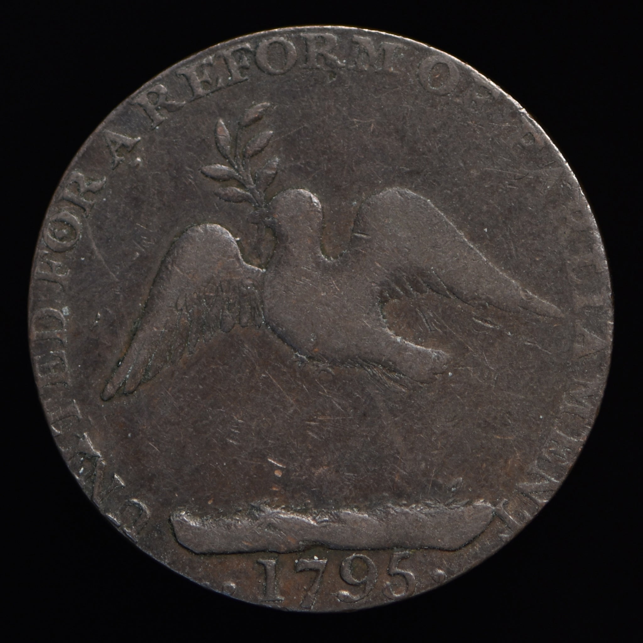 Obv: Shield of arms, crest a windlass, ASSOCIATED IRISH MINERS ARMS around. Rev: Dove with olive branch, UNITED FOR A REFORM OF PARLIAMENT around, 1795 in exergue. Edge: Plain.