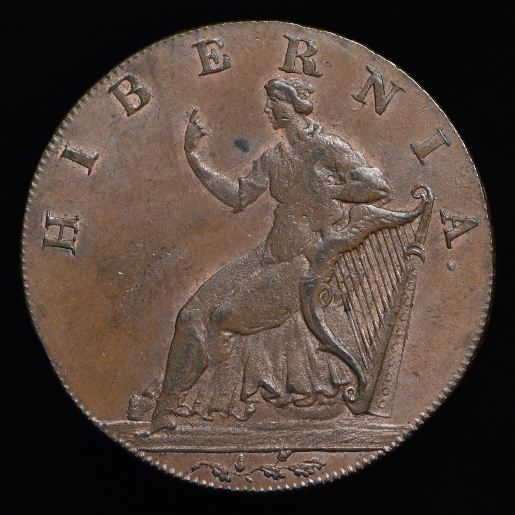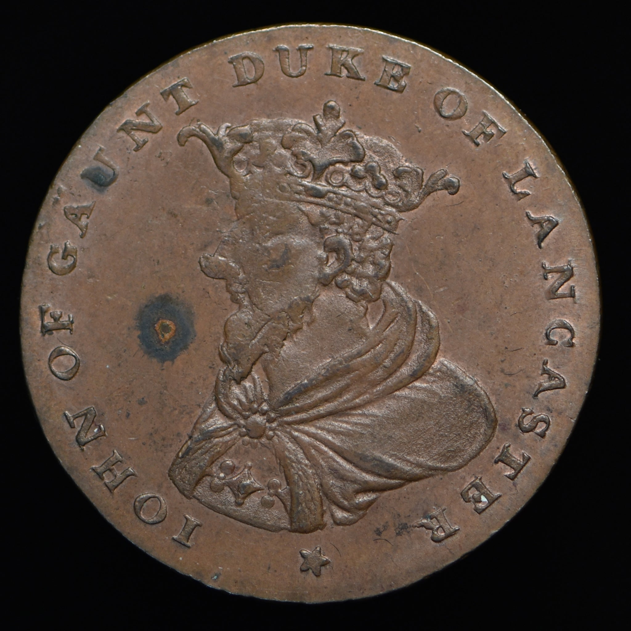 Obv: Female seated with harp, HIBERNIA. around. Rev: Crowned bust facing left, IOHN OF GAUNT DUKE OF LANCASTER. Edge: CURRENT EVERY WHERE.