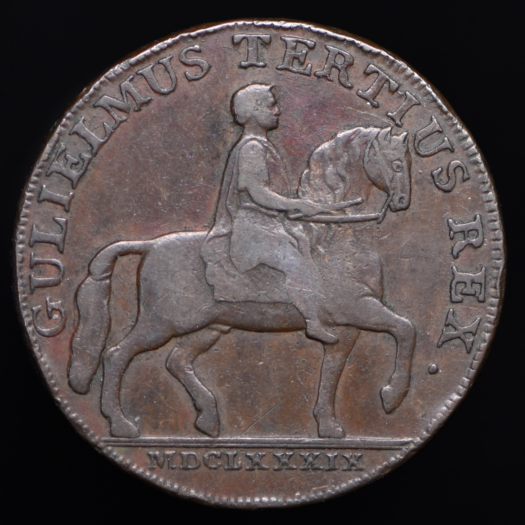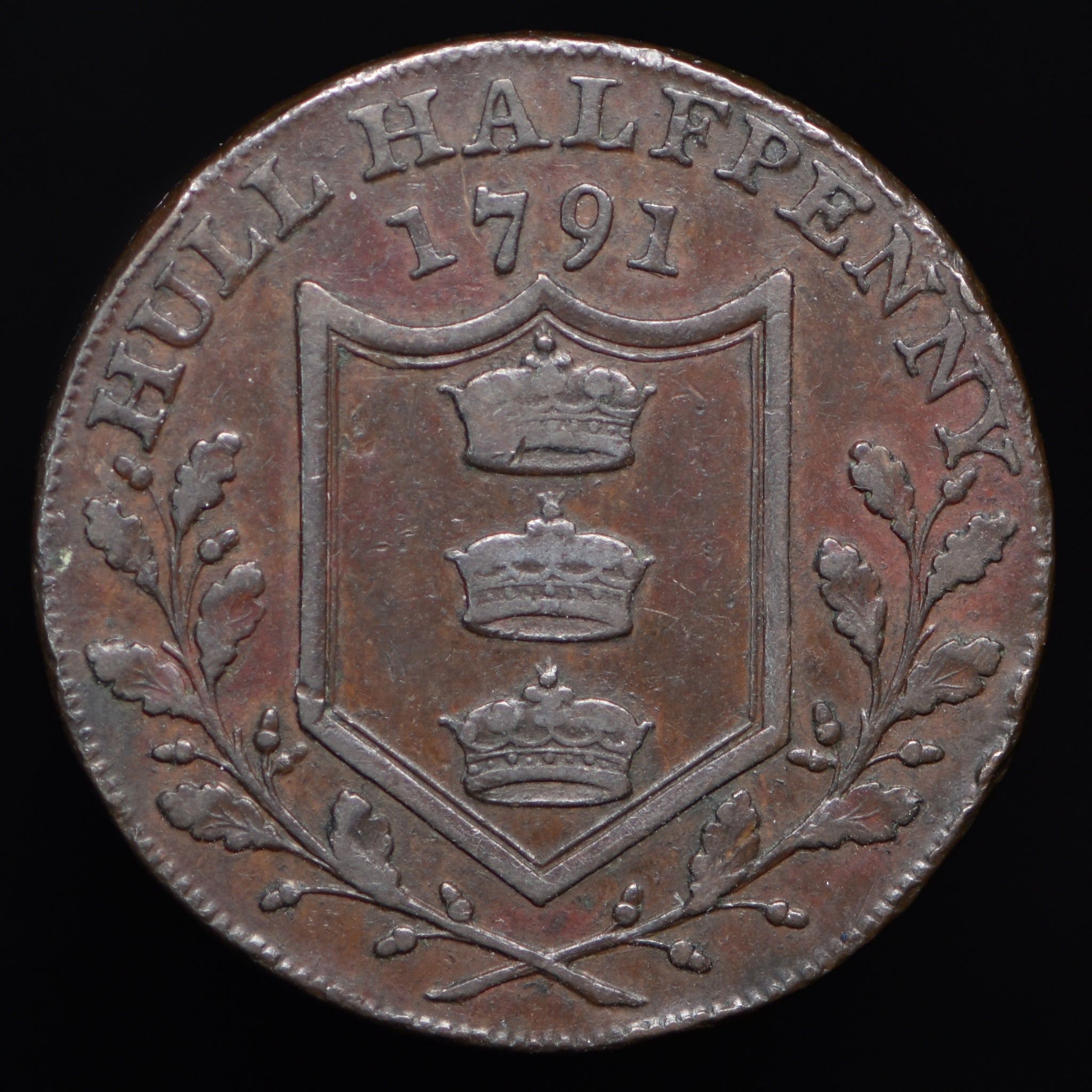 Obv: Equestrian statue of William III, GULIELMUS TERTIUS REX. (around), MDCLXXXIX in exergue. Rev: Shield of arms, HULL HALFPENNY above, 1791 above, oak wreath surrounding shield of arms. Edge: PAYABLE AT THE WAREHOUSE OF IONATHAN GARTON & CO. . X .