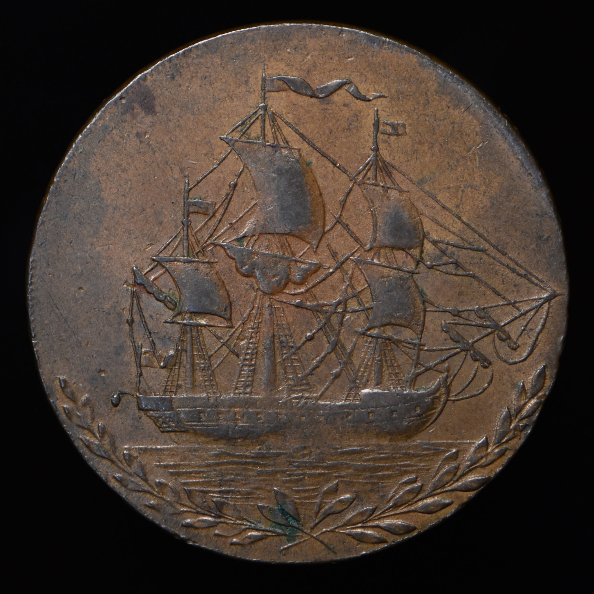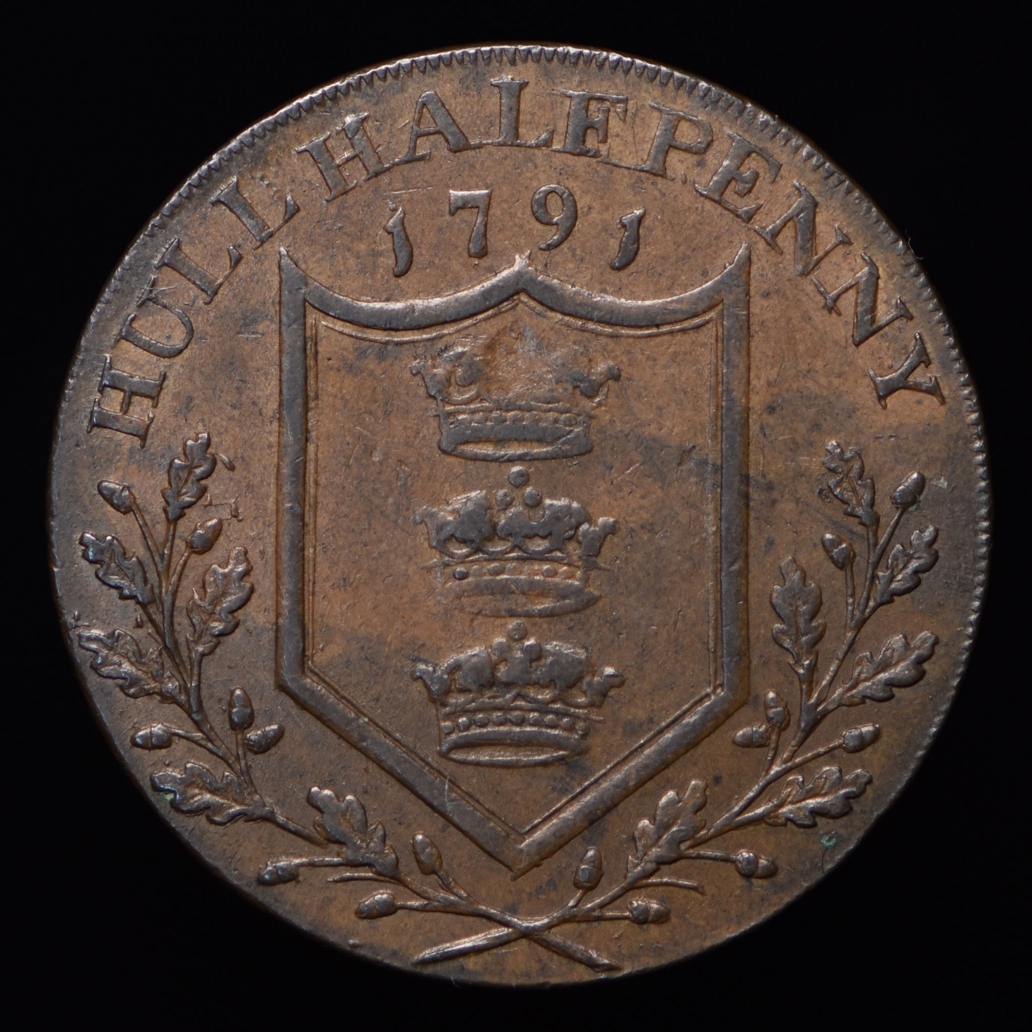Obv: Shield of arms between oak sprigs, HULL HALFPENNY 1791 above. Rev: Ship sailing, sprig of leaves below. Edge; PAYABLE IN HULL AND IN LONDON.