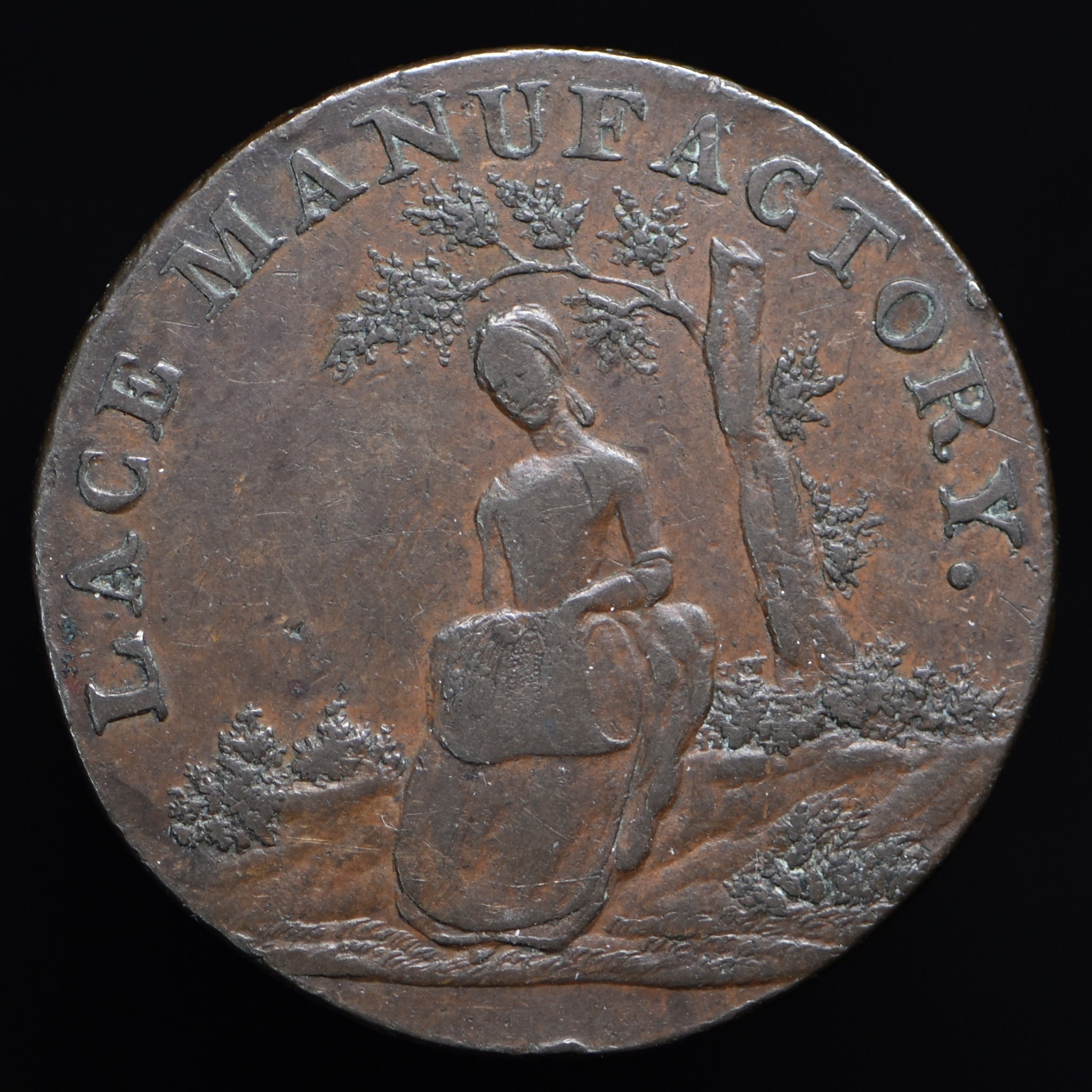 Obv: Girl making lace next to tree, LACE MANUFACTORY. (around). Rev: A Lamb, BERKHAMSTEAD OR LONDON PAY AT LEIGHTON around, 1794 under lamb. Edge: CHAMBERS, LANGSTON HALL & CO.