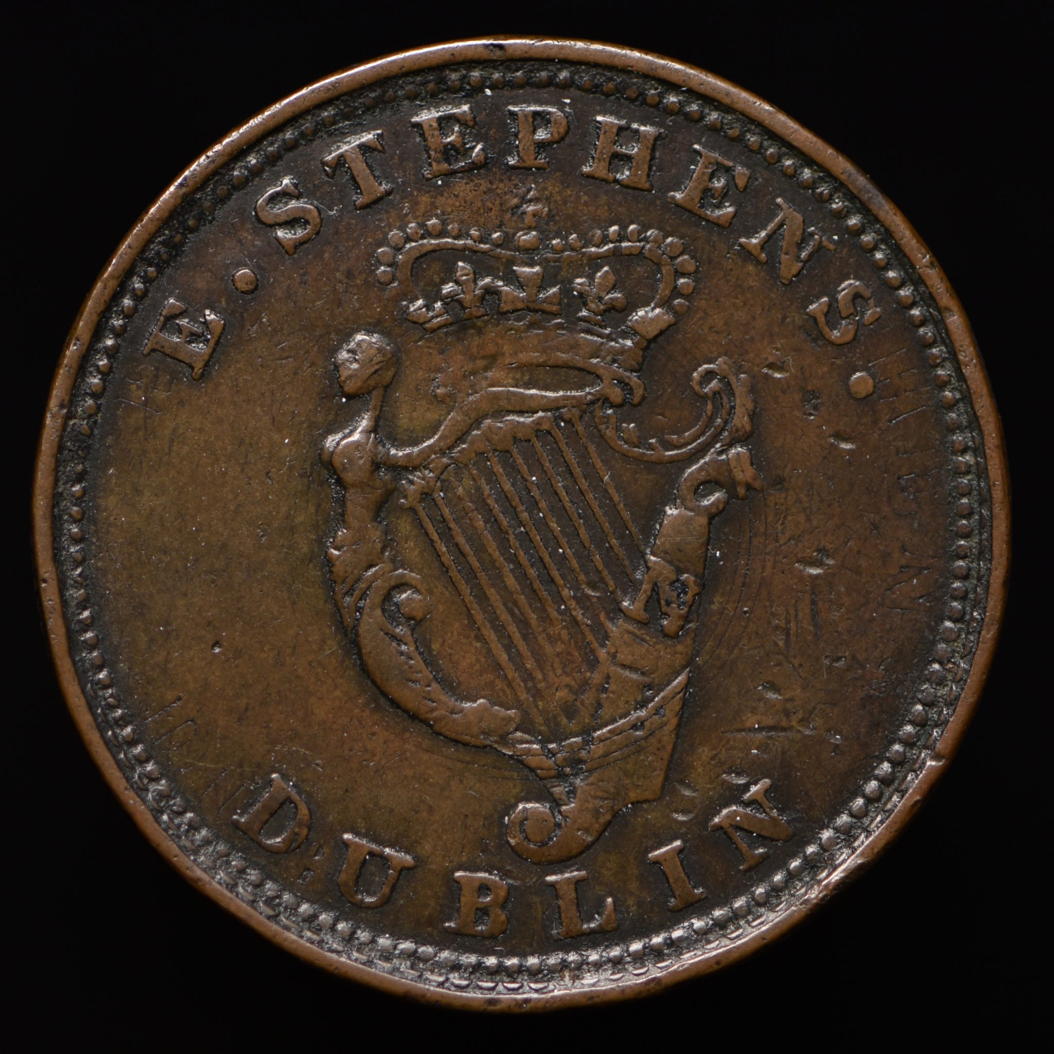 Obv: Bust facing left, WELLINGTON & ERIN GO BRAGH around, 1814 below. Rev: Crowned harp, E. STEPHENS. (above), DUBLIN below. Edge: Center grained.