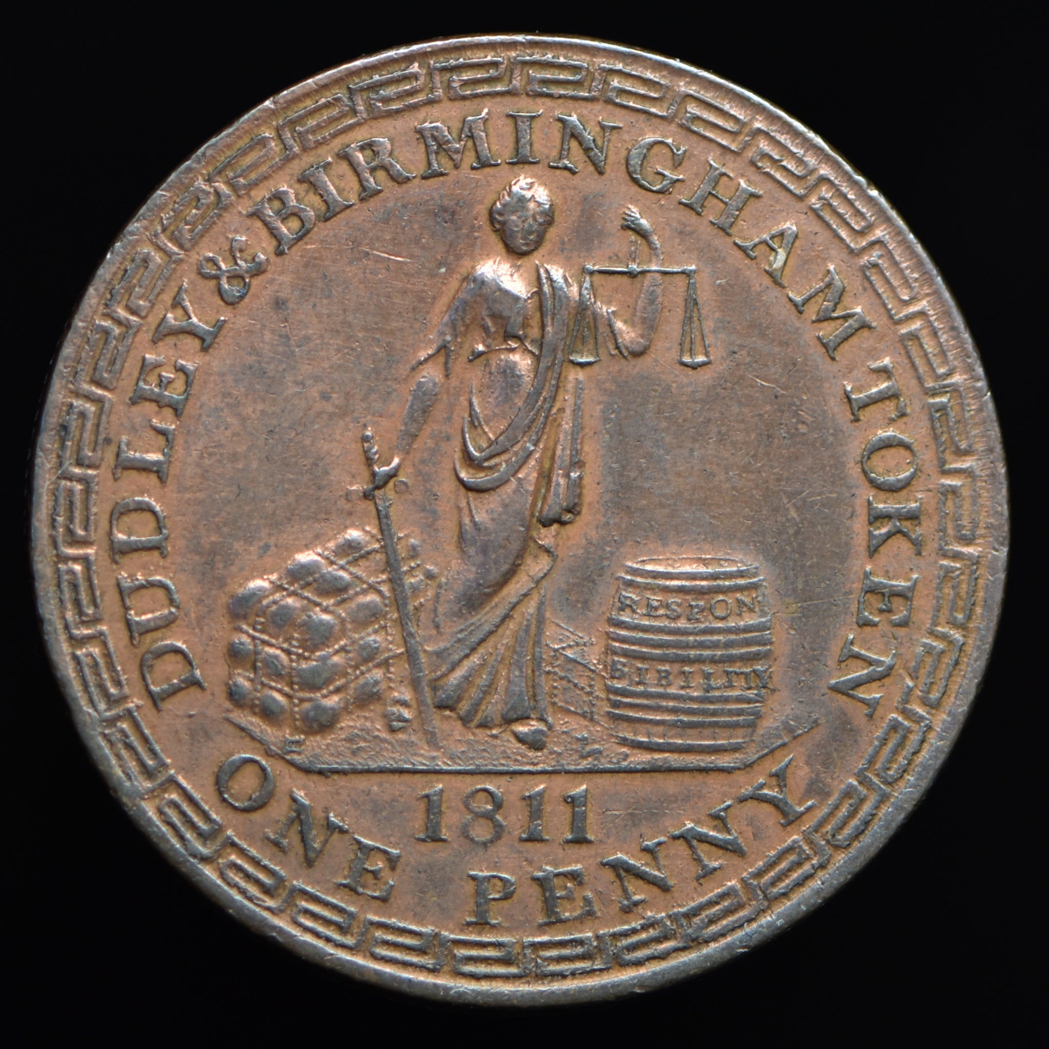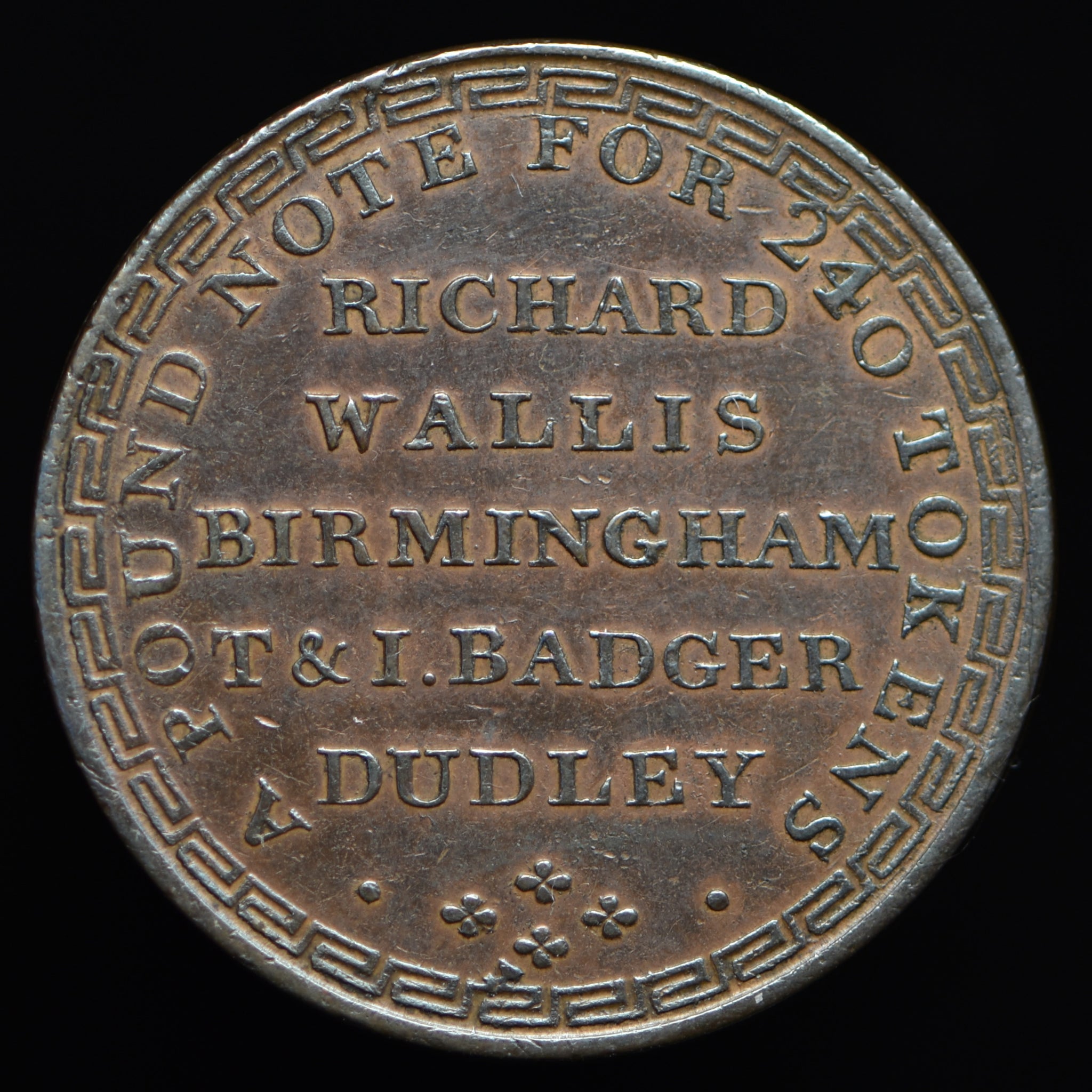 Obv: RICHARD WALLIS BIRMINGHAM T & I. BADGER DUDLEY in five lines center, A POUND NOTE FOR 240 TOKENS around, all within a meander pattern border. Rev: Justice standing between a bale and cask, DUDLEY & BIRMINGHAM TOKEN around, 1811 ONE PENNY in exergue, all within a meander pattern border. Edge: Center grained.