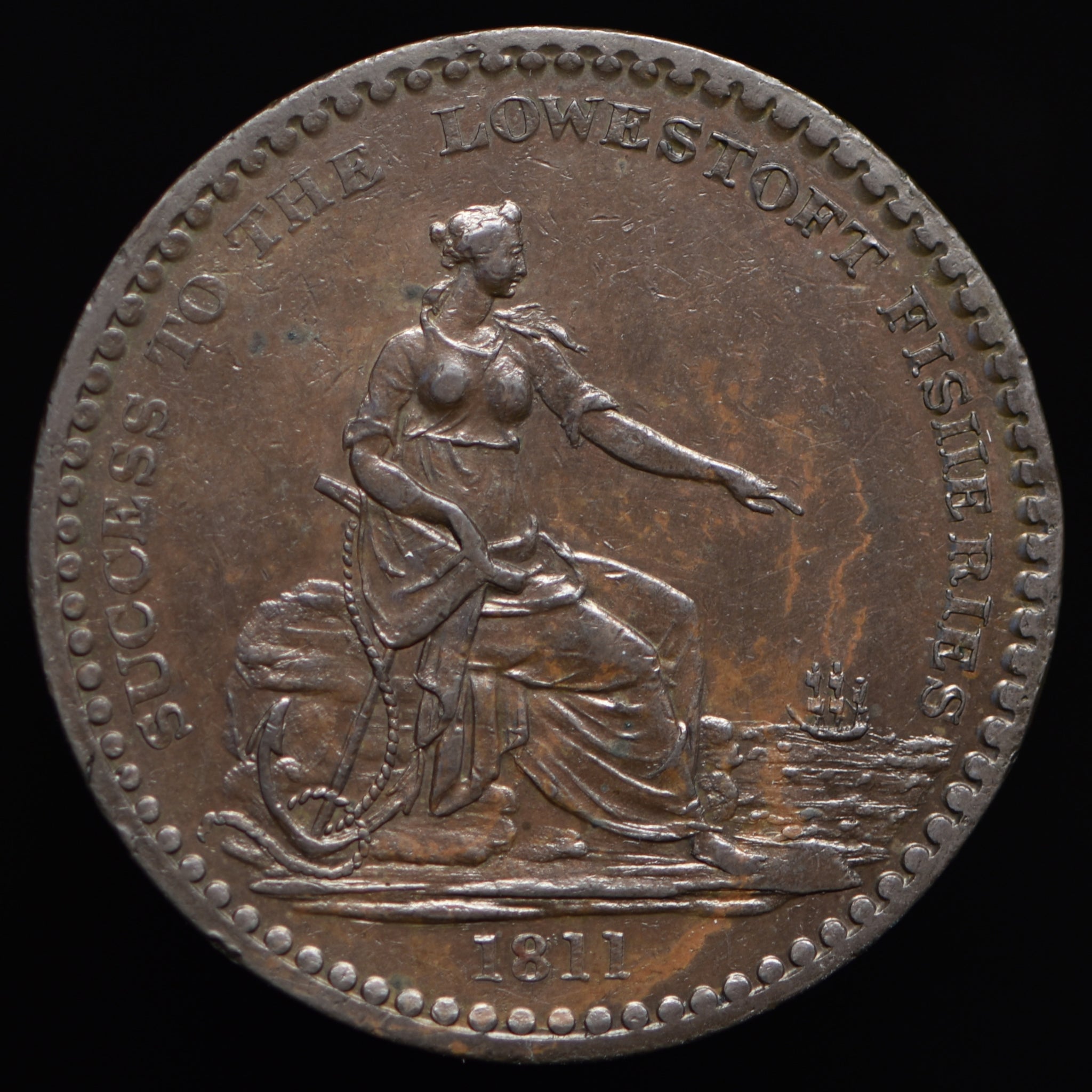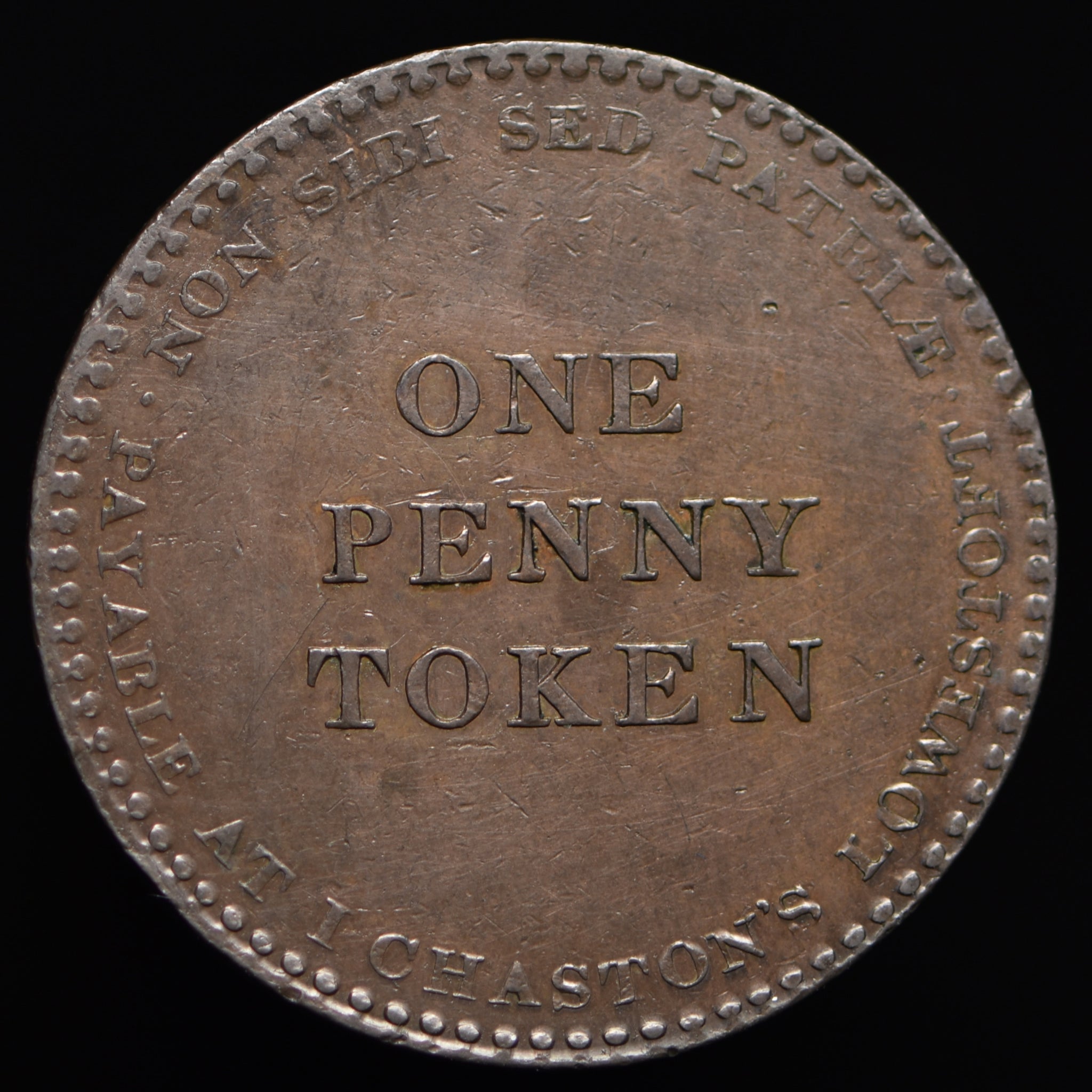 Obv: ONE PENNY TOKEN in three lines in center, NON SIBI SED PATRIAE above, PAYABLE AT I CHASTON’S LOWESTOFT below. Rev: Hope seated on rock, resting arm on an anchor, a ship in the distance, SUCCESS TO THE LOWESTOFT FISHERIES around, 1811 in exergue. Edge: Center grained.