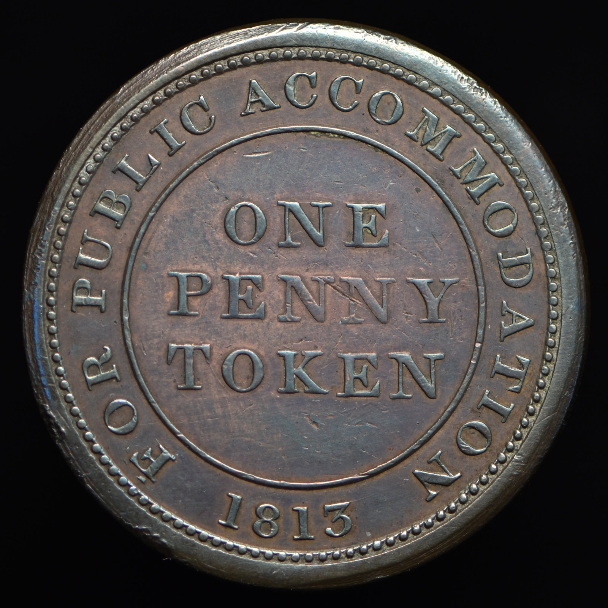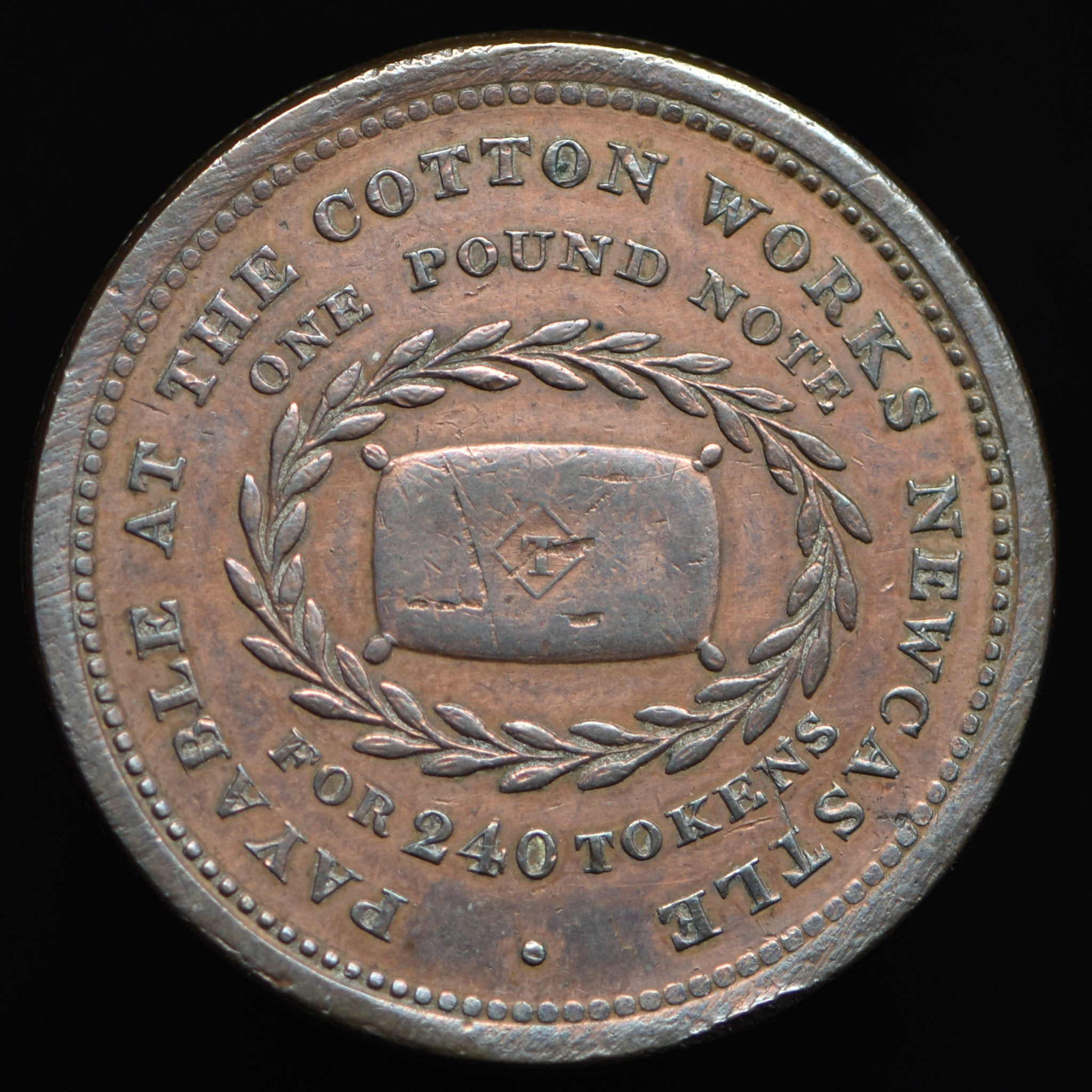Obv: Bale of cotton surrounded by wreath of laurel inscribed with letter T, PAYABLE AT THE COTTON WORKS NEWCASTLE ONE POUND NOTE FOR 240 TOKENS around in two lines. Rev: ONE PENNY TOKEN in center circle, FOR PUBLIC ACCOMMODATION around, 1813 below. Edge: Center grained.