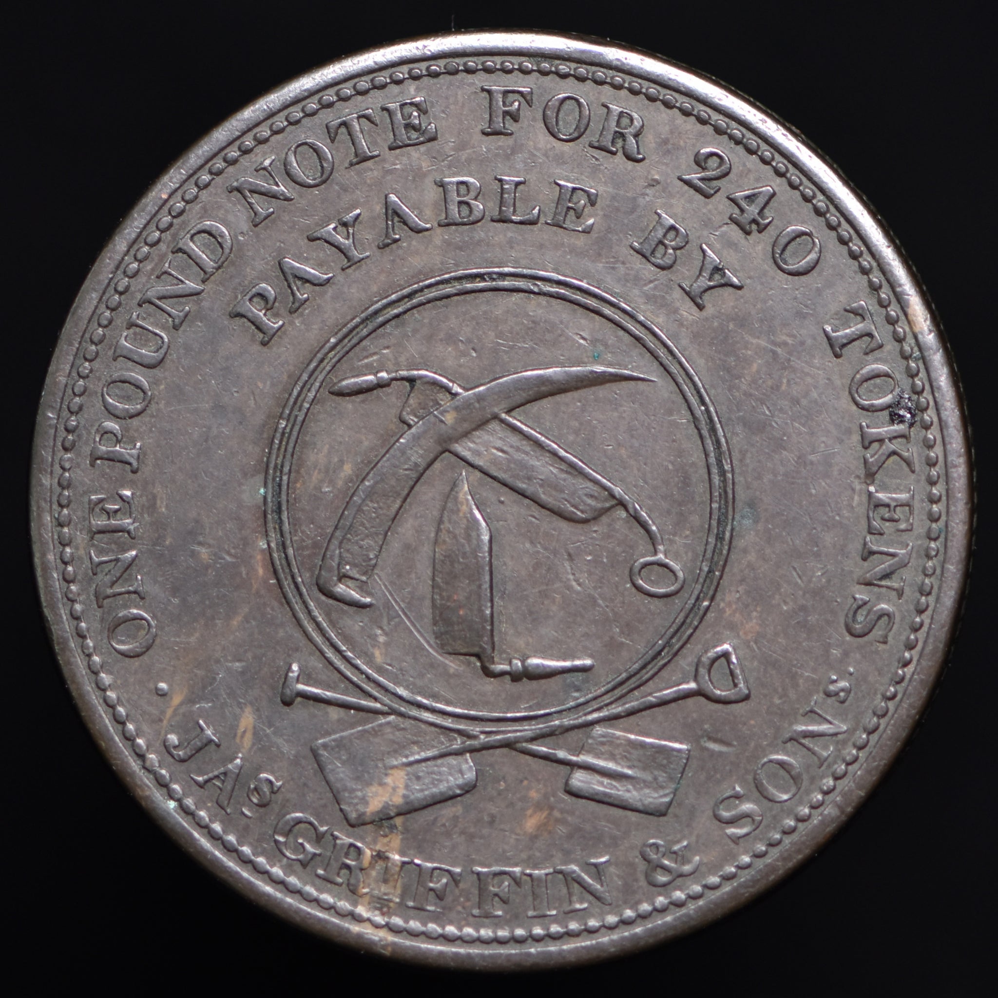 Obv: View of a forge and drop hammers, WITHYMOOR SCYTHE WORKS on label above, ONE PENNY 1813 in exergue. Rev: A scythe and hay and straw cutting knives in center double circle, crossed spades below, ONE POUND NOTE FOR 240 TOKENS PAYABLE BY JAS GRIFFIN & SONS around. Edge: Center grained.